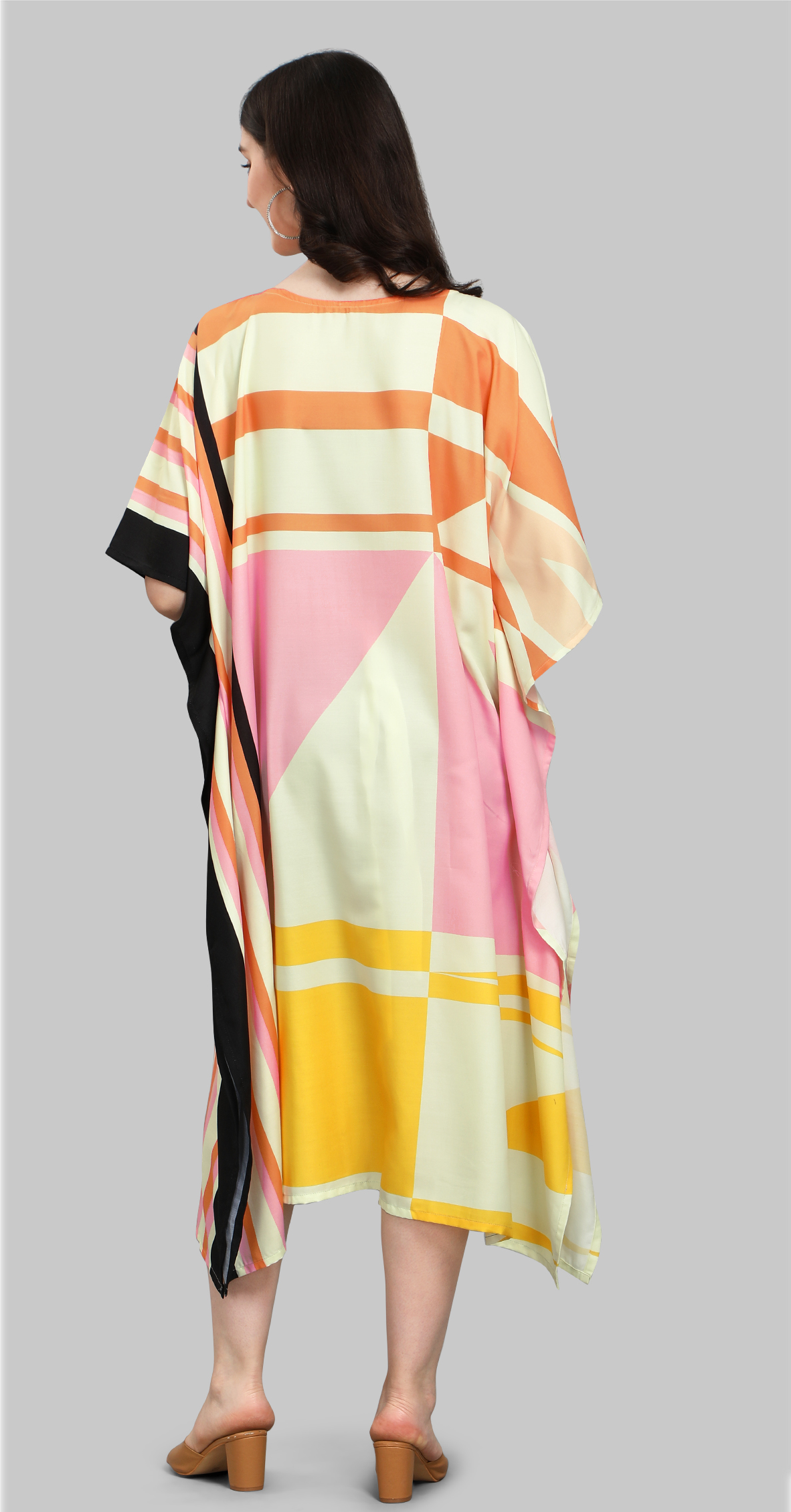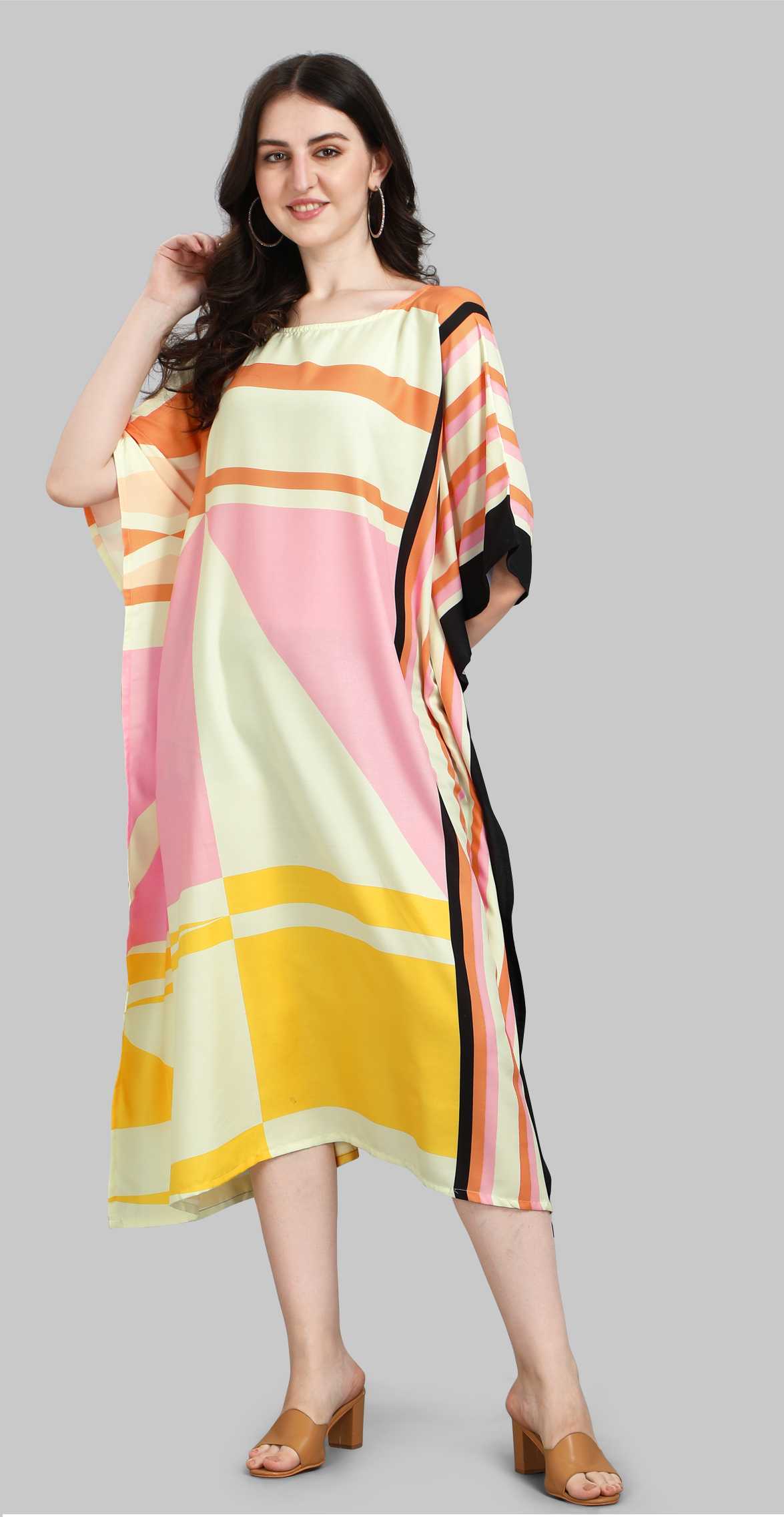 The Amber Haze Kaftan hums with the warmth of fading light. Sunset tones ripple softly across its frame, capturing that golden hour calm when time seems to pause. Light, fluid, and endlessly graceful — a garment that feels like holding onto the last glow of day.