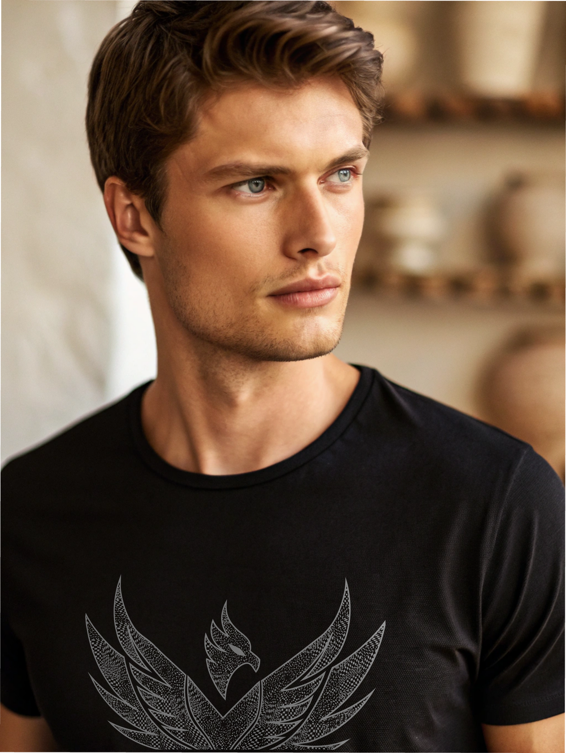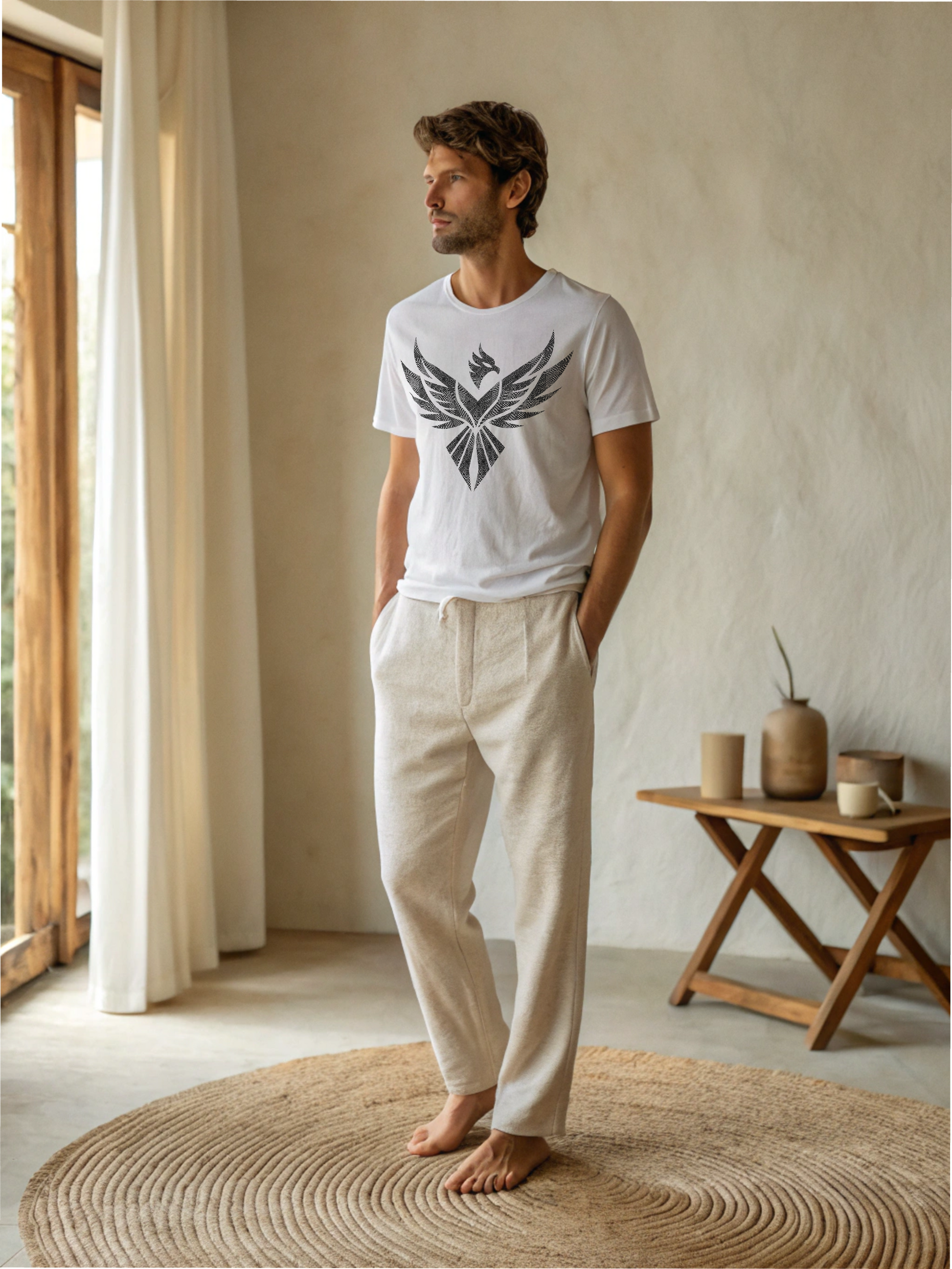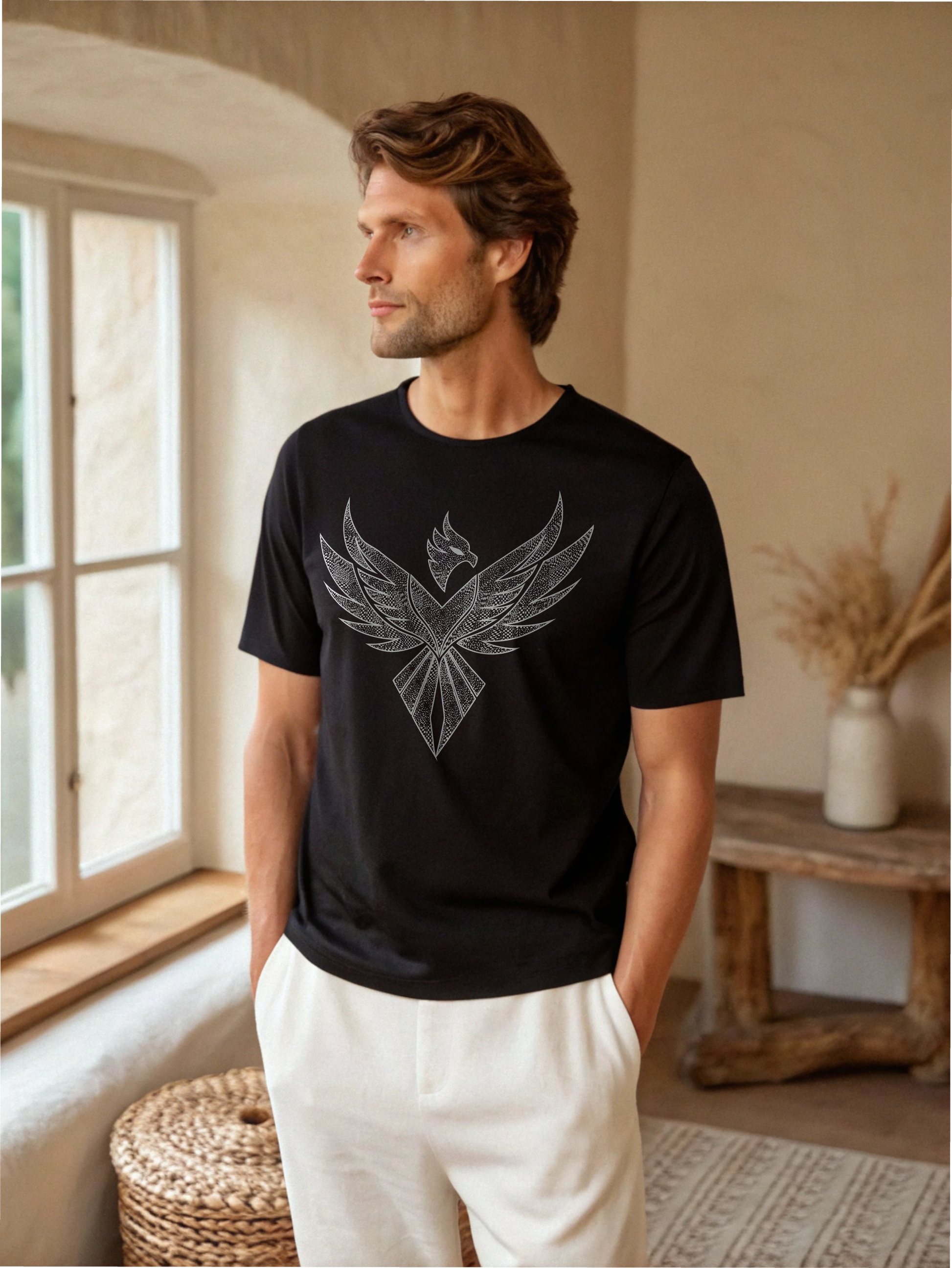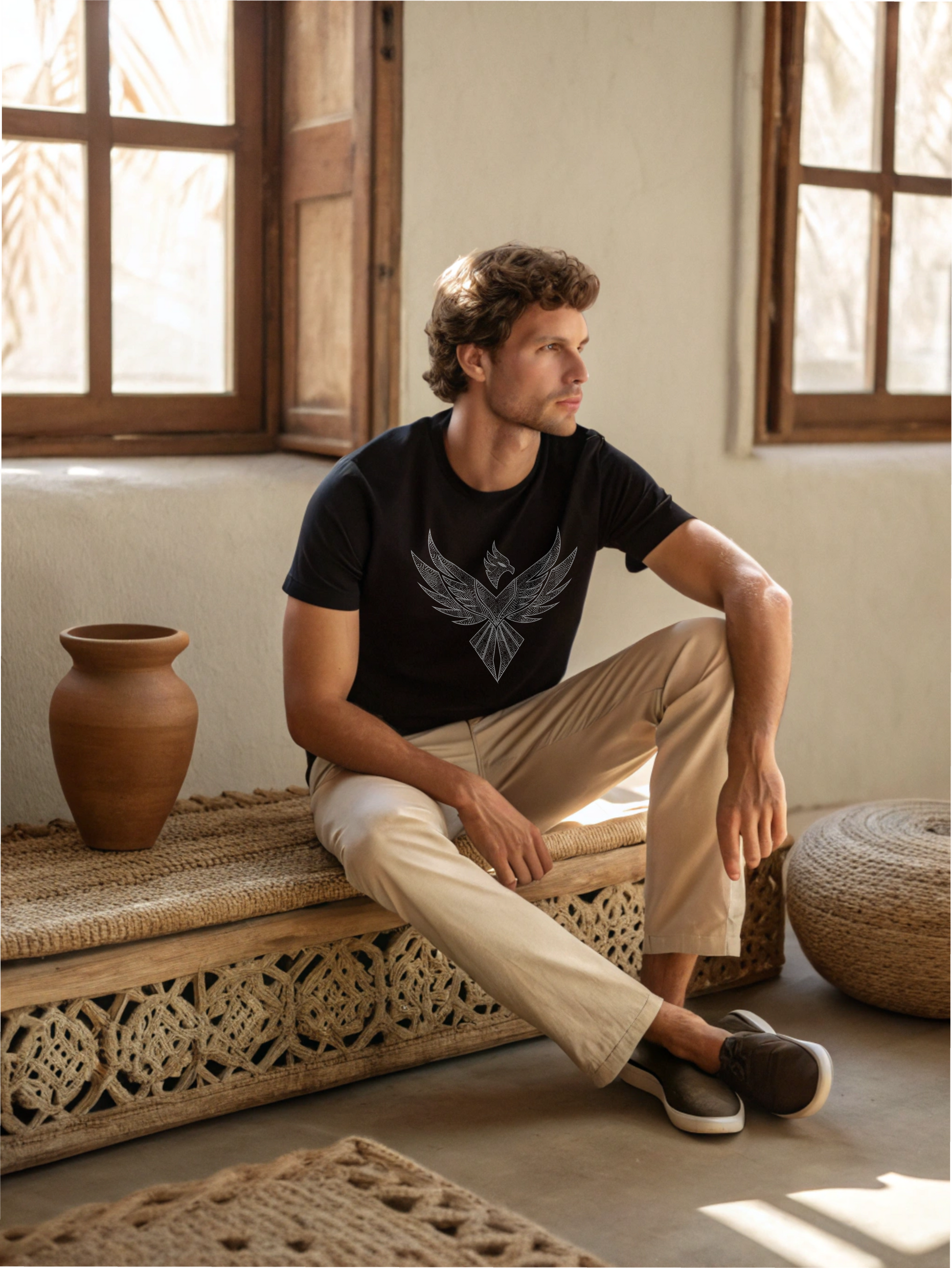 This crisp white tee carries a phoenix — drawn in fine, meditative lines. Rising with clarity and grace, it speaks of rebirth, not rage. For the man who’s been tested and tempered, who understands that real strength is shaped in silence.