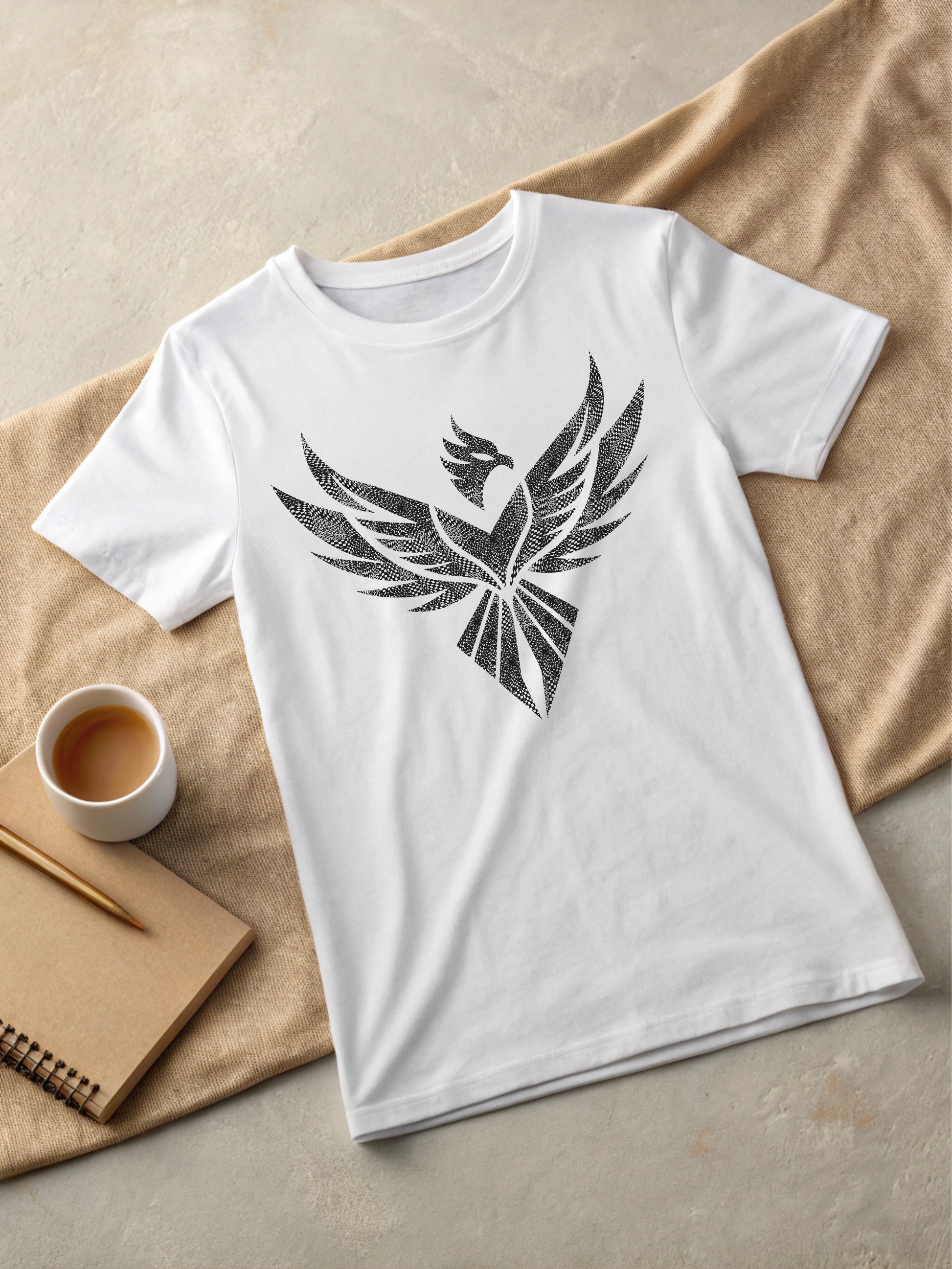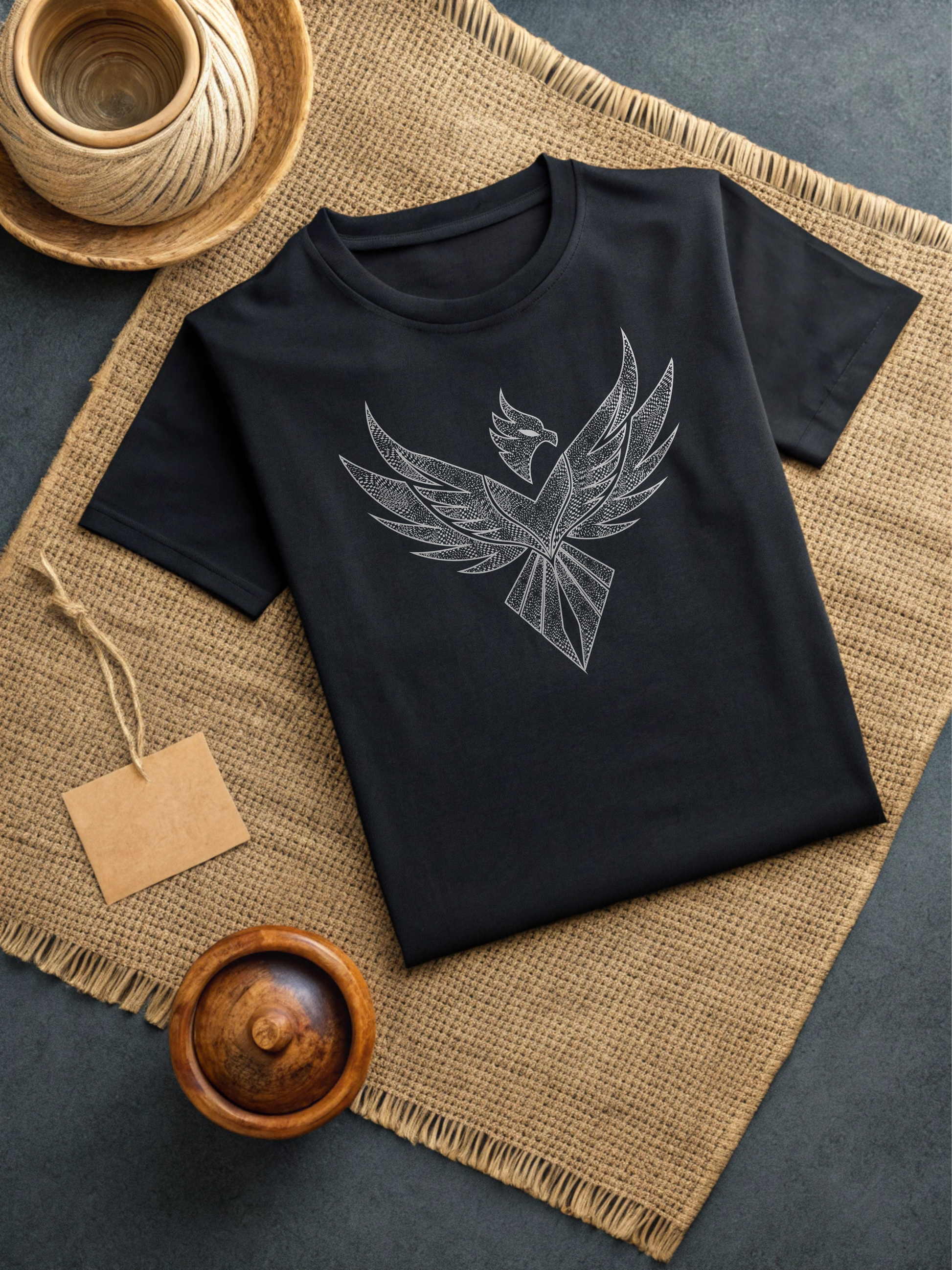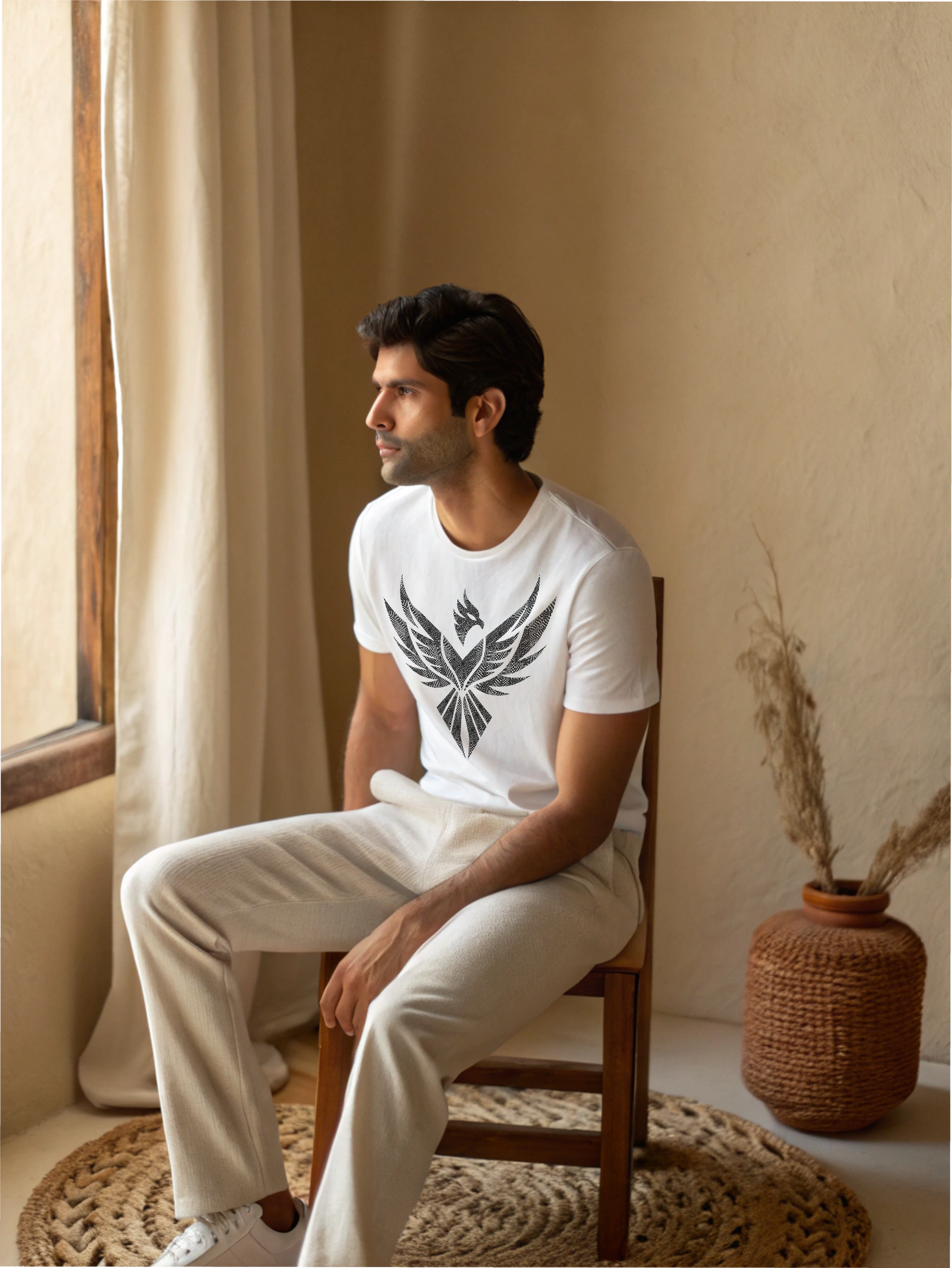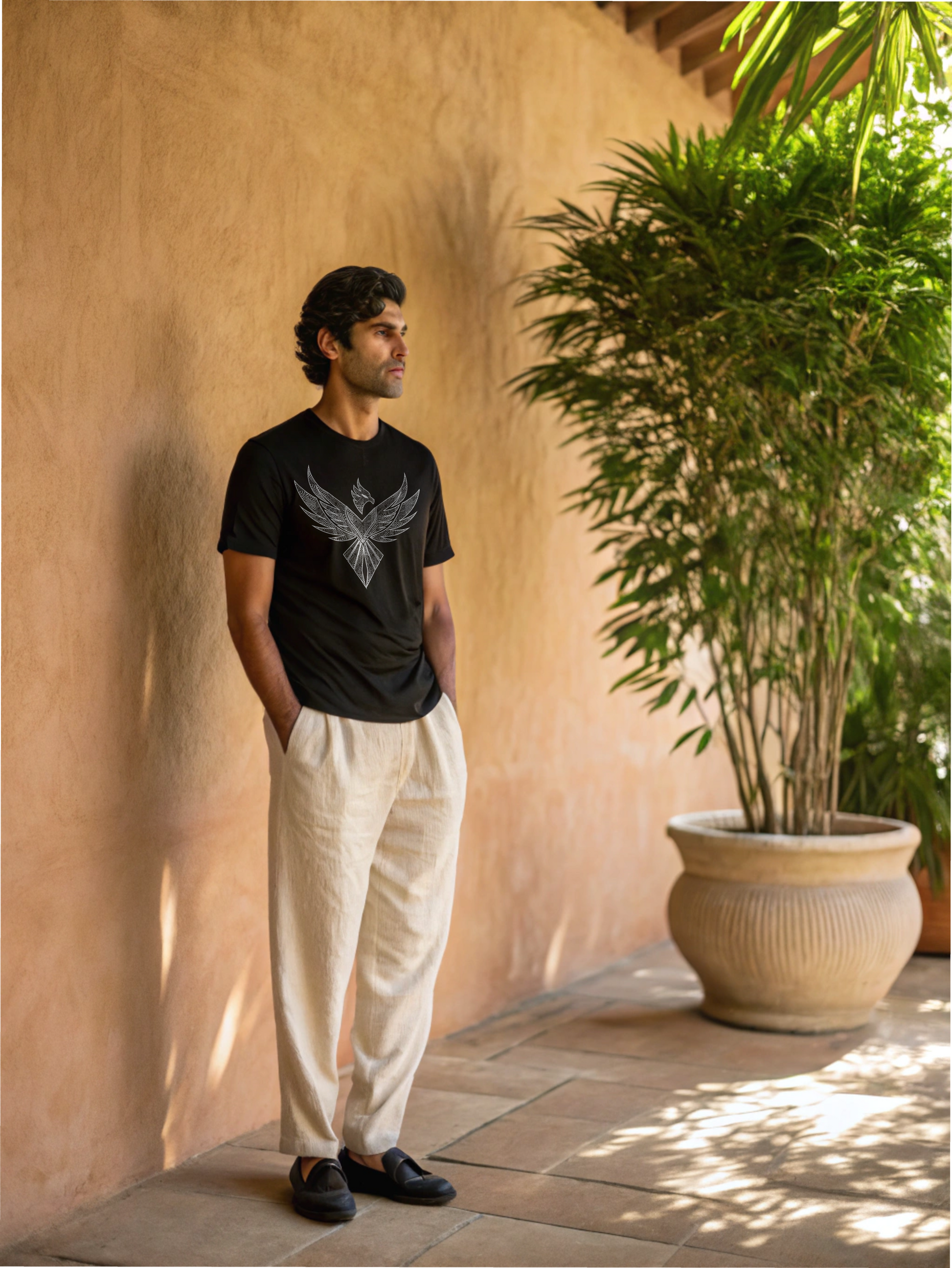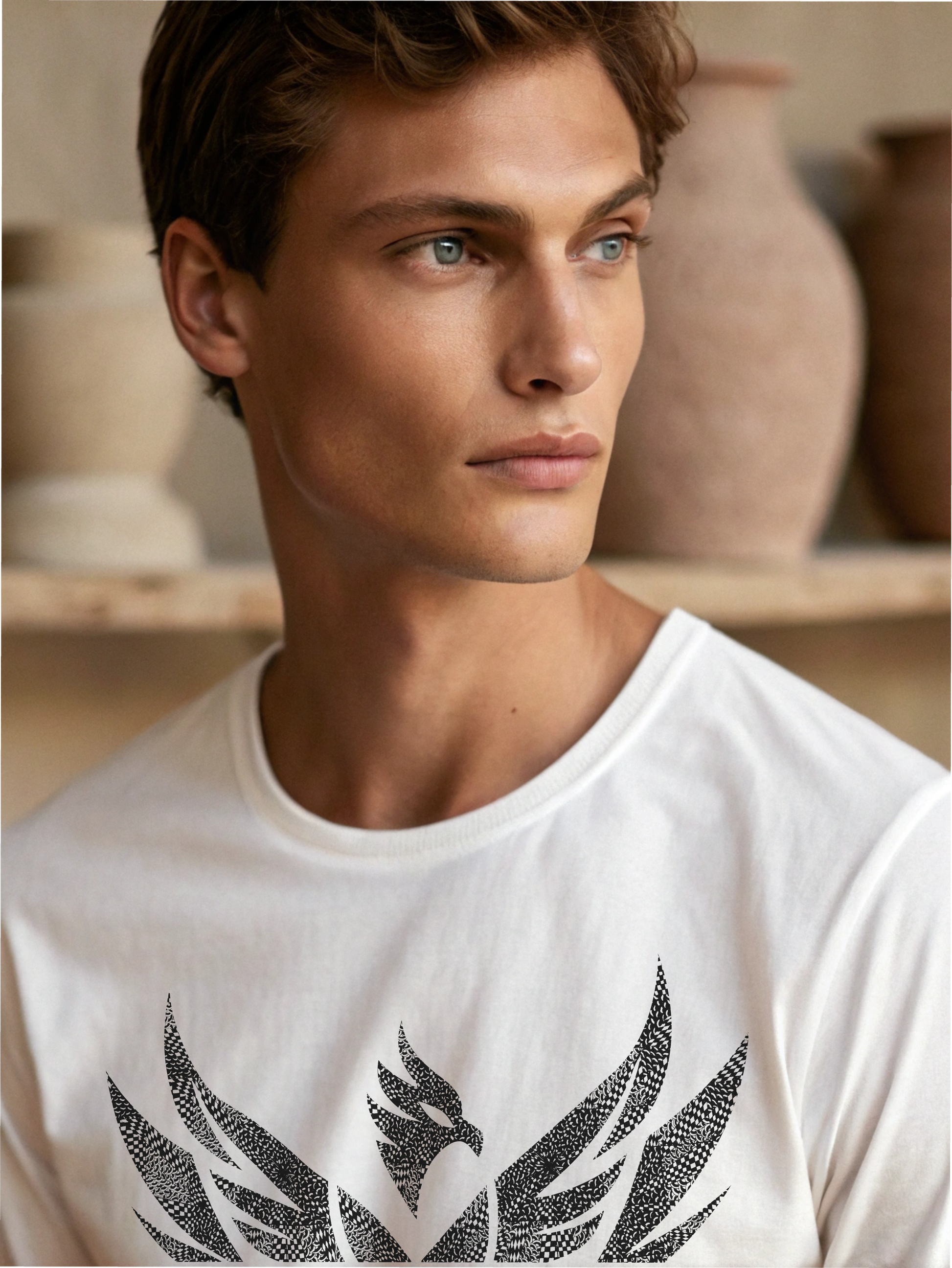 This crisp white tee carries a phoenix — drawn in fine, meditative lines. Rising with clarity and grace, it speaks of rebirth, not rage. For the man who’s been tested and tempered, who understands that real strength is shaped in silence.