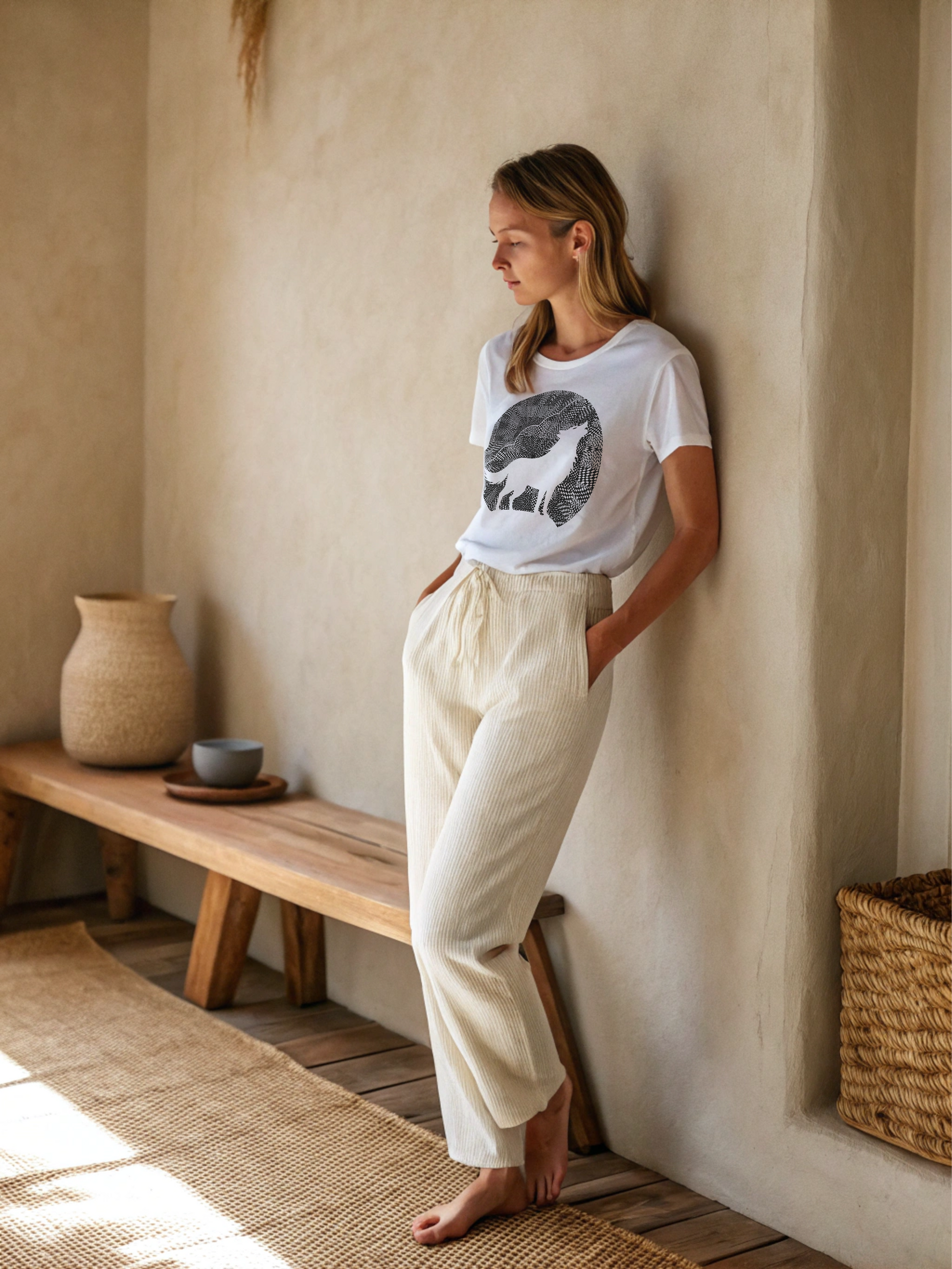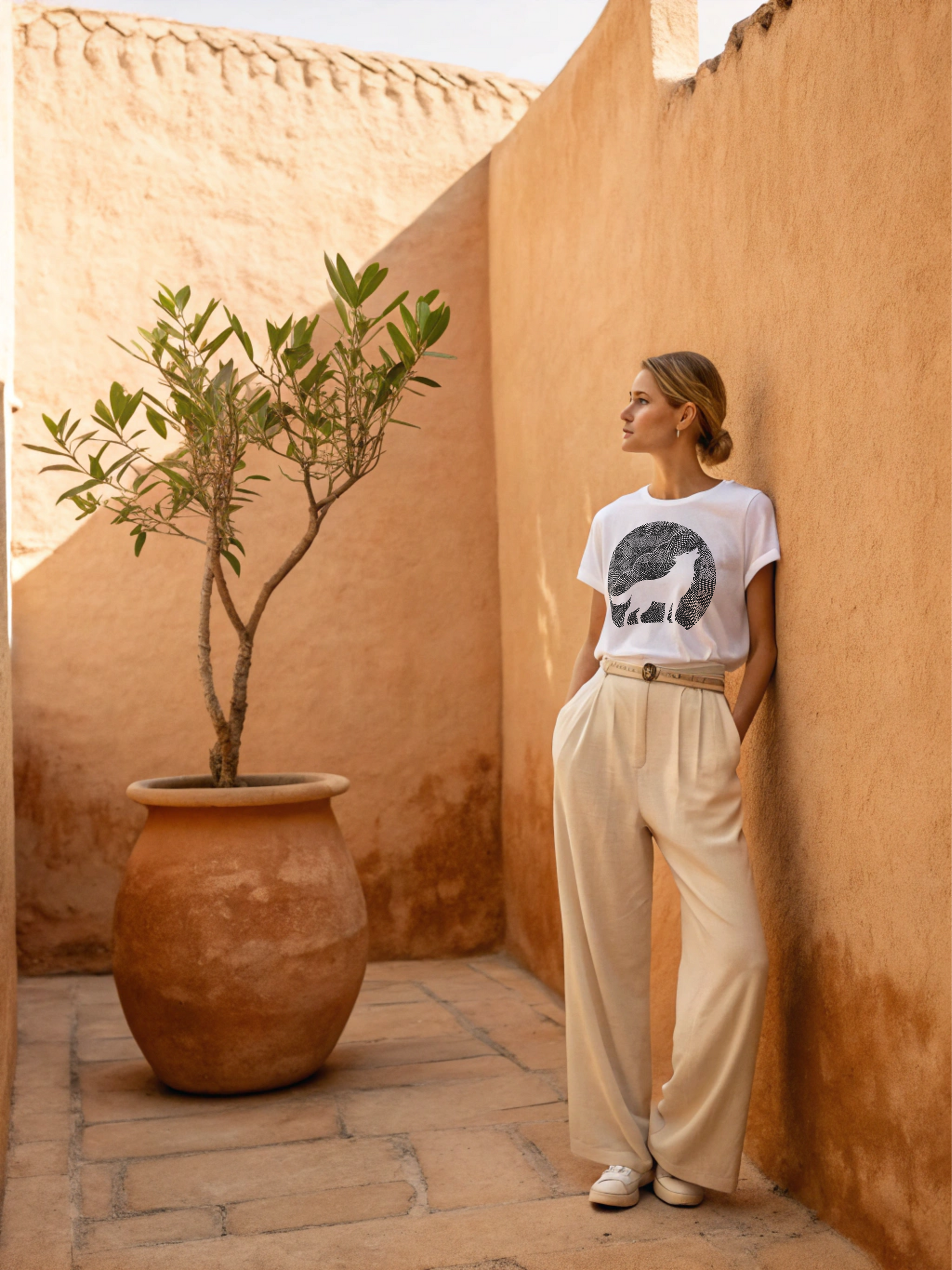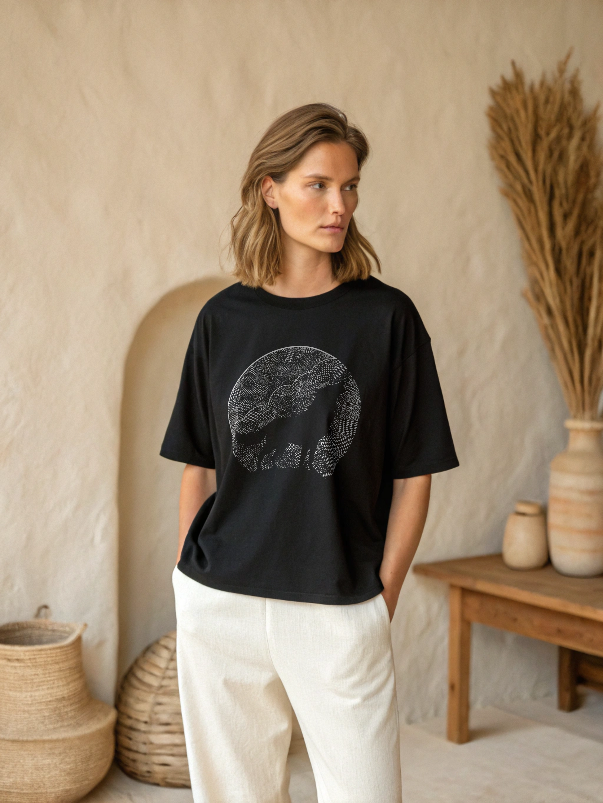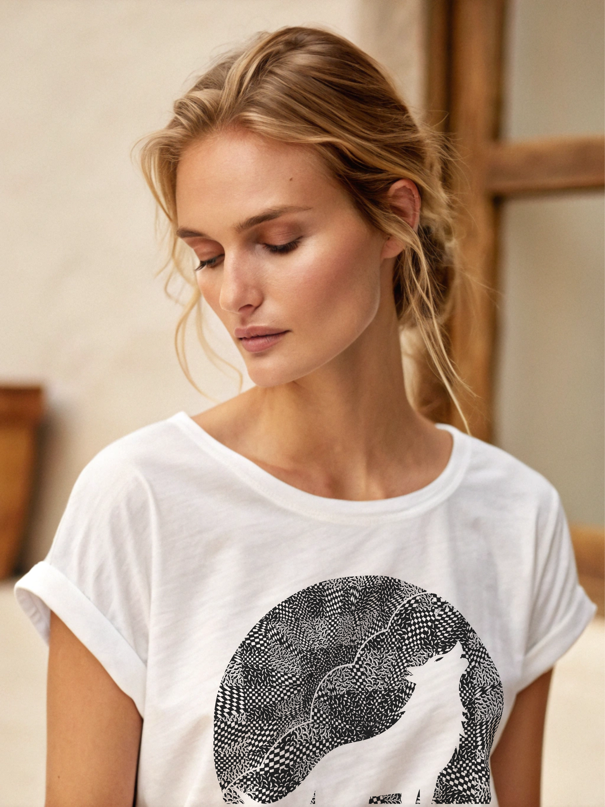 The wolf — sacred, wild, wise — takes center stage on this serene white tee. It's a symbol of self-trust, resilience, and deep inner knowing. For women who move through life by instinct and stand strong in their own presence.