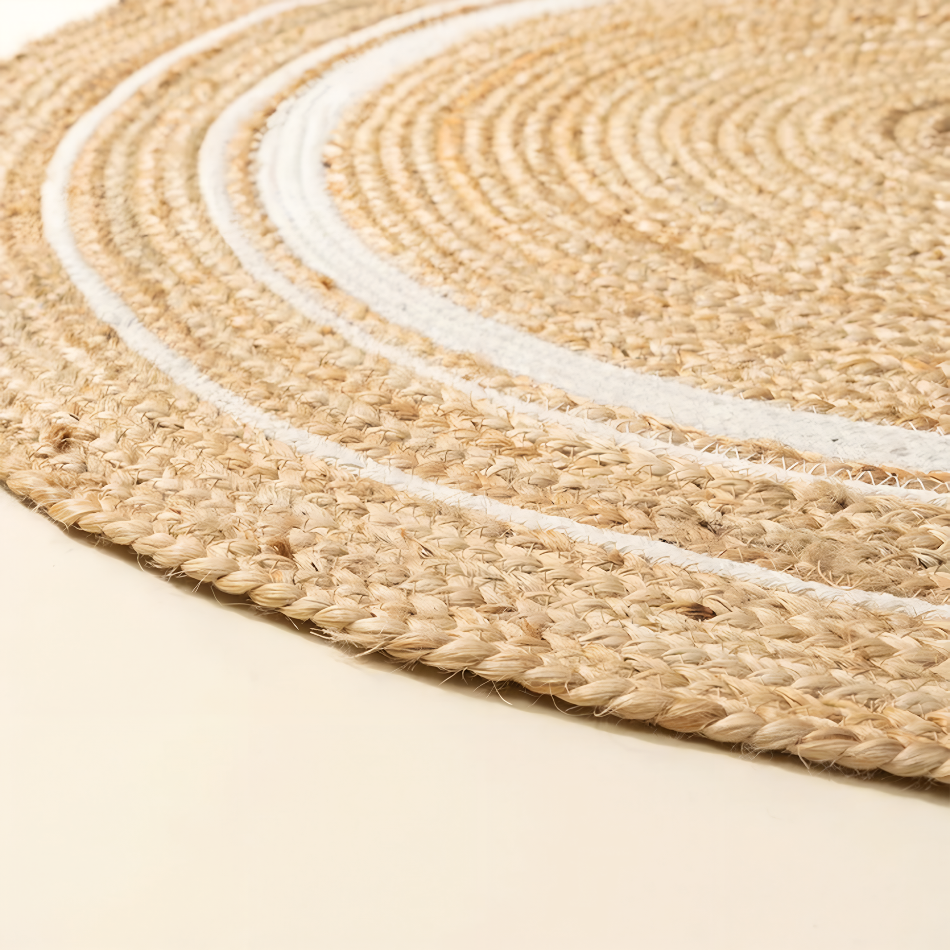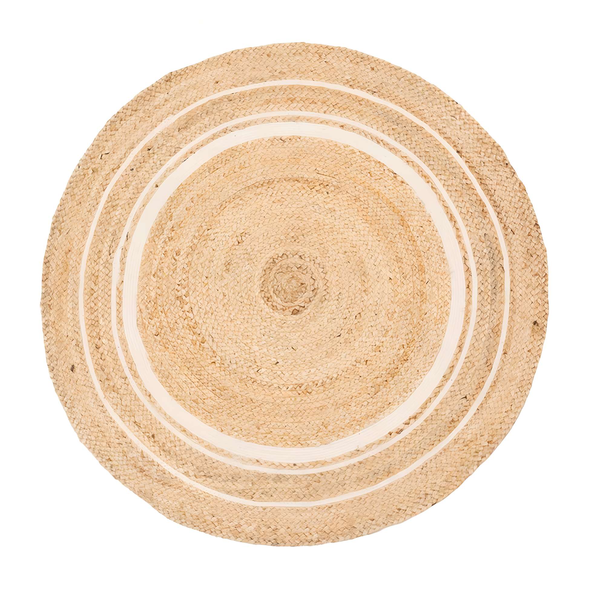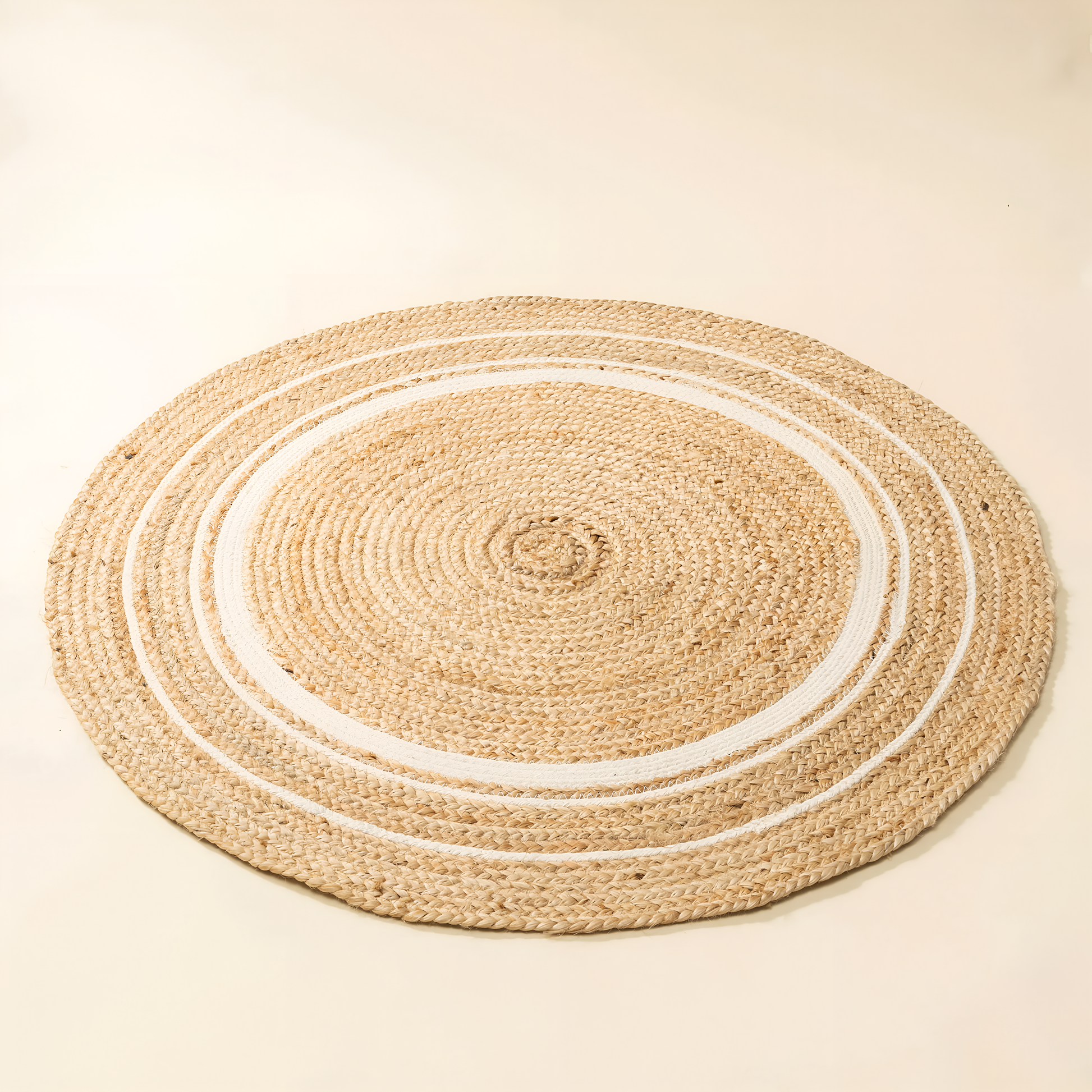 Handwoven Jute Circle Rug – Natural with White Rings. Bring warmth, texture, and mindful design into your space with this hand-braided jute rug, adorned with subtle white concentric rings. A seamless blend of earthy charm and minimal elegance, this piece complements both modern and traditional interiors.