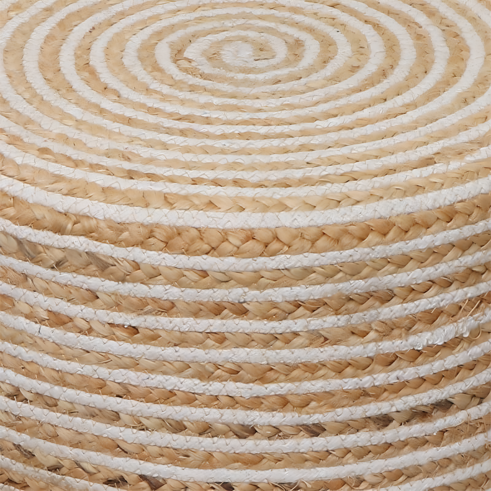Minimalist form meets artisanal rhythm in the Dhaari Spiral Jute Stool. Hand-braided in a hypnotic coil of natural and white jute, this stool brings grounding texture and quiet beauty to any corner. Supported by smooth wooden legs, it works as a charming perch, a compact side table, or an organic accent.