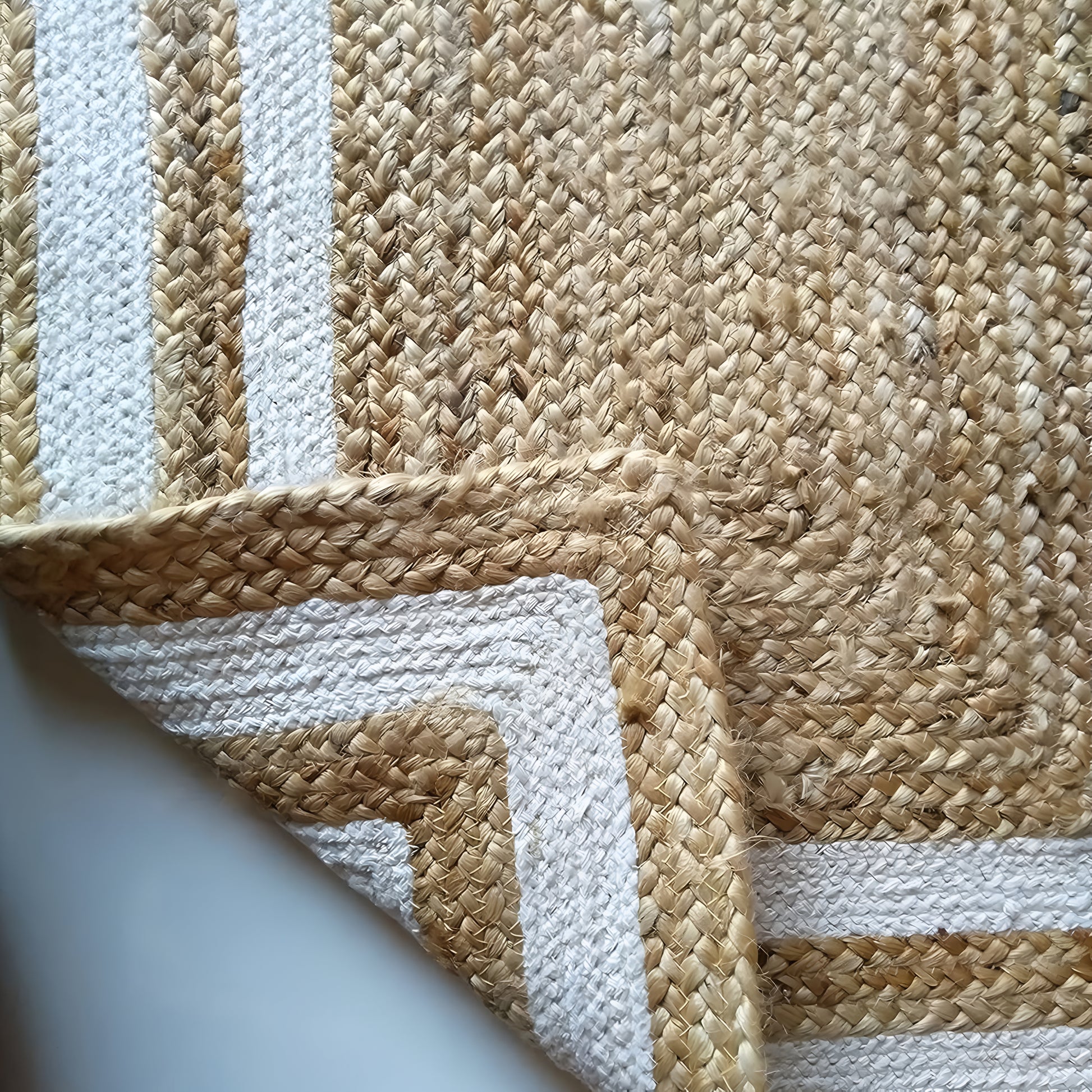 Bold in form yet organic in feel, Dharini brings architectural clarity to natural living. Handwoven from thick, textured jute, the rectangular frame design features clean white borders that highlight structure and balance. Perfect for anchoring your living room or entryway, this rug reflects quiet strength and earthy sophistication.
