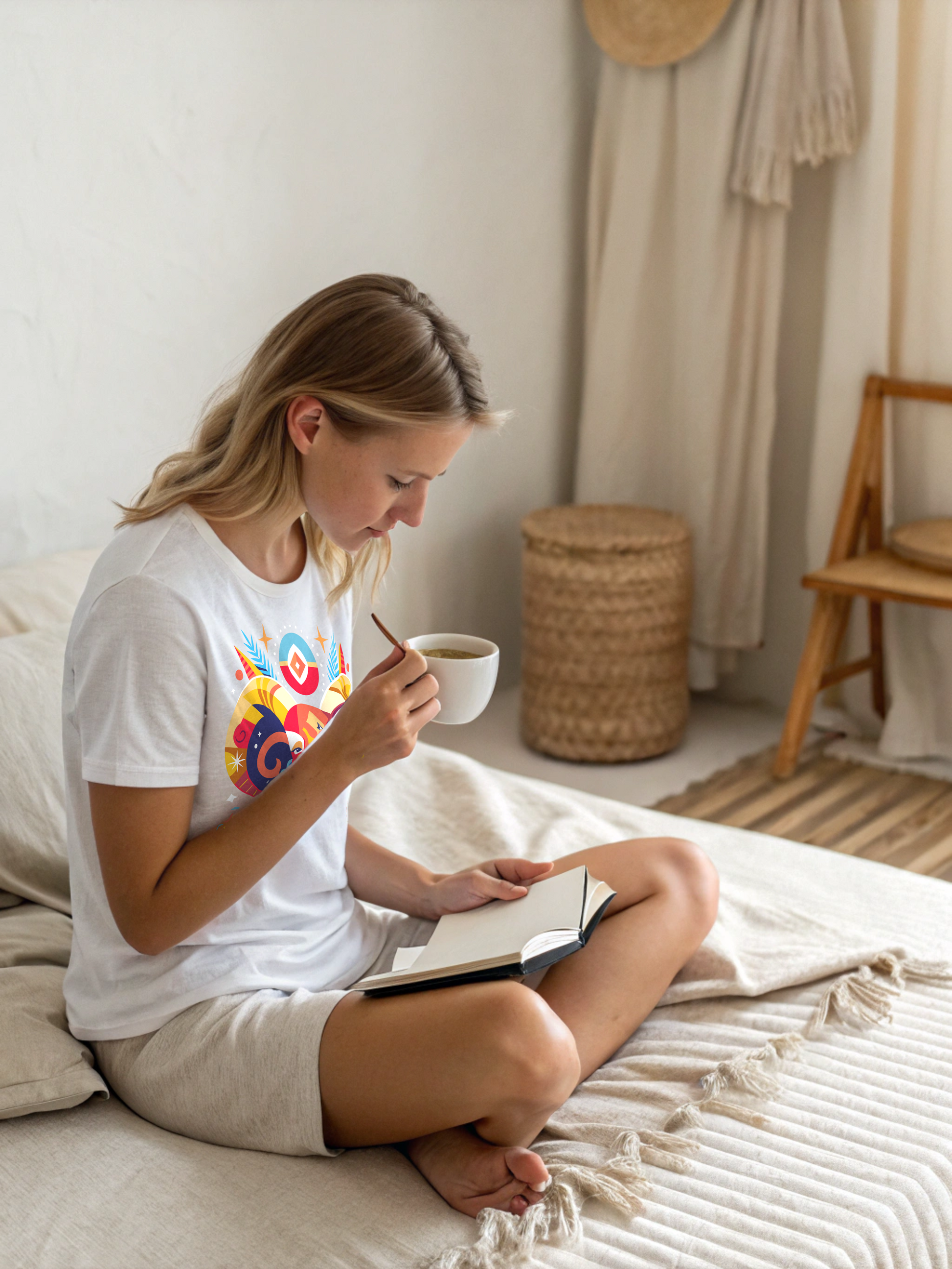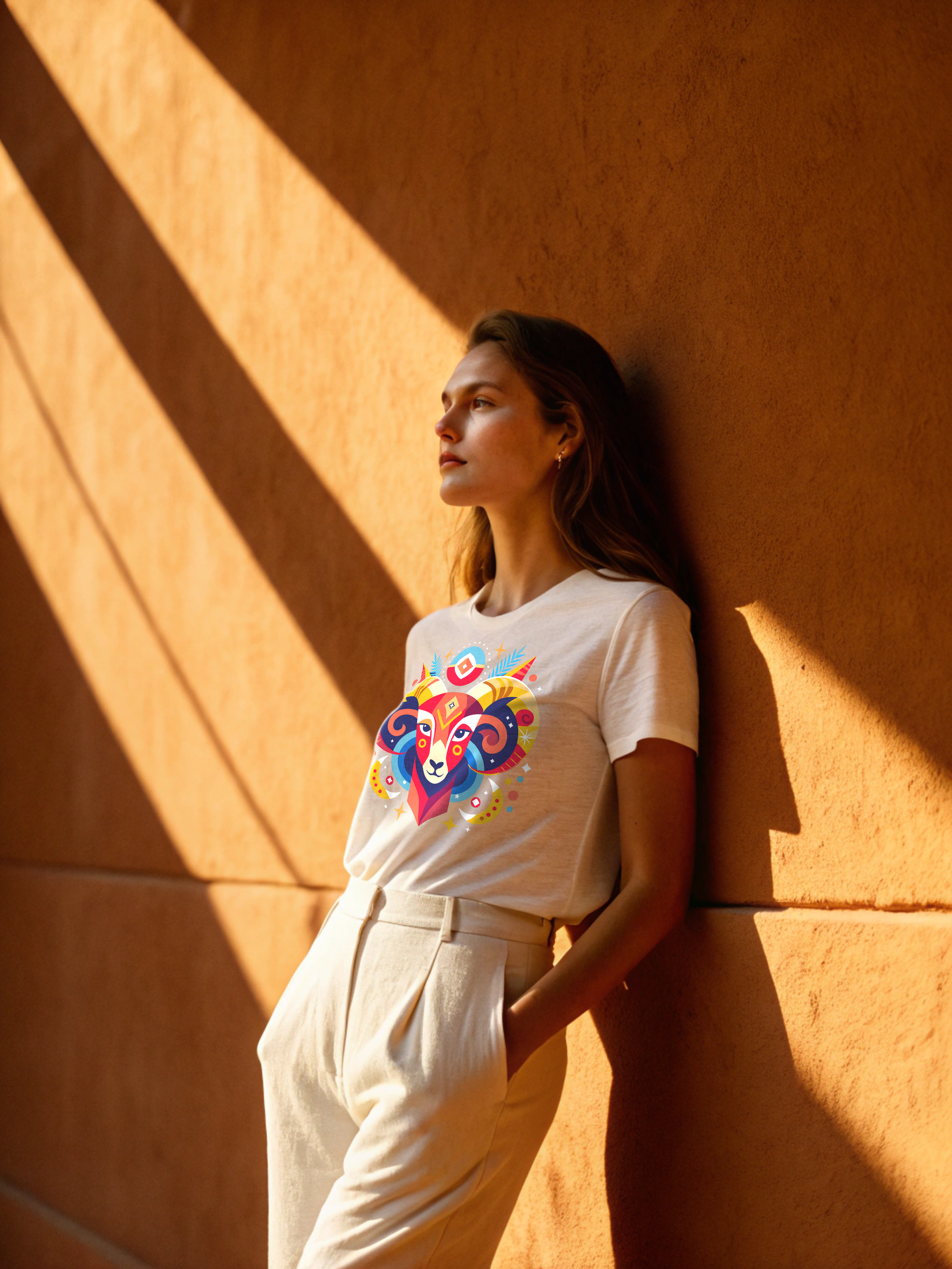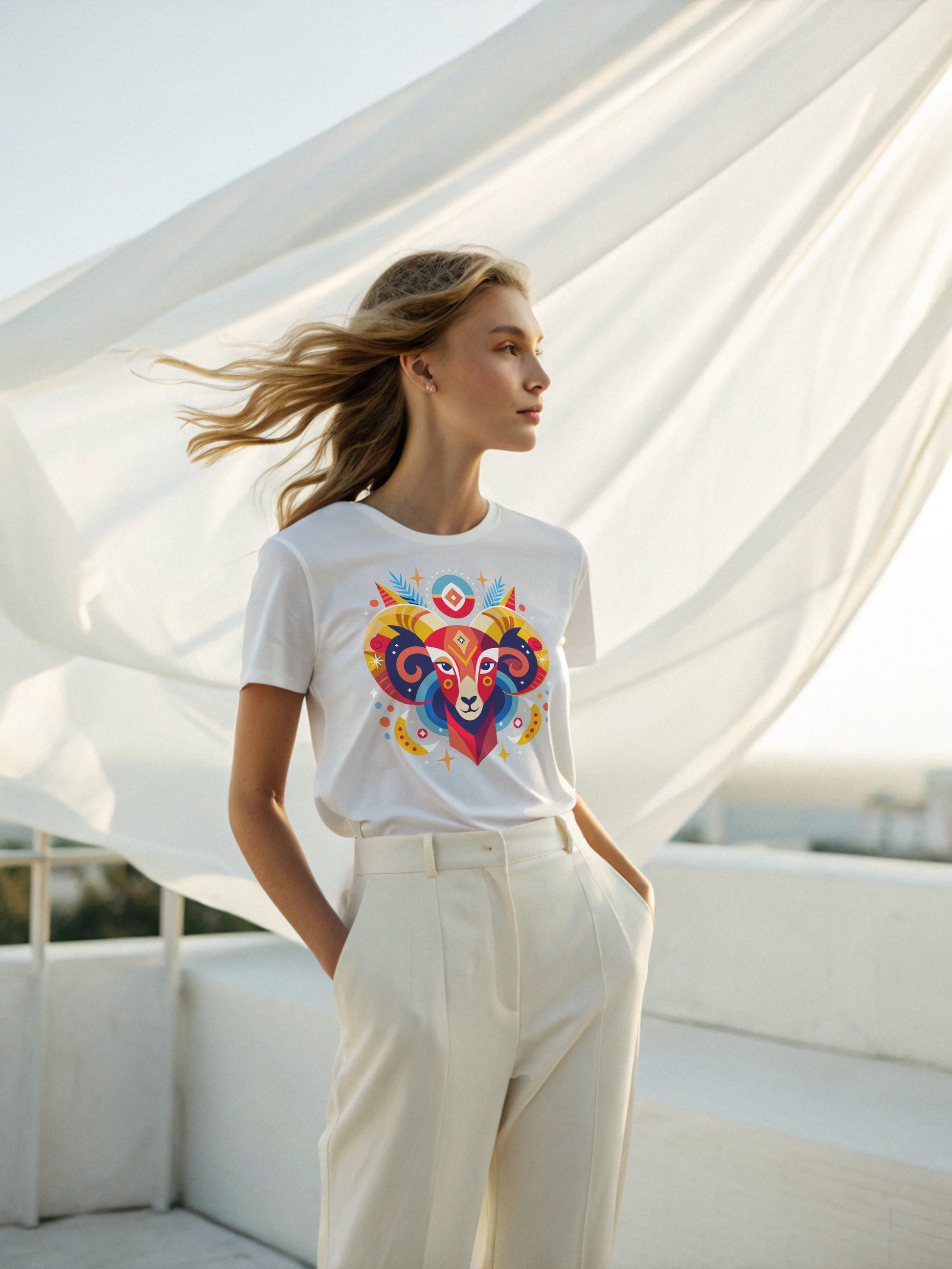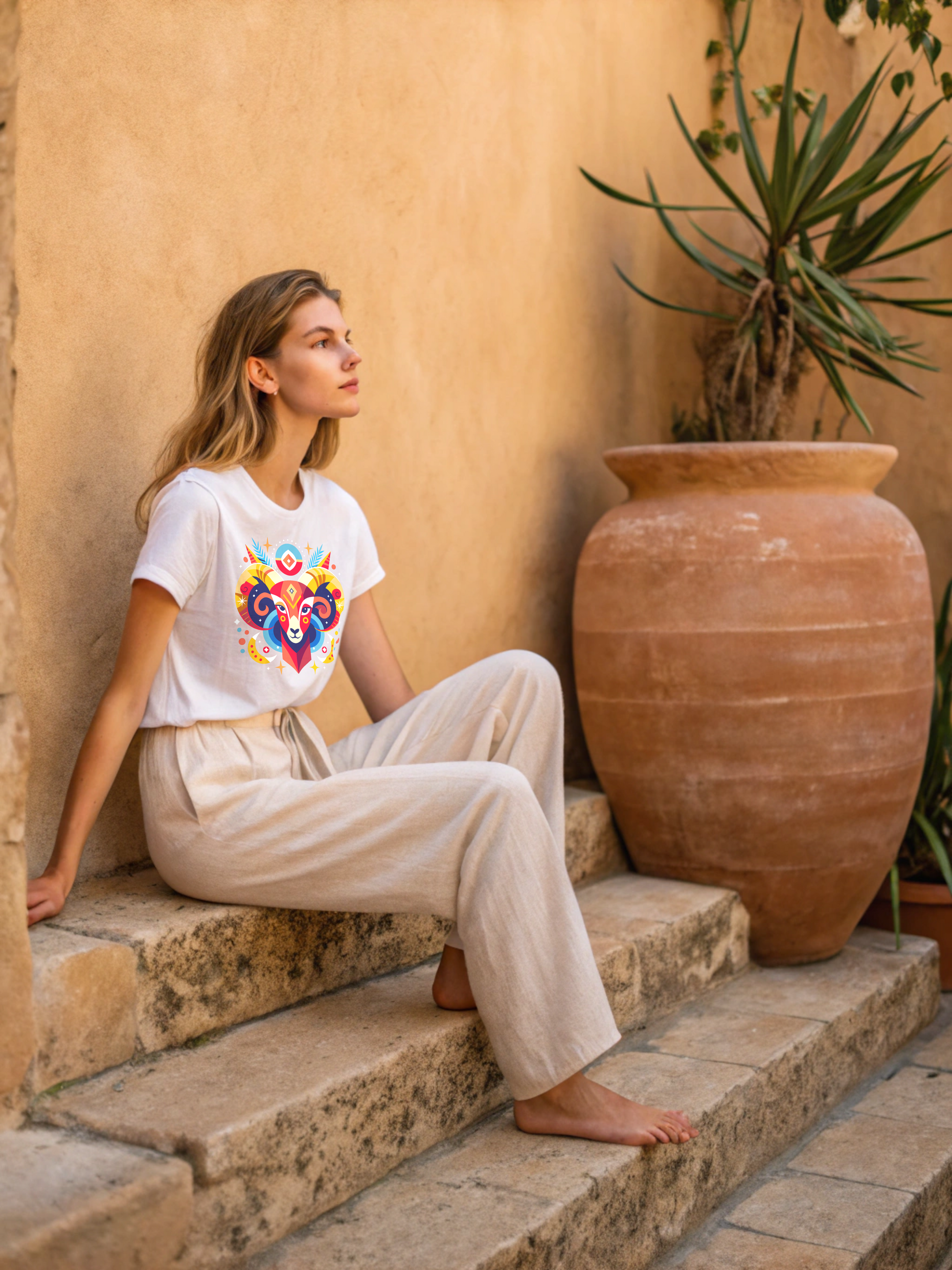 The First Flame Tee captures the fearless Aries energy—bright, instinctive, and impossible to ignore. The soft white base lets the vivid, geometric Aries ram illustration do all the talking—radiating in fierce tones of crimson, ochre, and electric blue.