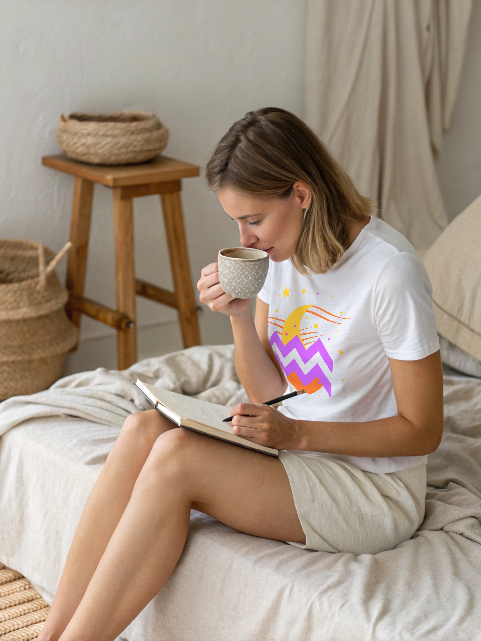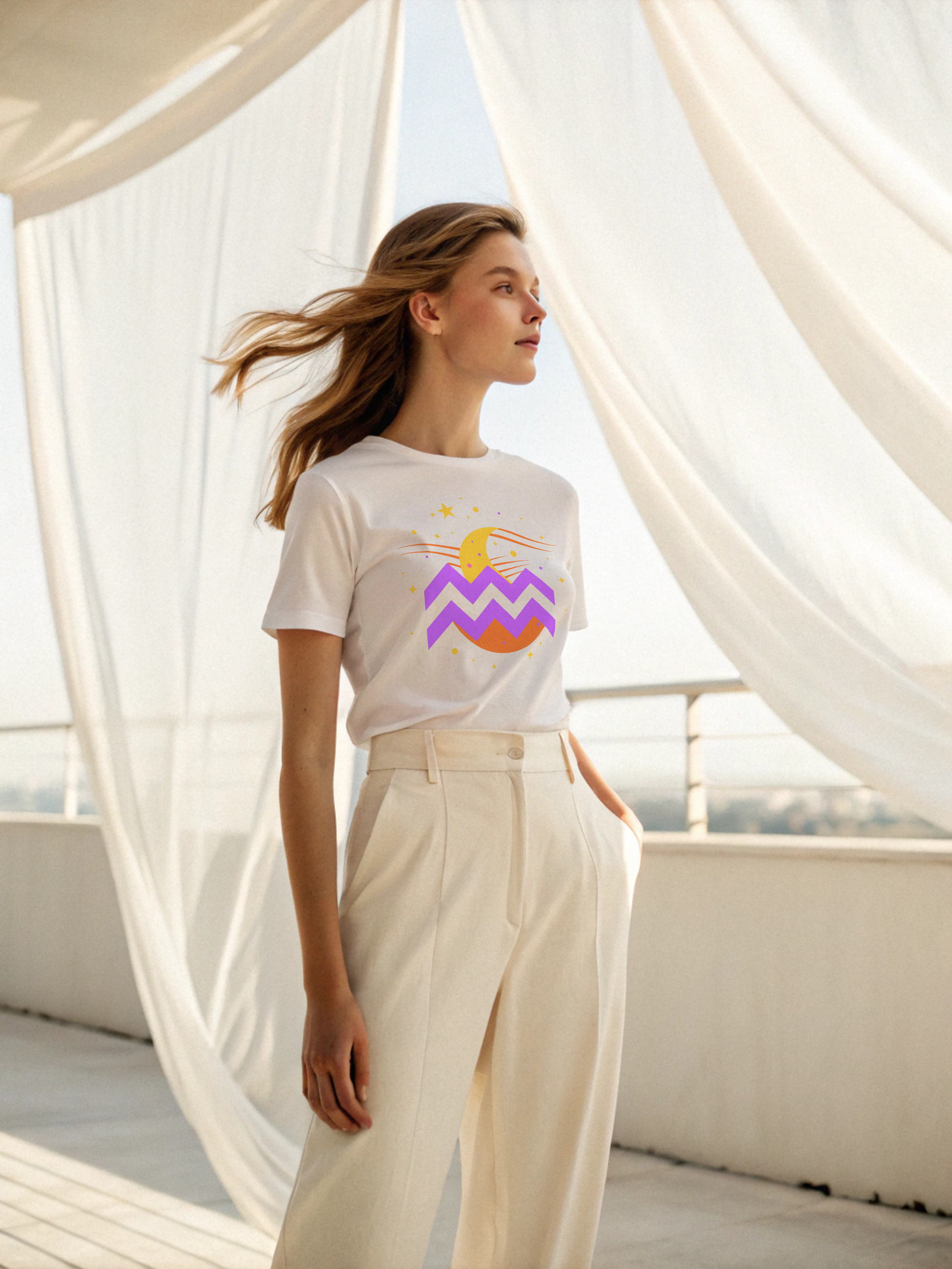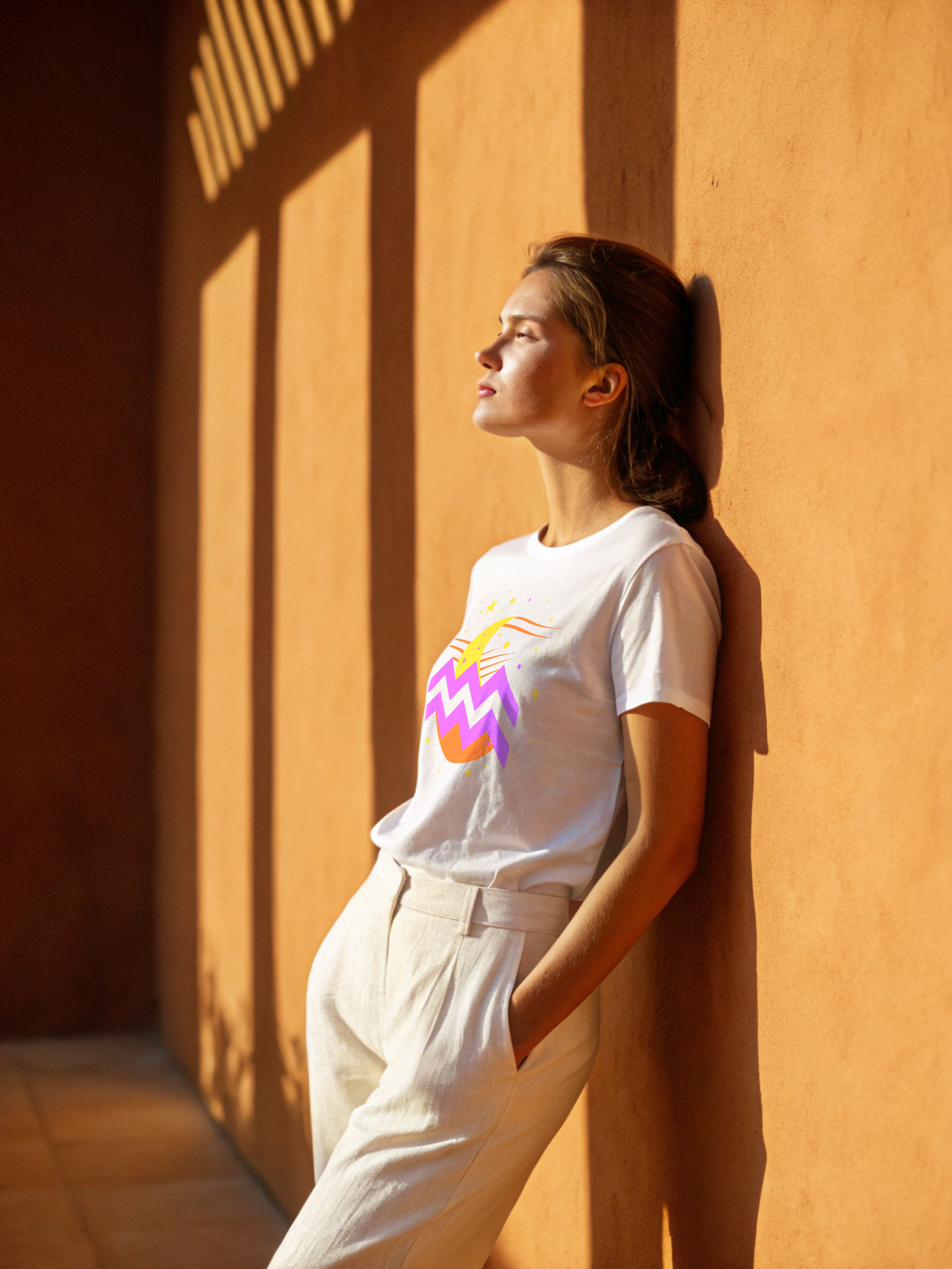 The Future Flow Tee in white was made for that soft rebellion—the kind that chooses clarity over noise. With its airy cotton base and a fluid Aquarius symbol in blush, lavender, and gold, this tee is equal parts graceful and grounded.