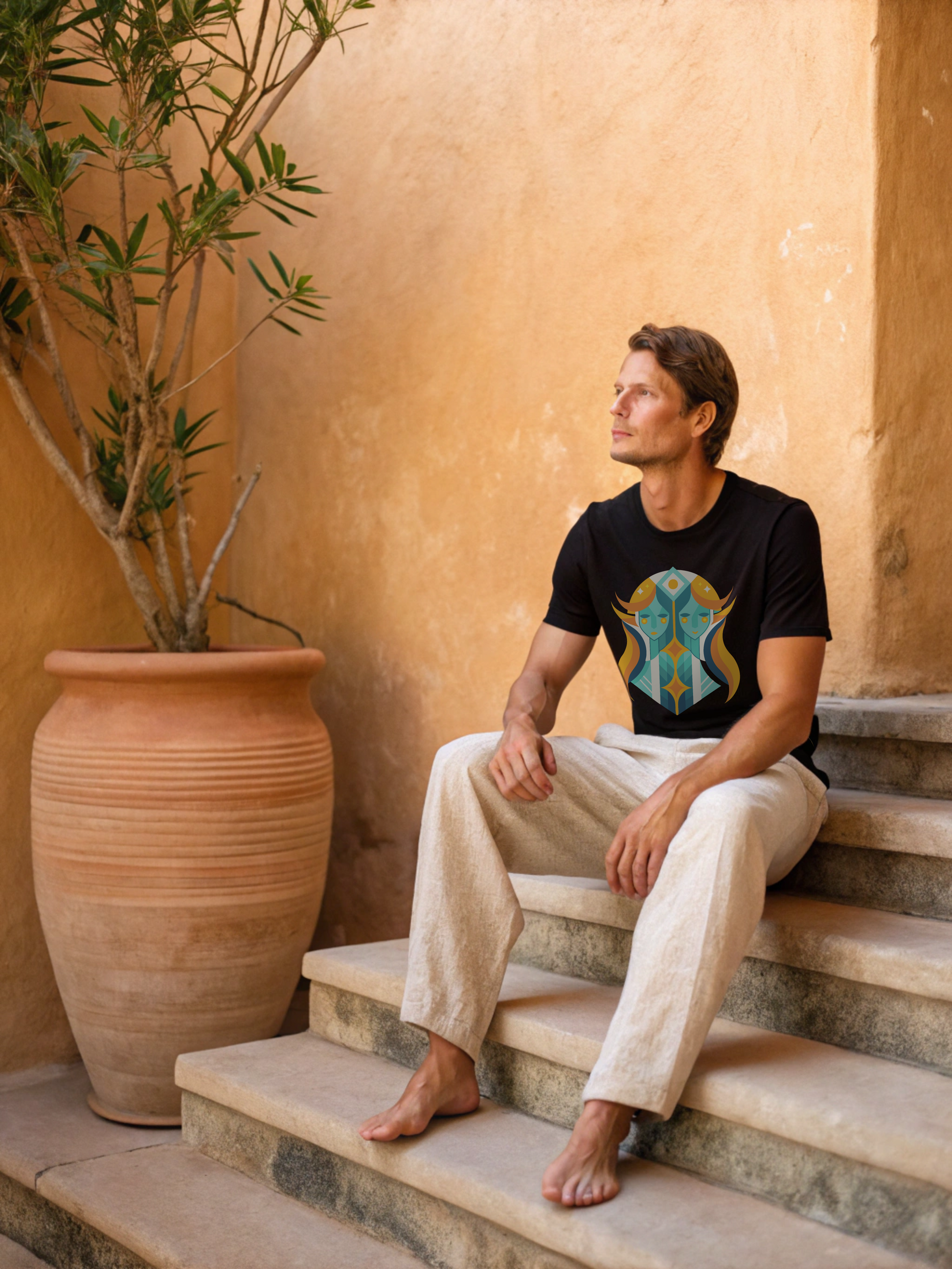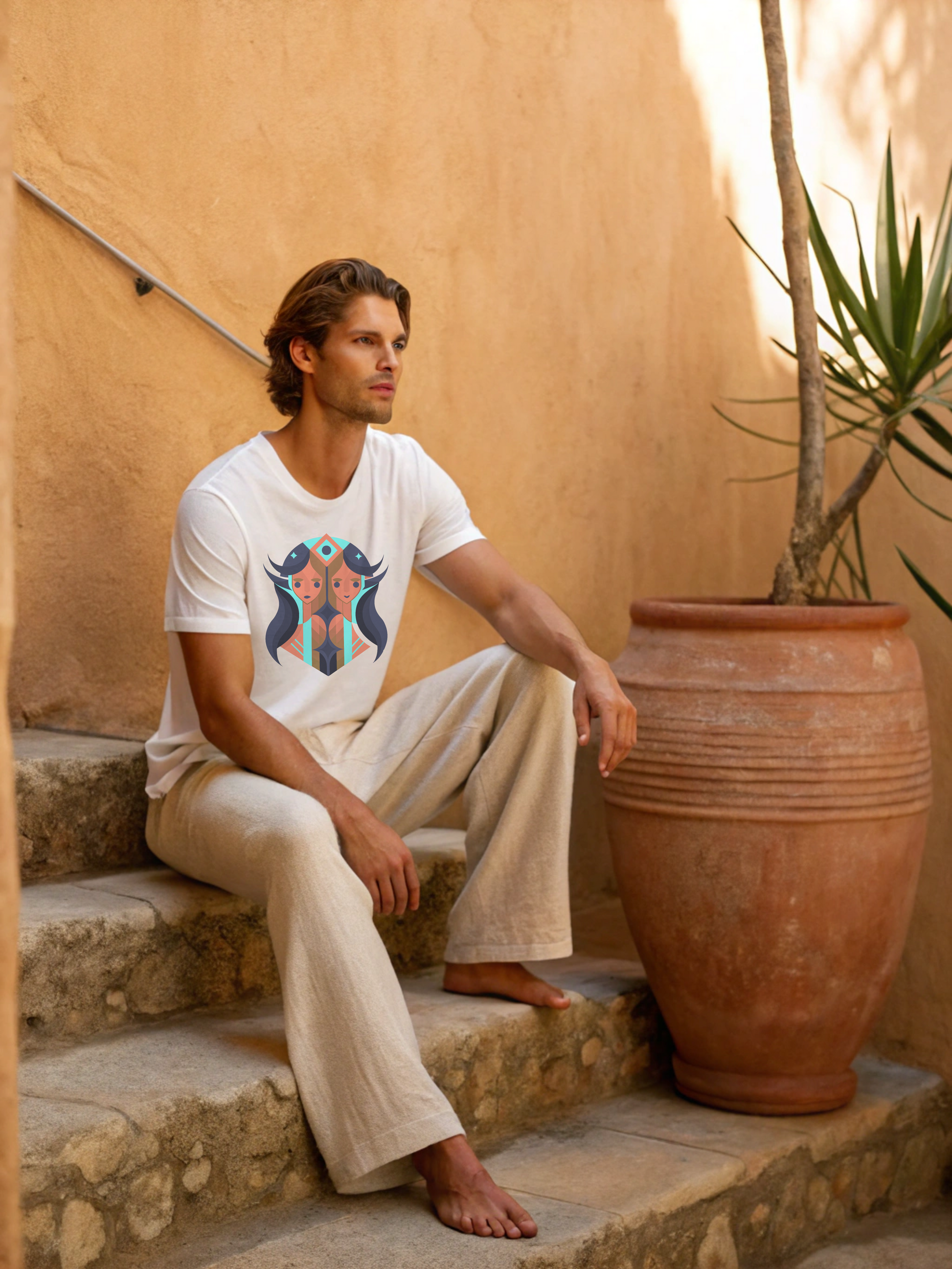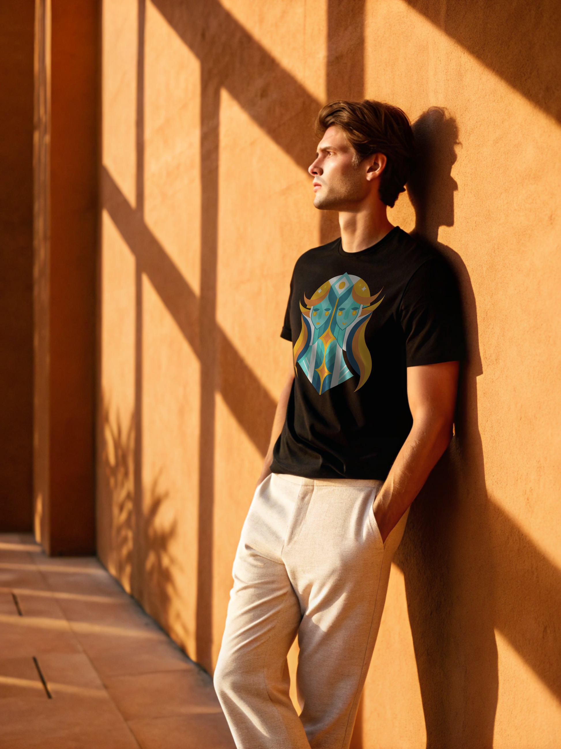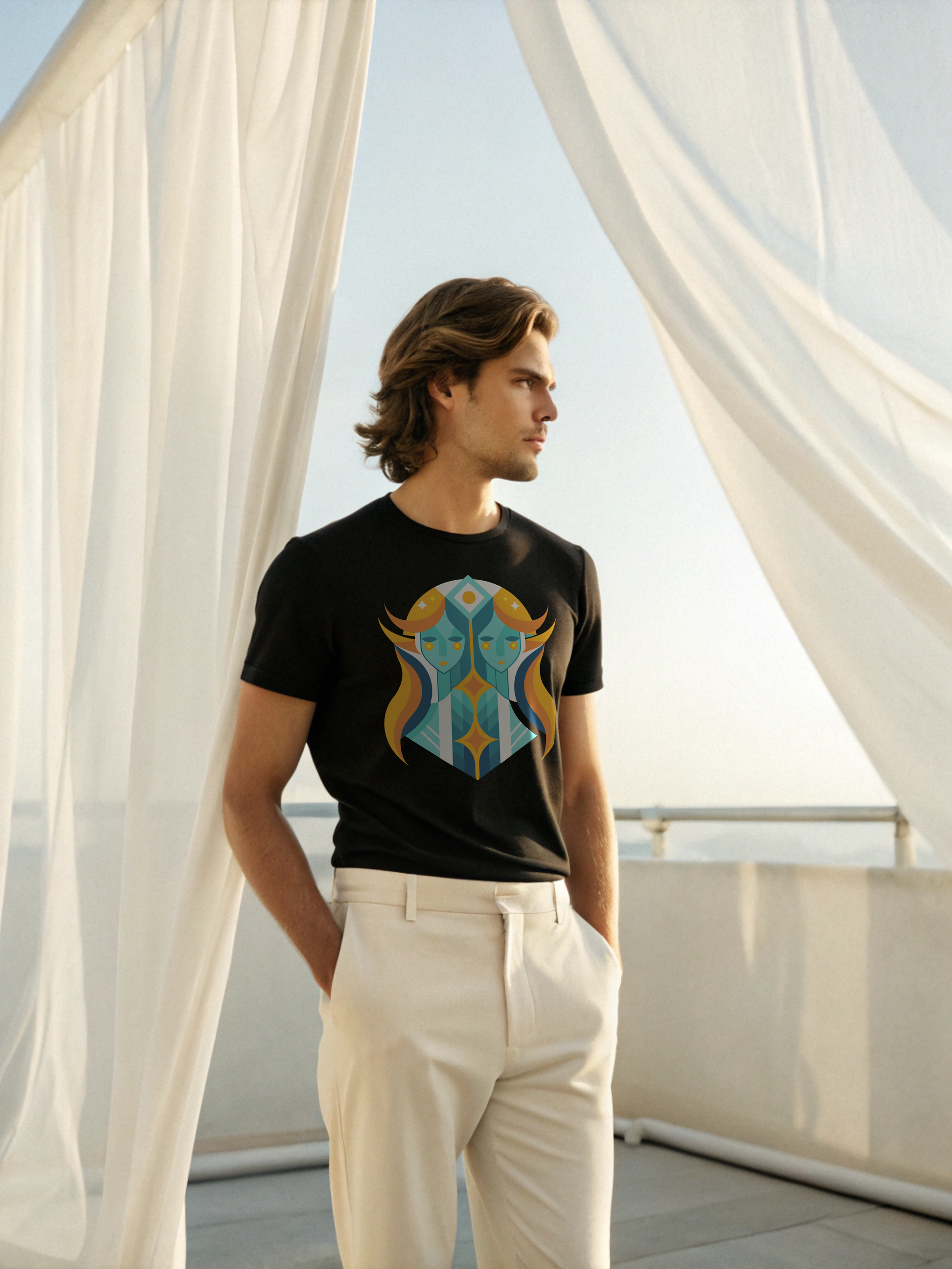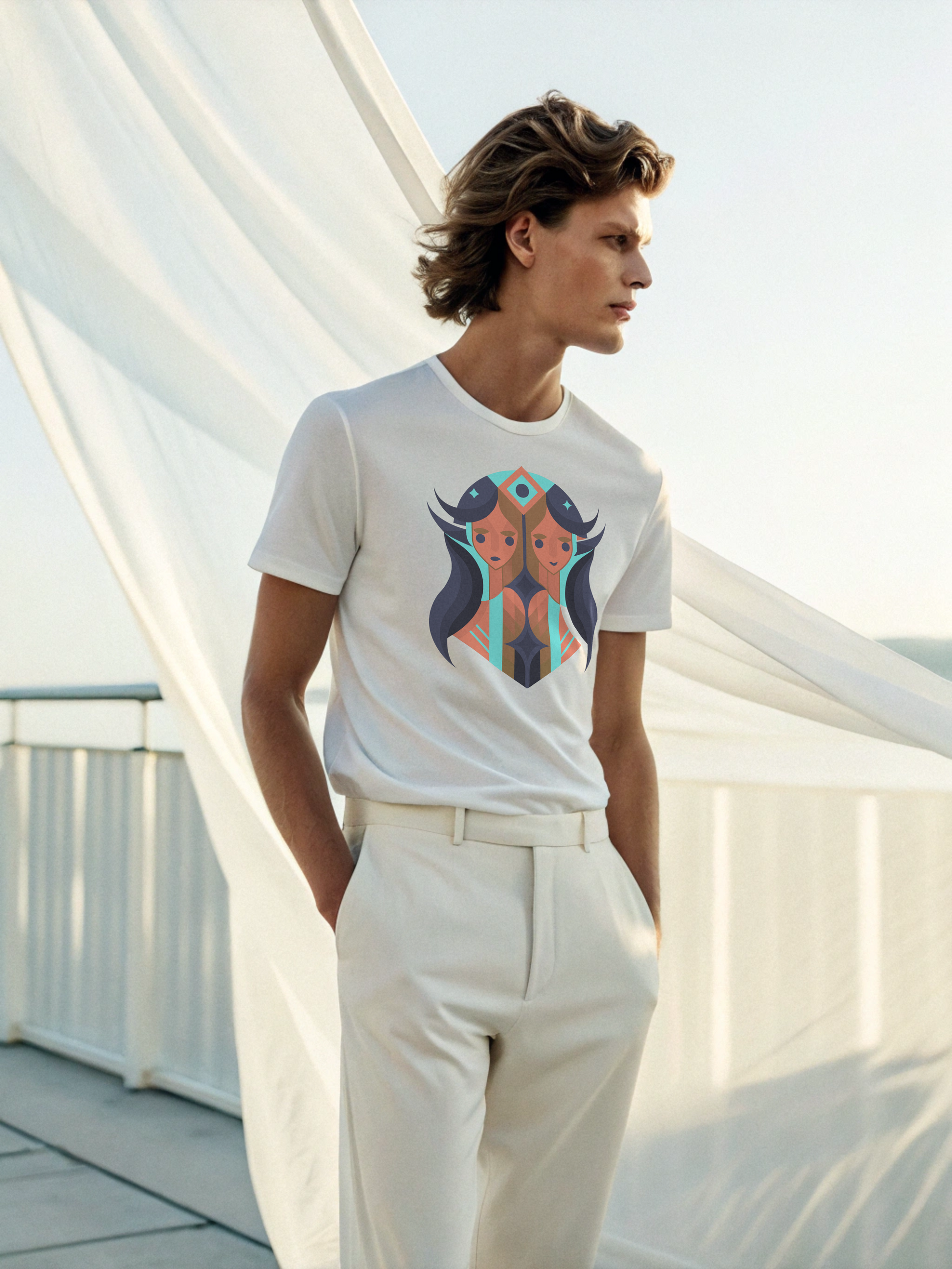 Two souls, one story. The Gemini Duality Tee in white captures the essence of balance and contrast, intellect and instinct. The twin motif stands bold against crisp cotton, a symbol of adaptability and charm. Made for the man who embodies versatility without losing his center.