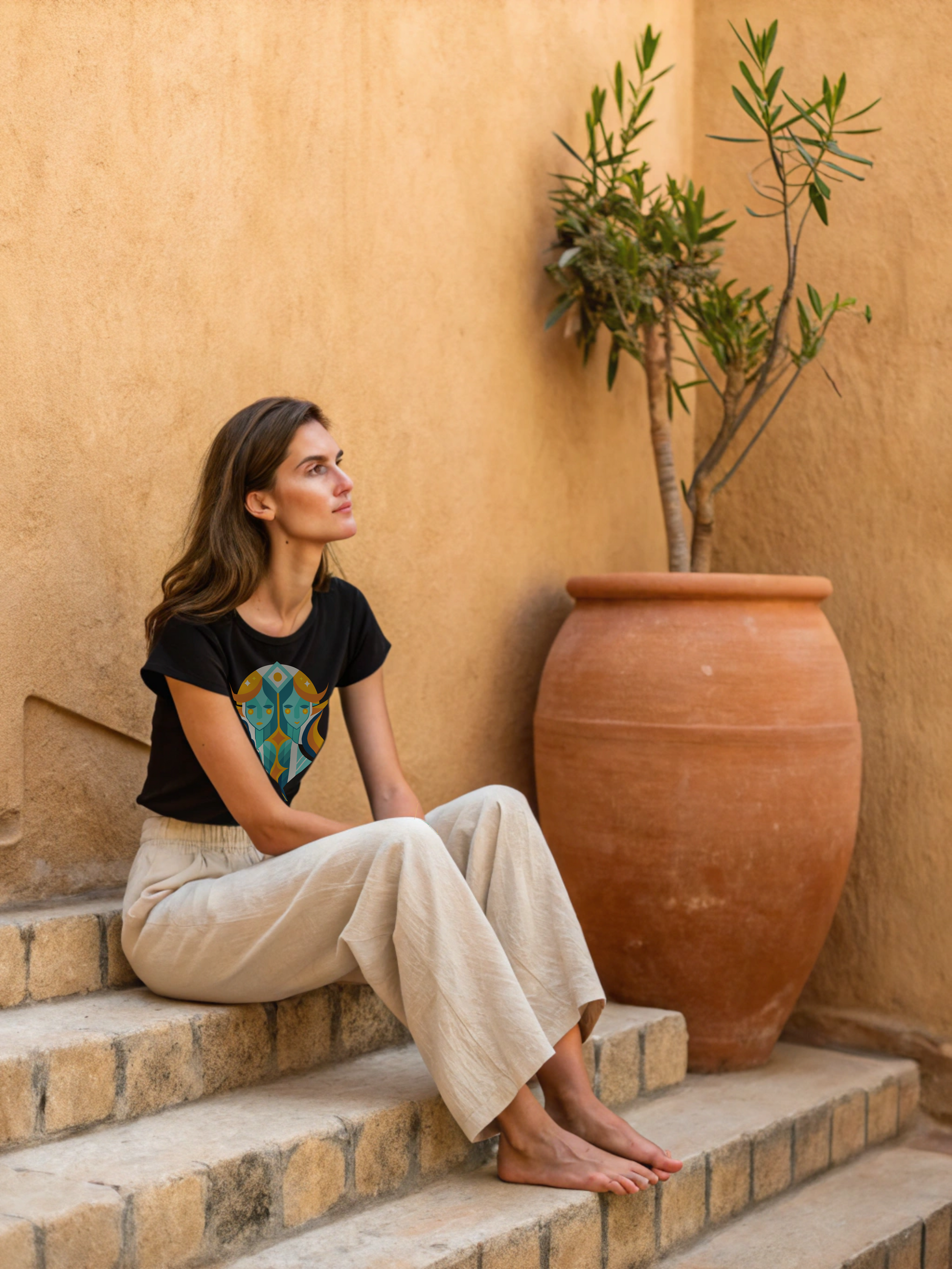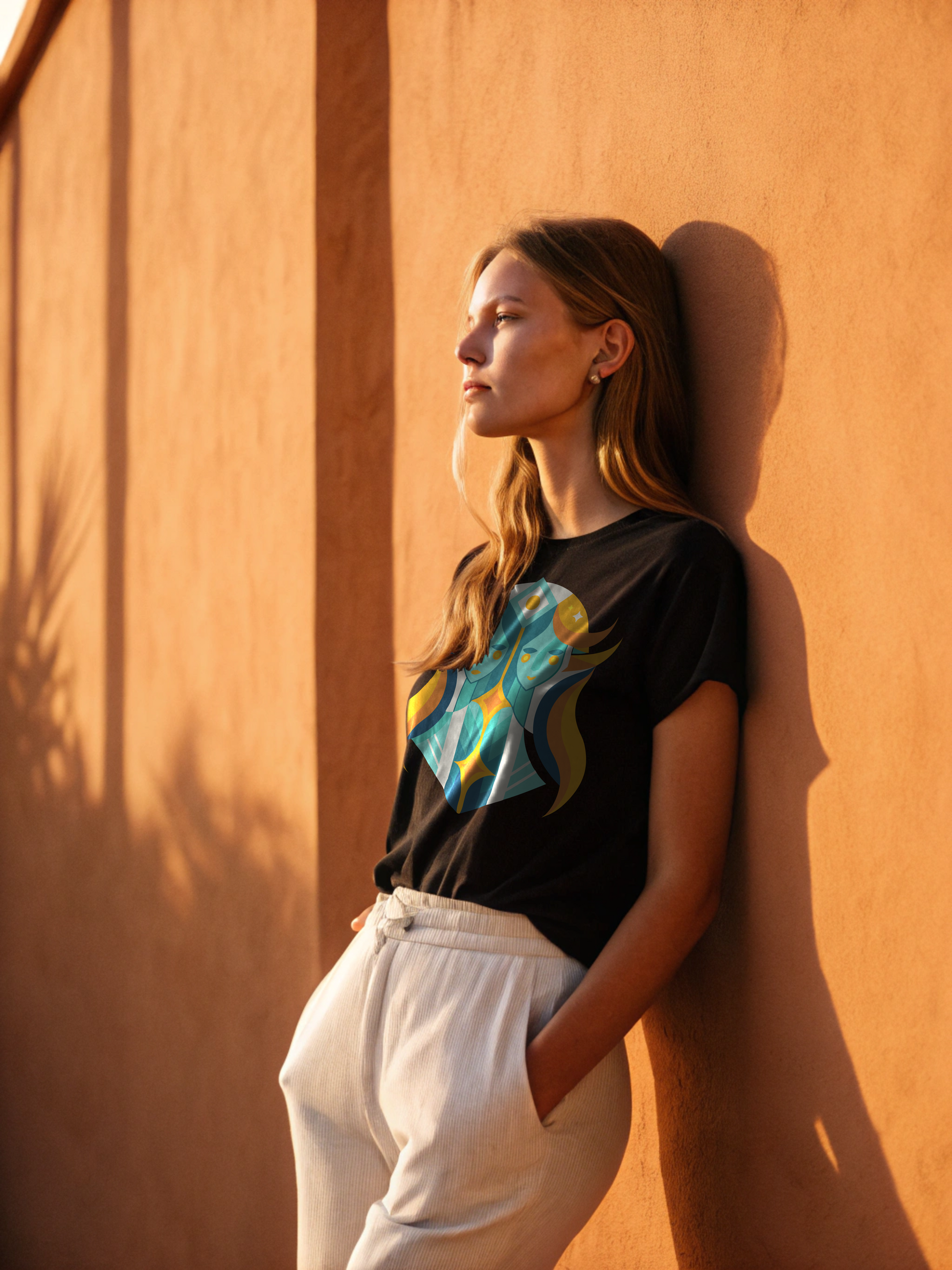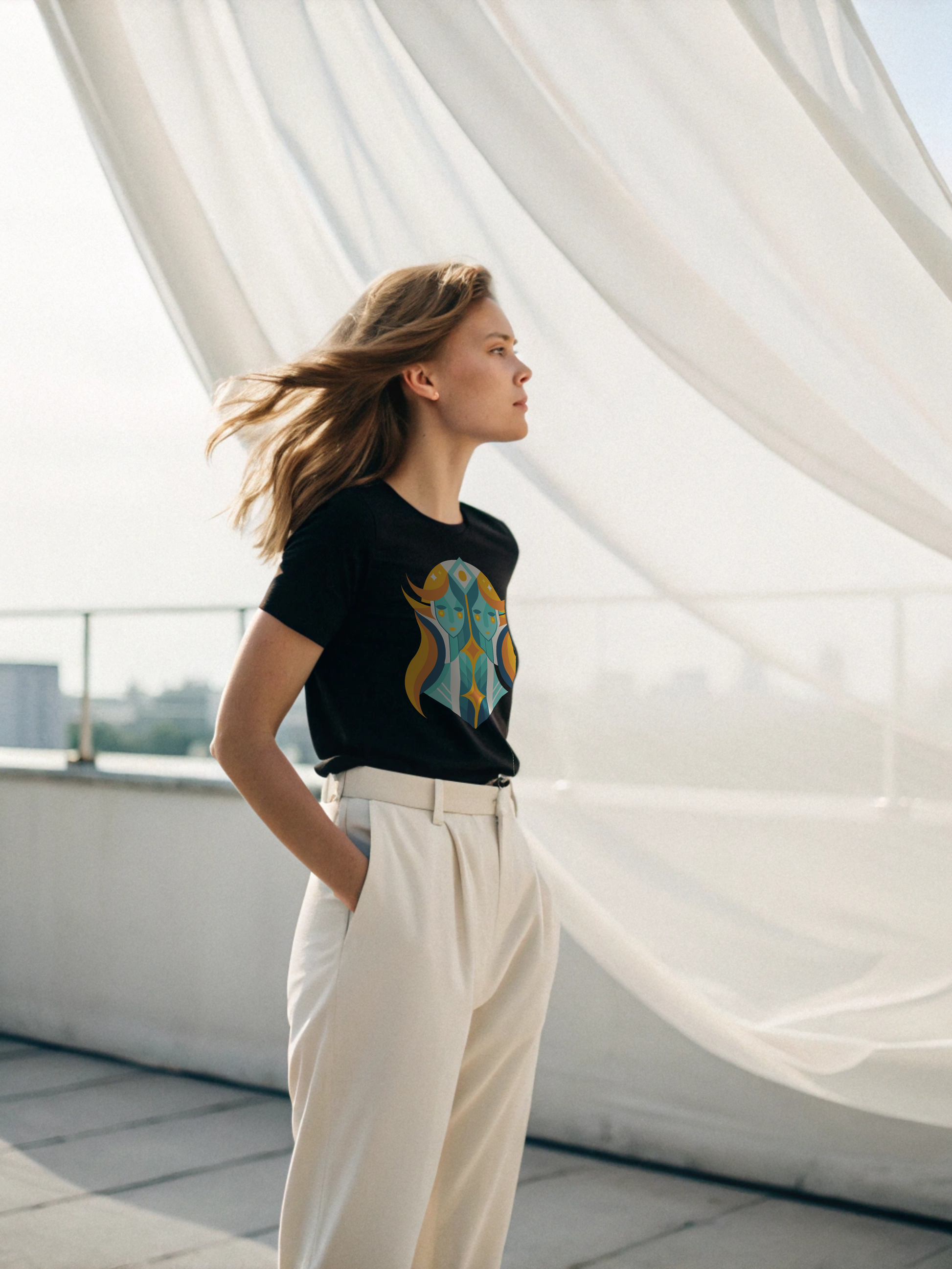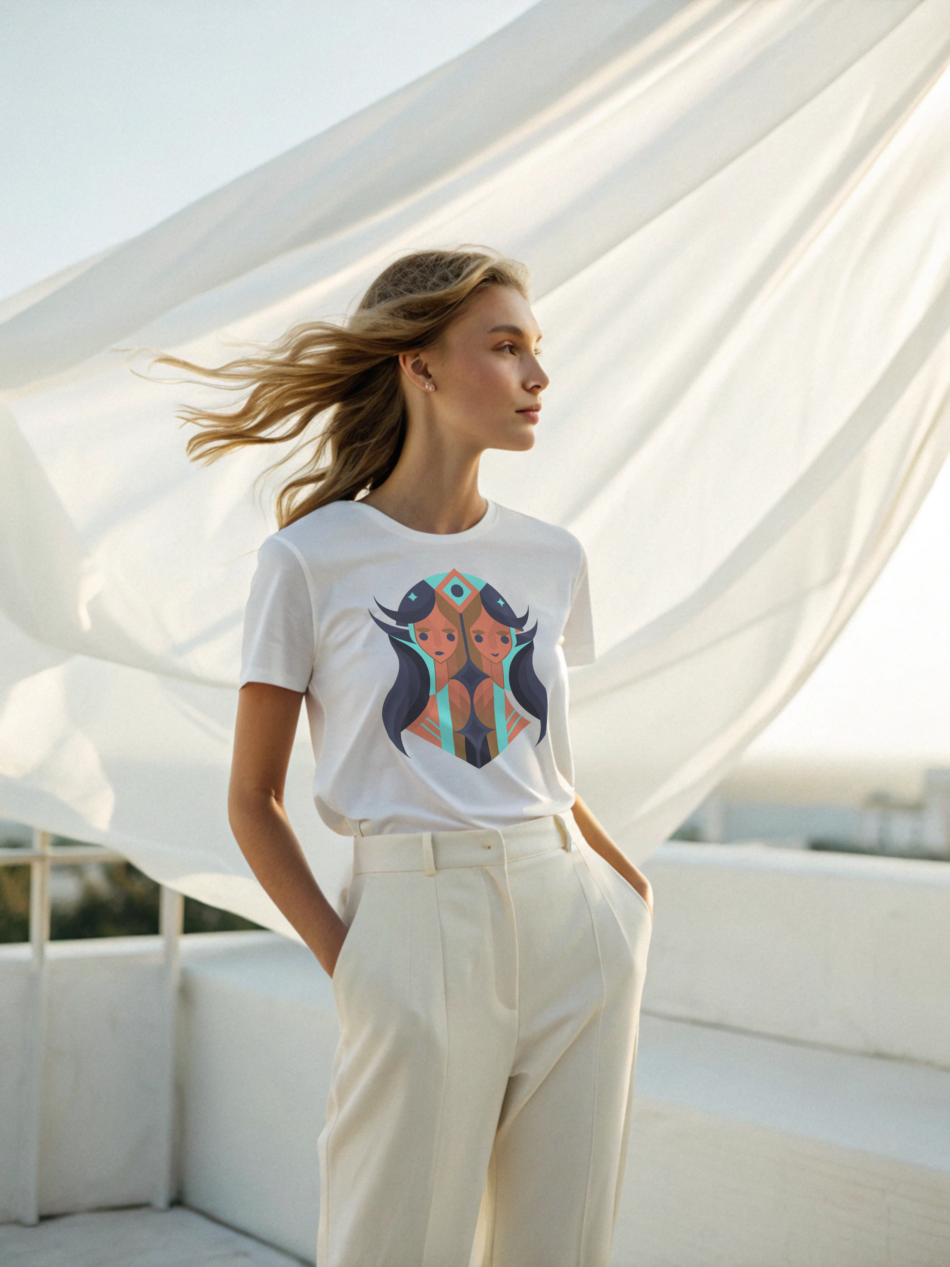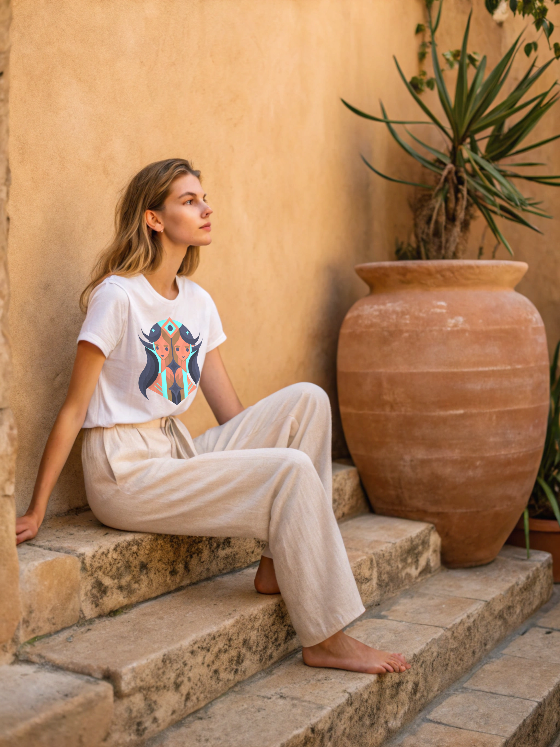 A dance of light, a mirror of minds. The Gemini Duality Tee in white is for the woman who celebrates curiosity, wit, and depth. The colorful twin emblem speaks to her layered nature — radiant, adaptable, and always evolving.