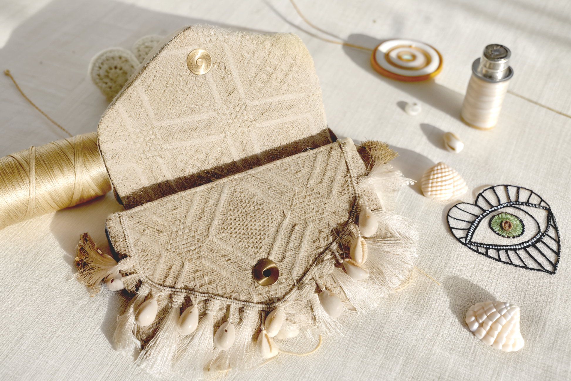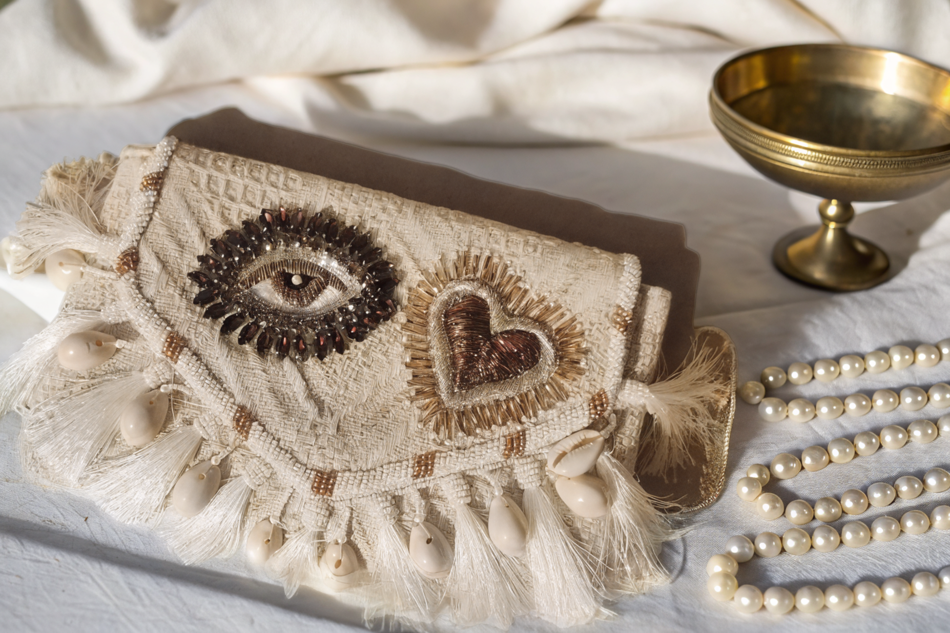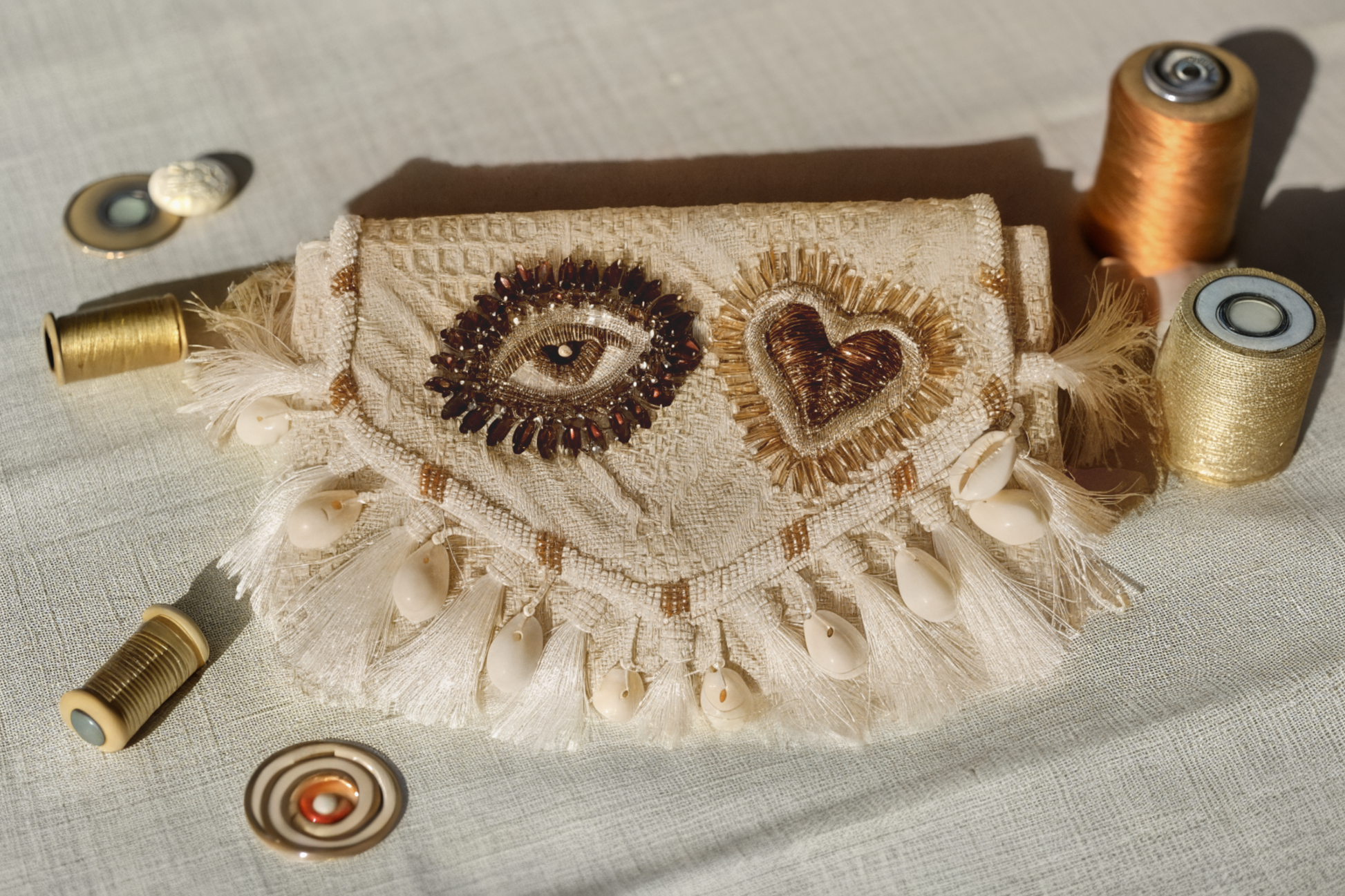 The base is structured yet soft to hold, with a magnetic flap and cotton lining. It’s the kind of piece that turns heads — best paired with both easy daywear or layered festive looks. Wherever you carry it, it brings with it a mood: loud, happy, and deeply handmade.