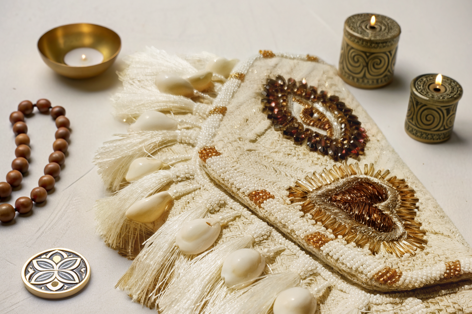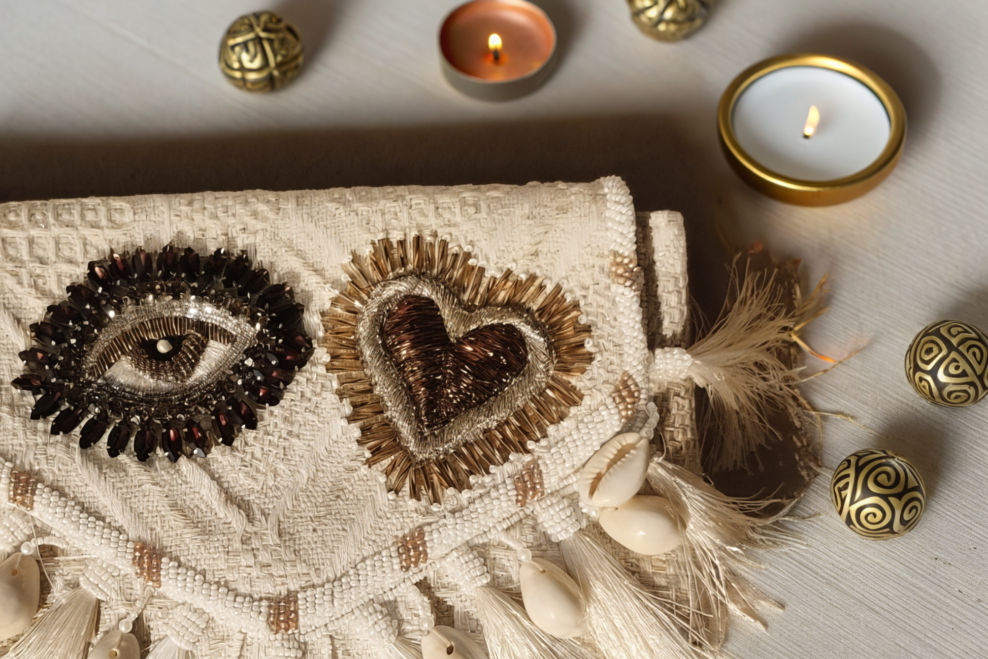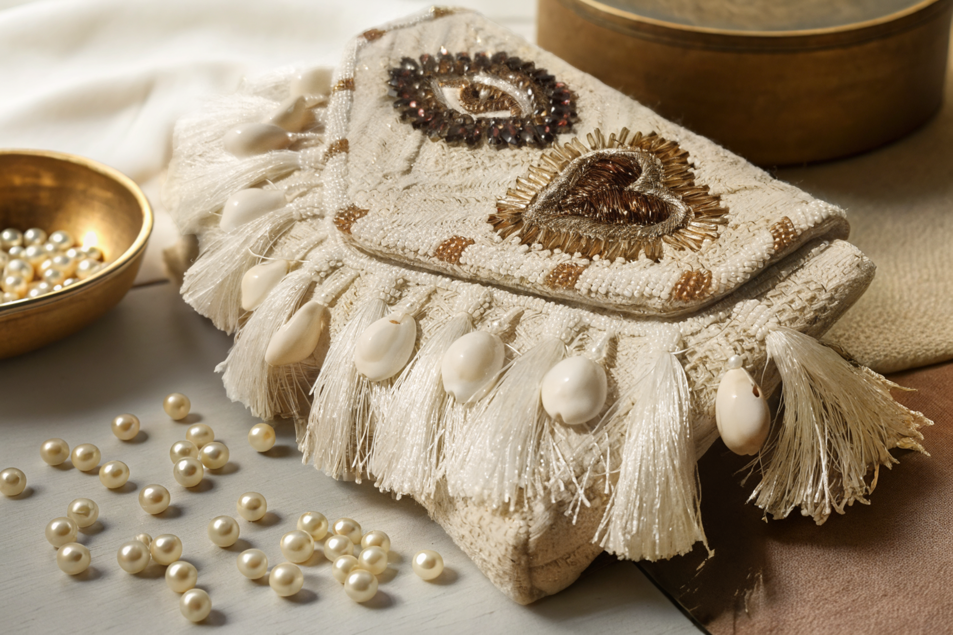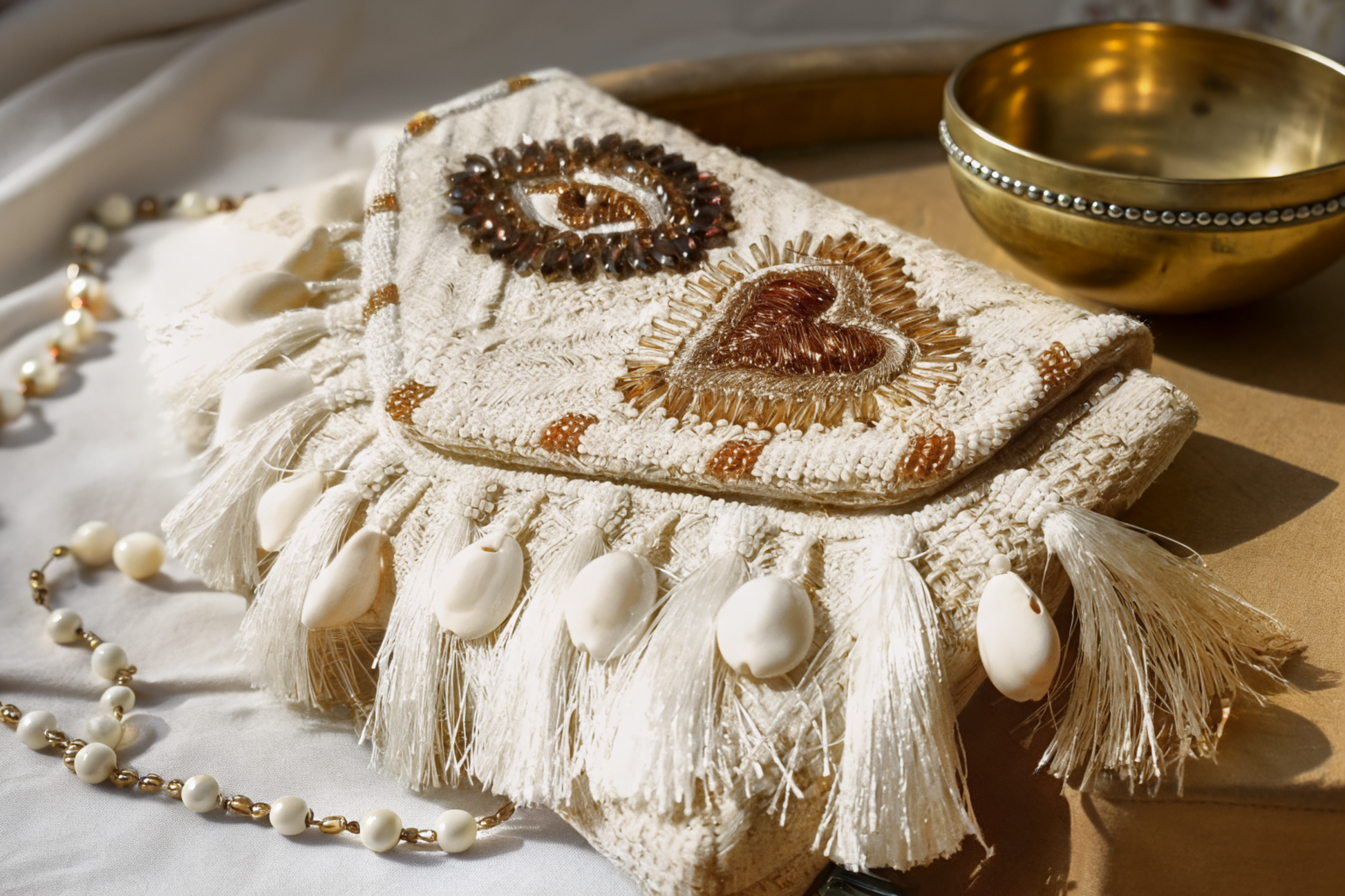 The base is structured yet soft to hold, with a magnetic flap and cotton lining. It’s the kind of piece that turns heads — best paired with both easy daywear or layered festive looks. Wherever you carry it, it brings with it a mood: loud, happy, and deeply handmade.