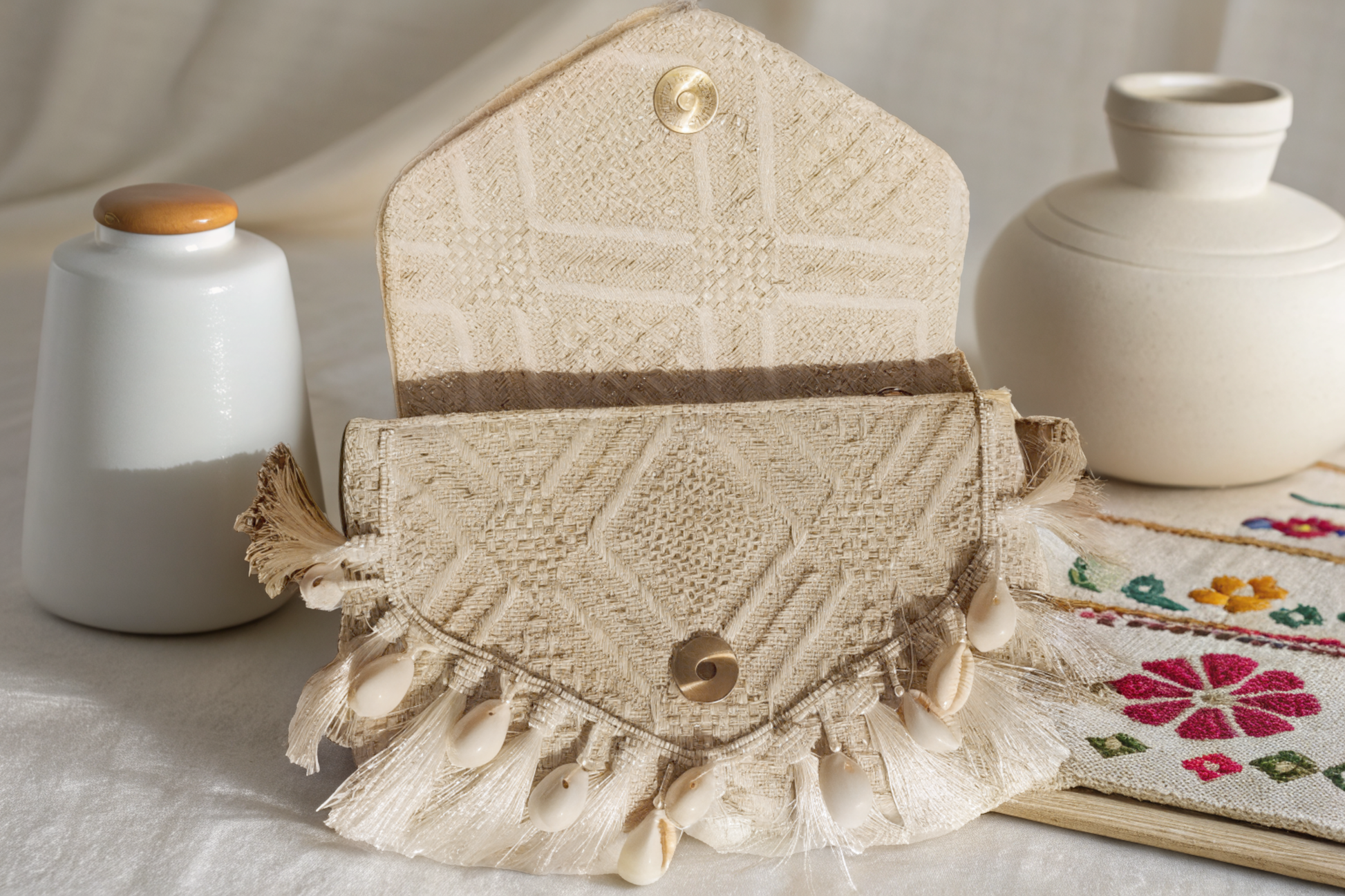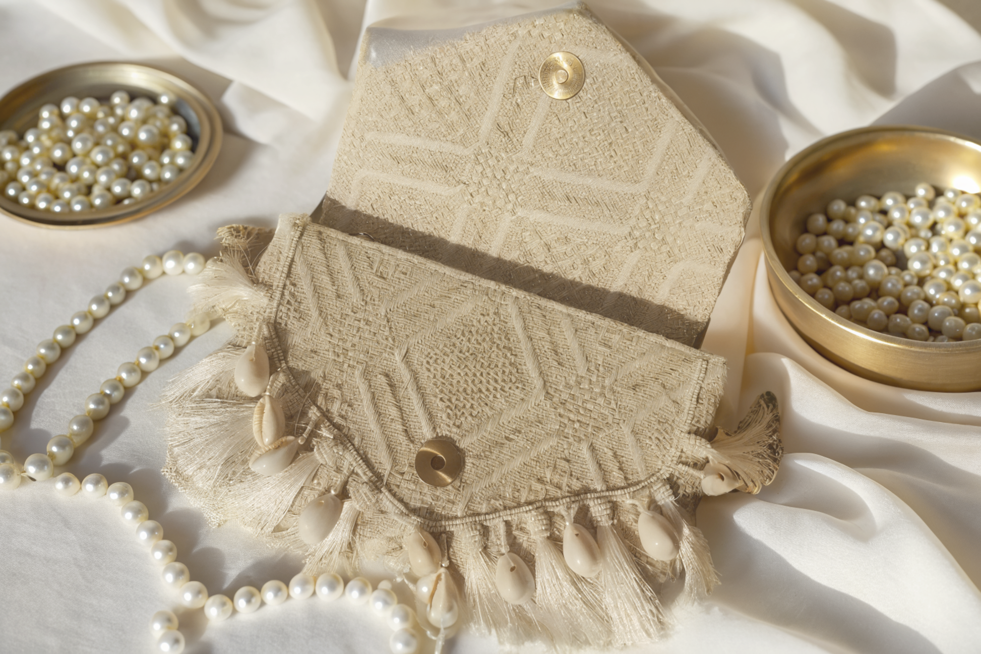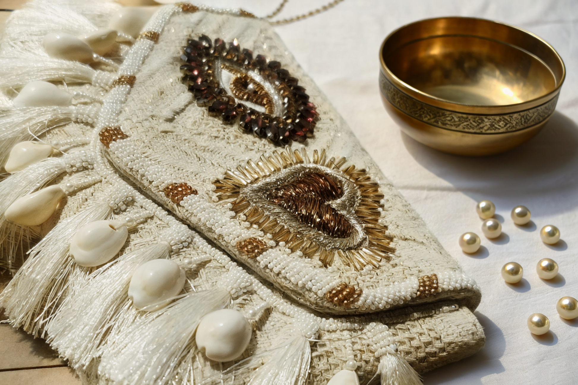 A celebration stitched in color — this handcrafted clutch brings the energy of bazaars, laughter, and sunlit streets right into your hands. Layered with mirror work, embroidery, metallic coins, and joyous thread tassels, it carries the spirit of festivity in every detail.