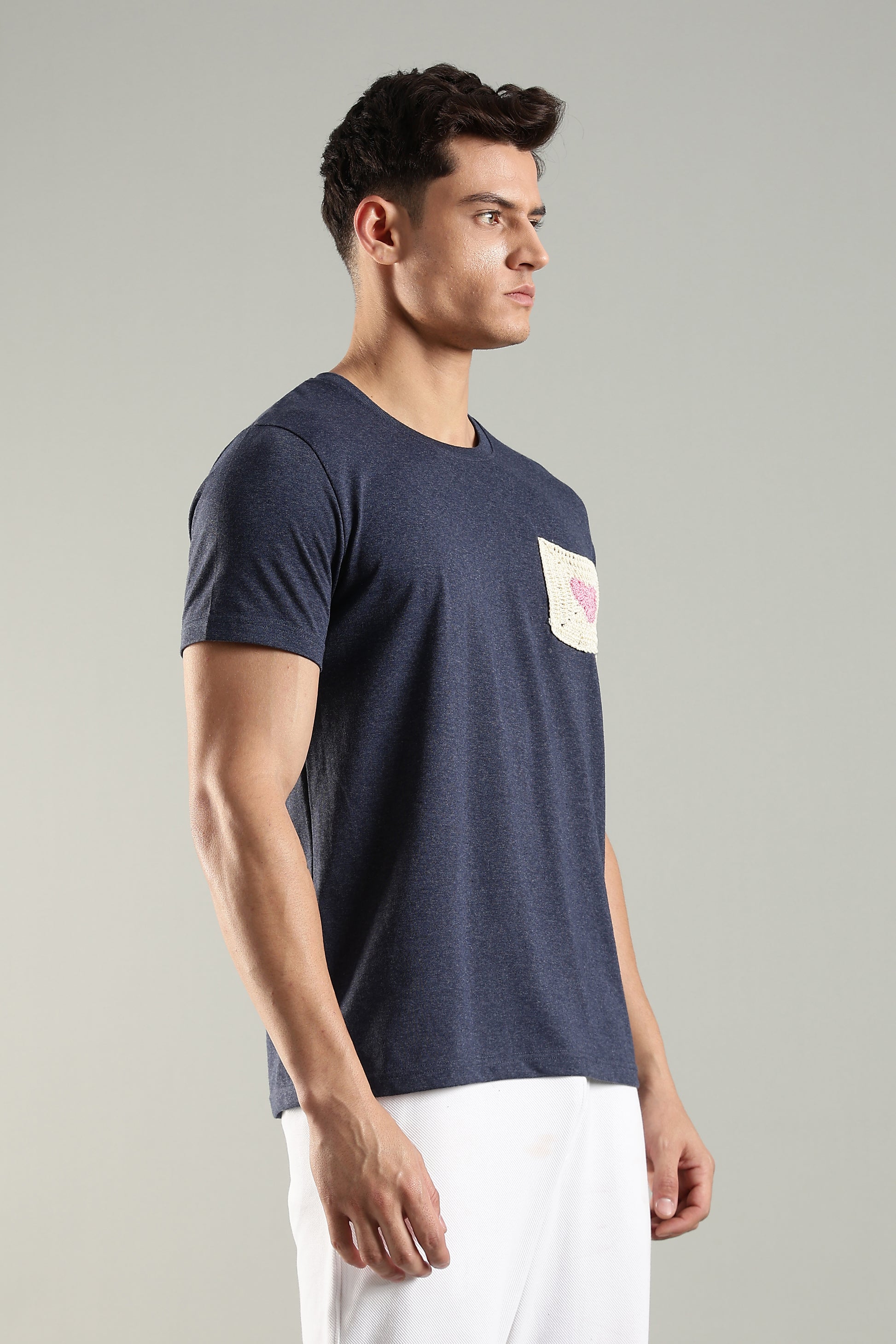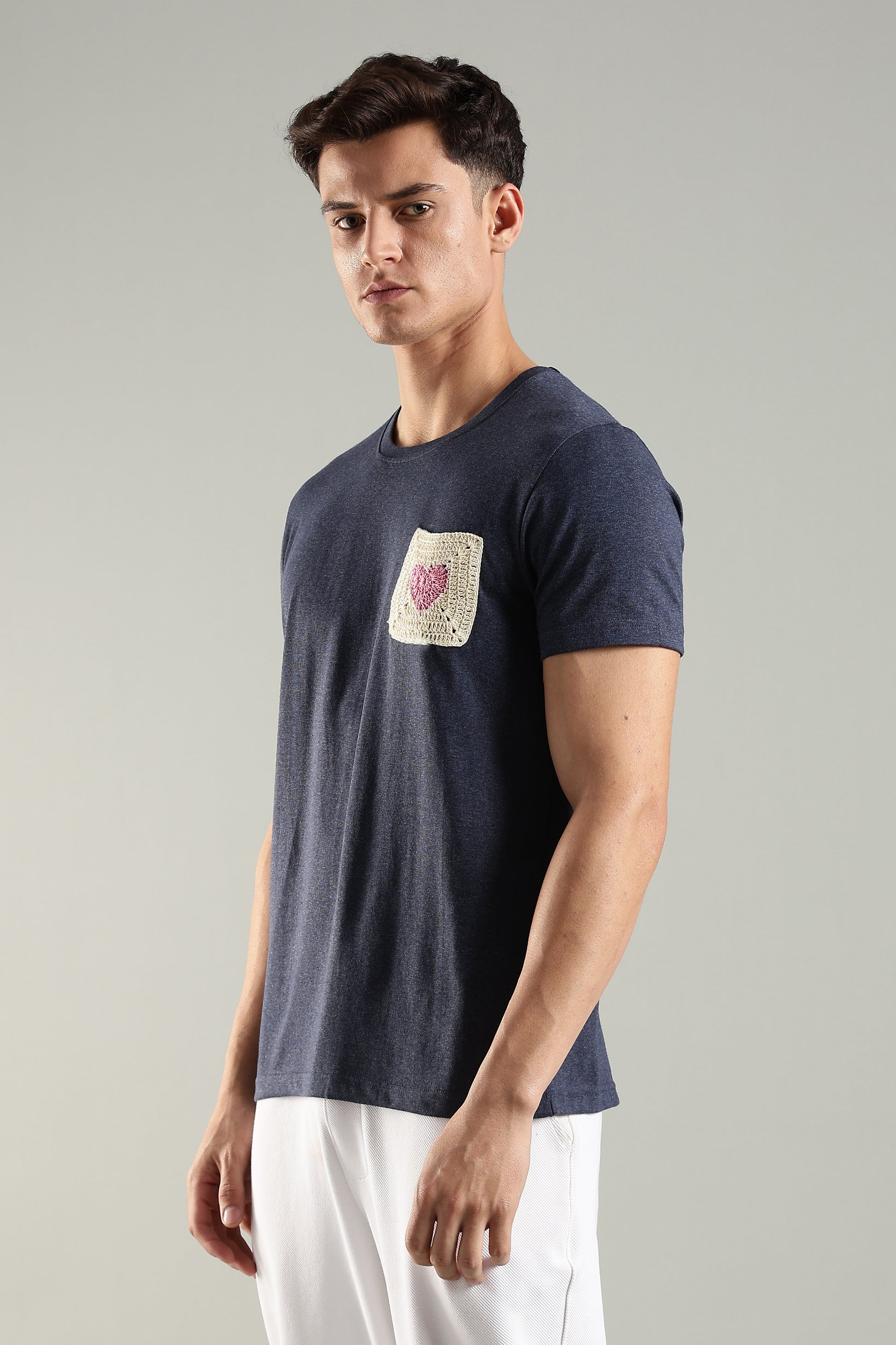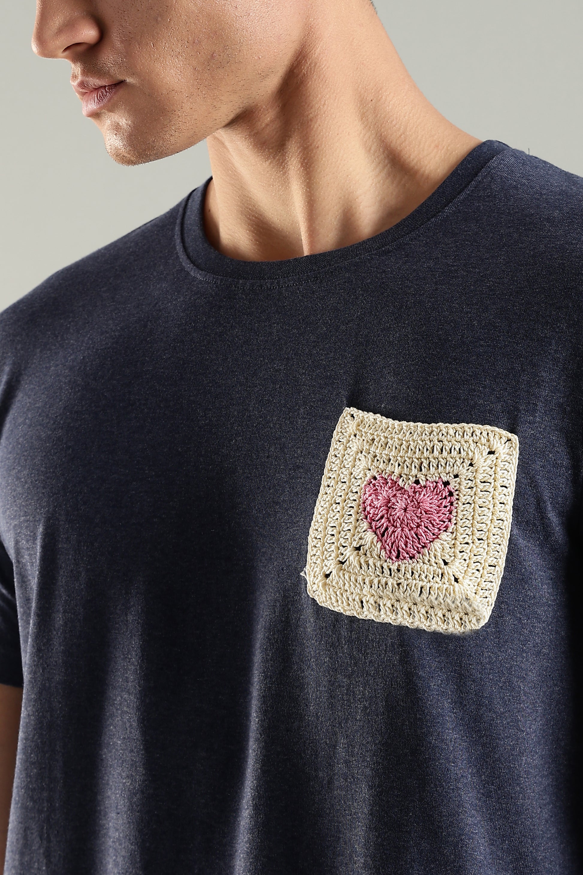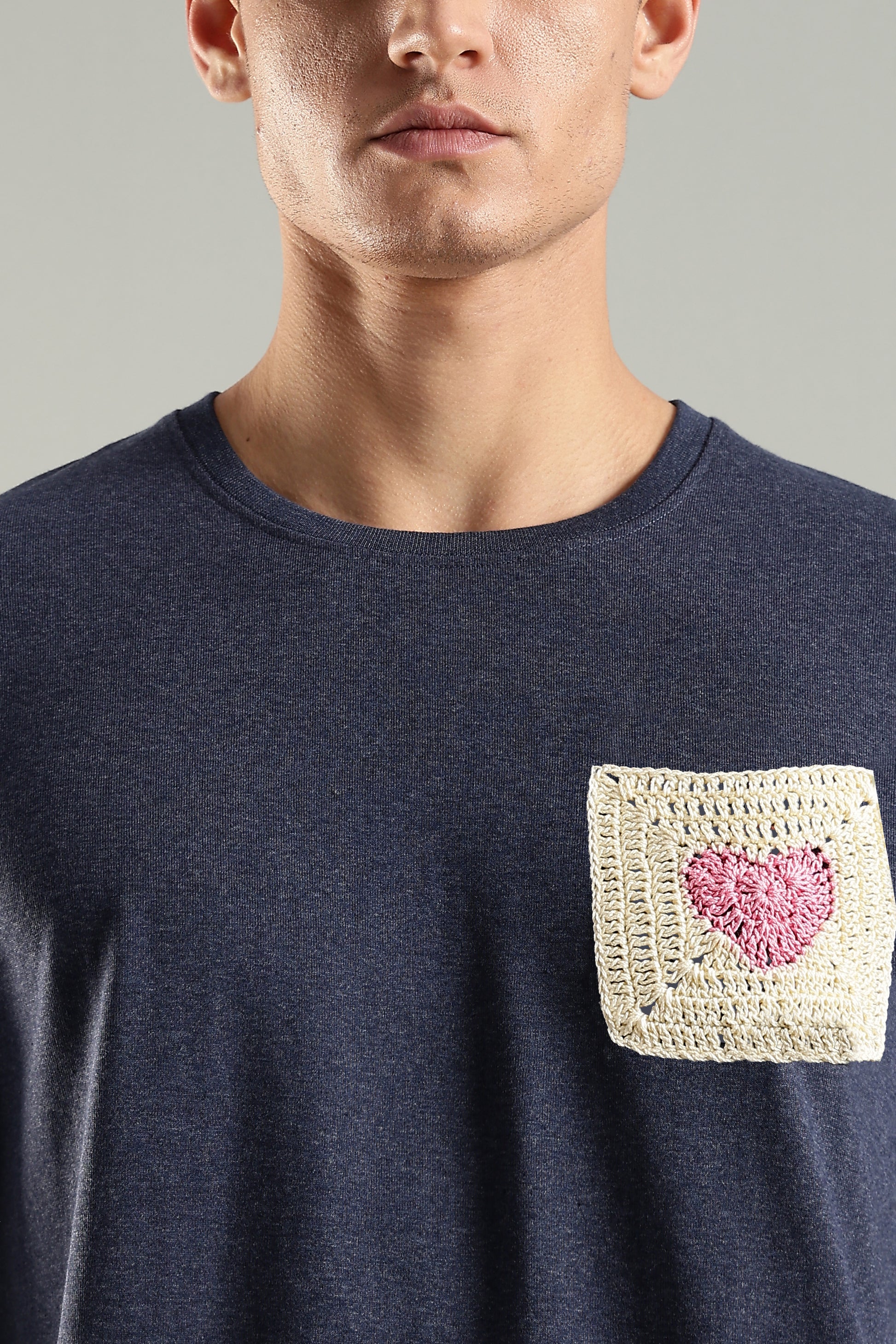 Denim Blue Sustainable T-Shirt with Hand-Crocheted Heart Pocket - Art Meets Responsibility