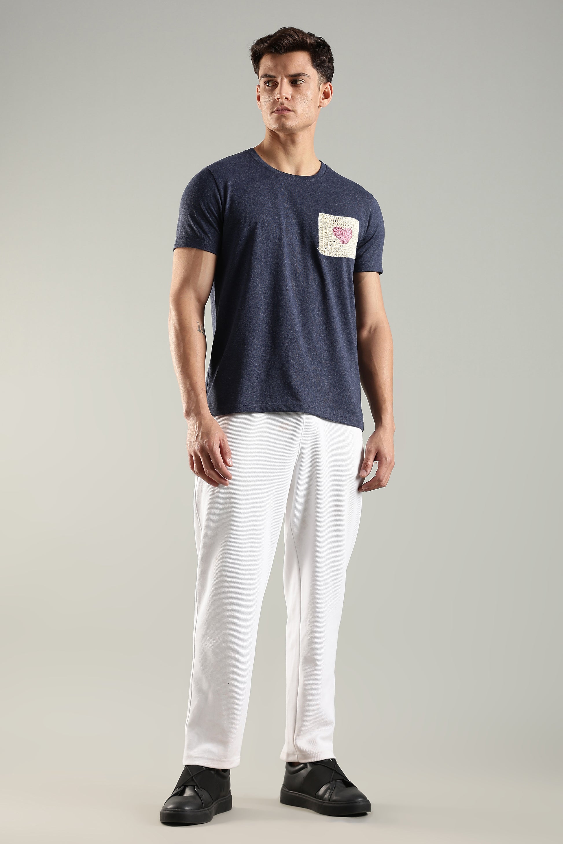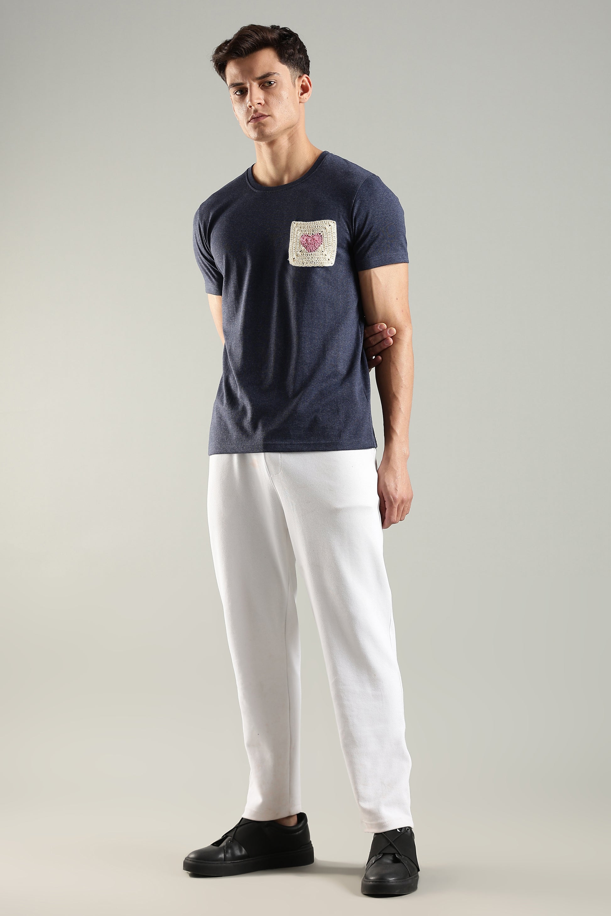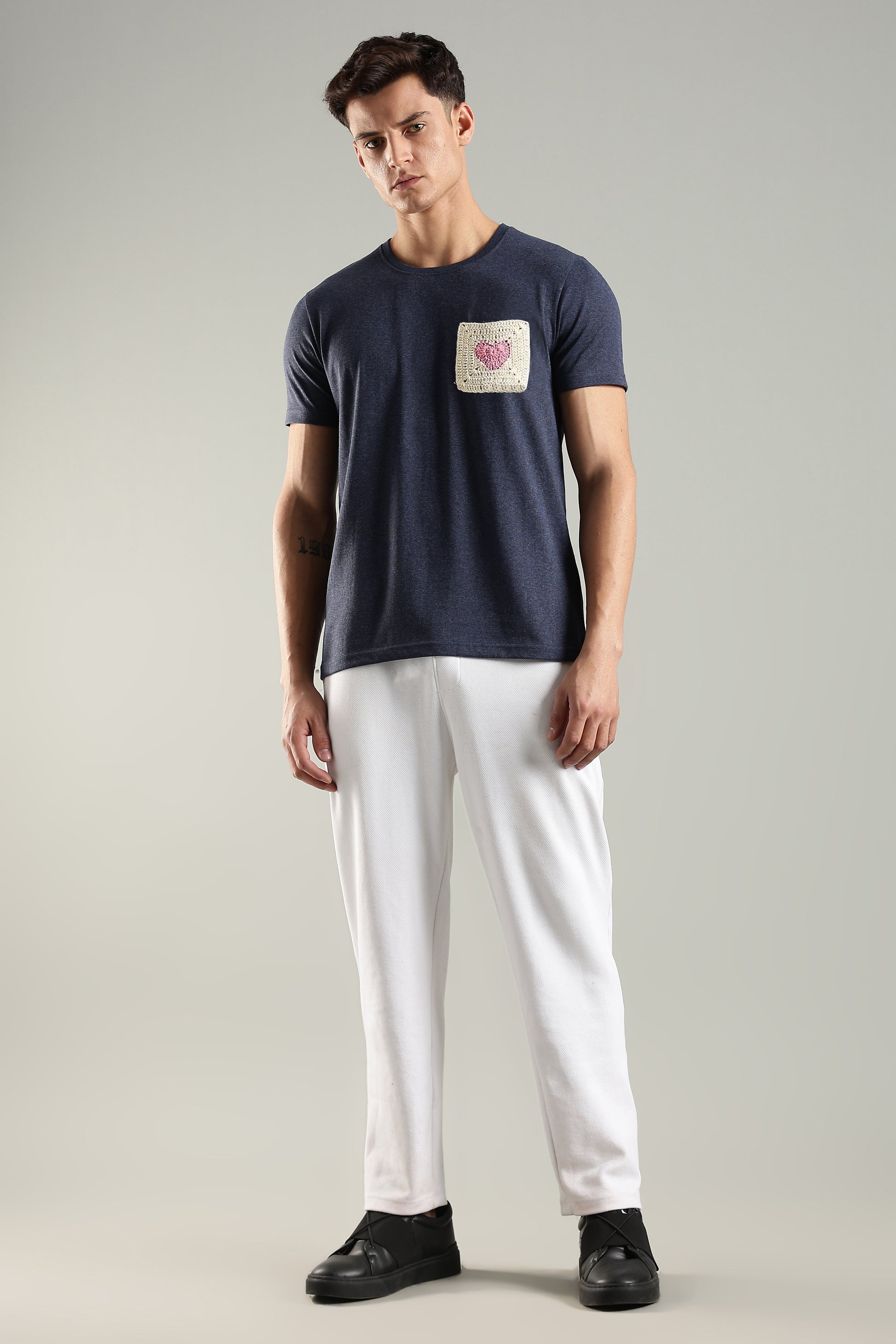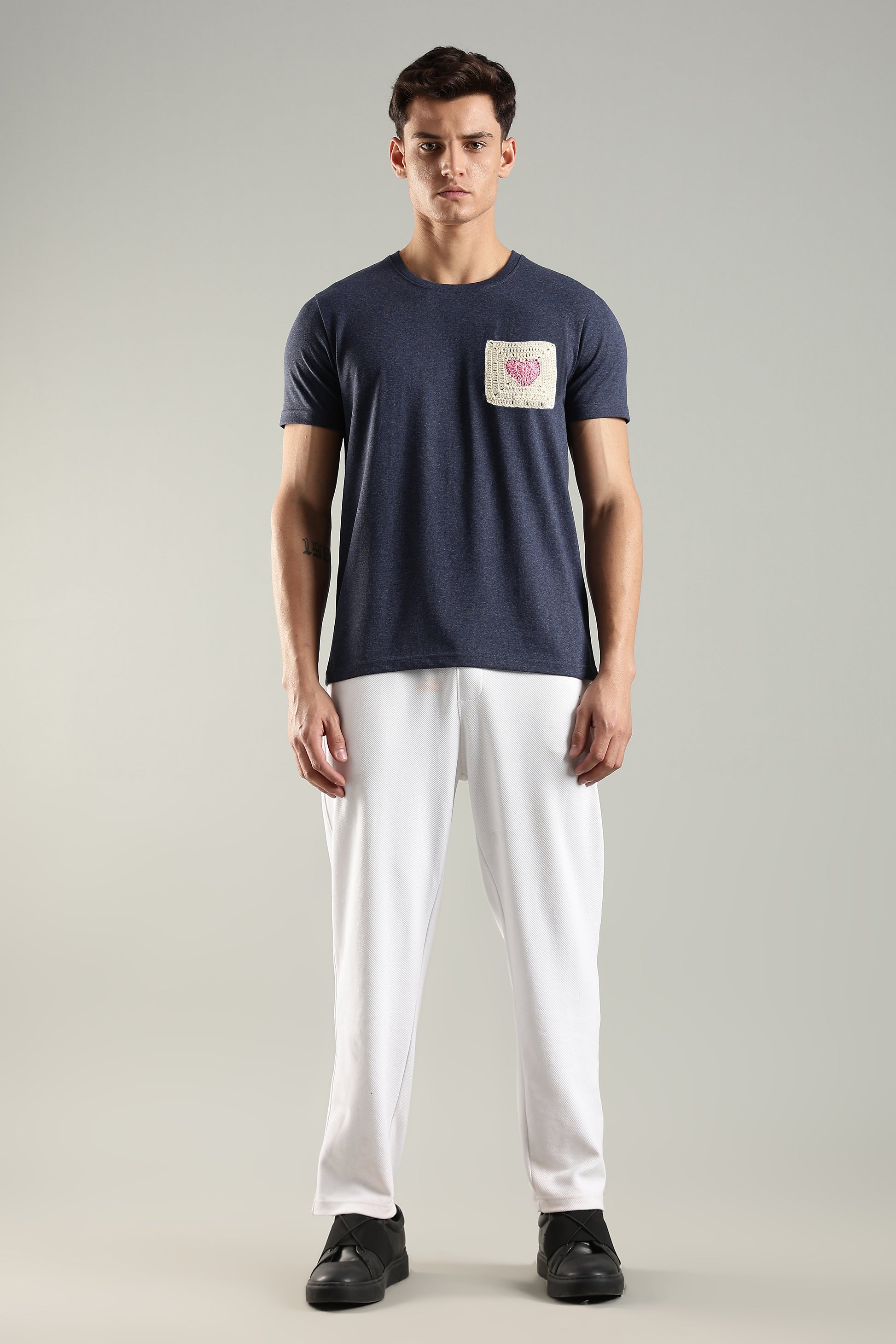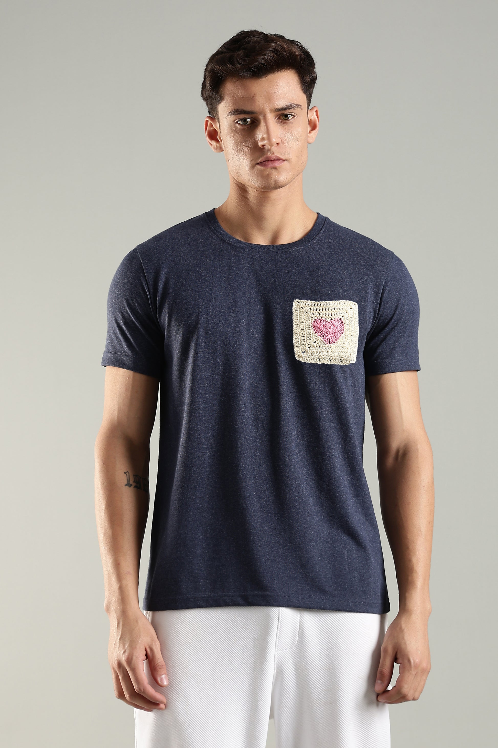 Denim Blue Sustainable T-Shirt with Hand-Crocheted Heart Pocket - Art Meets Responsibility