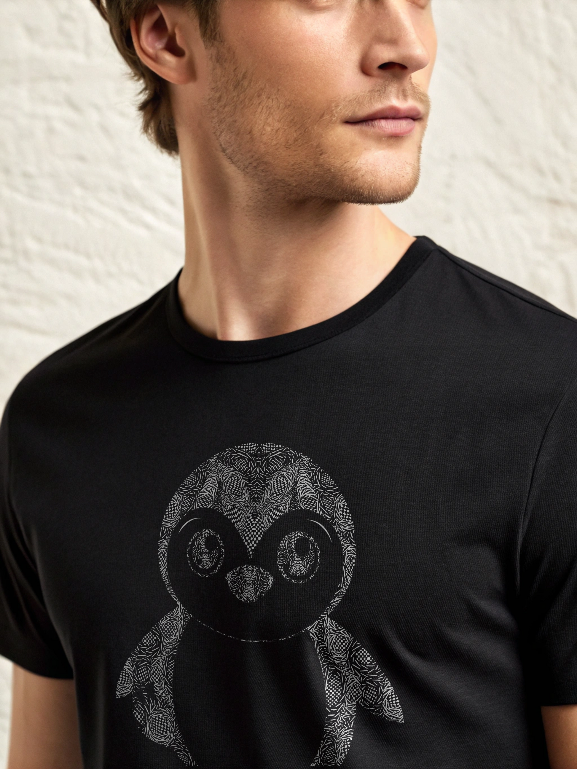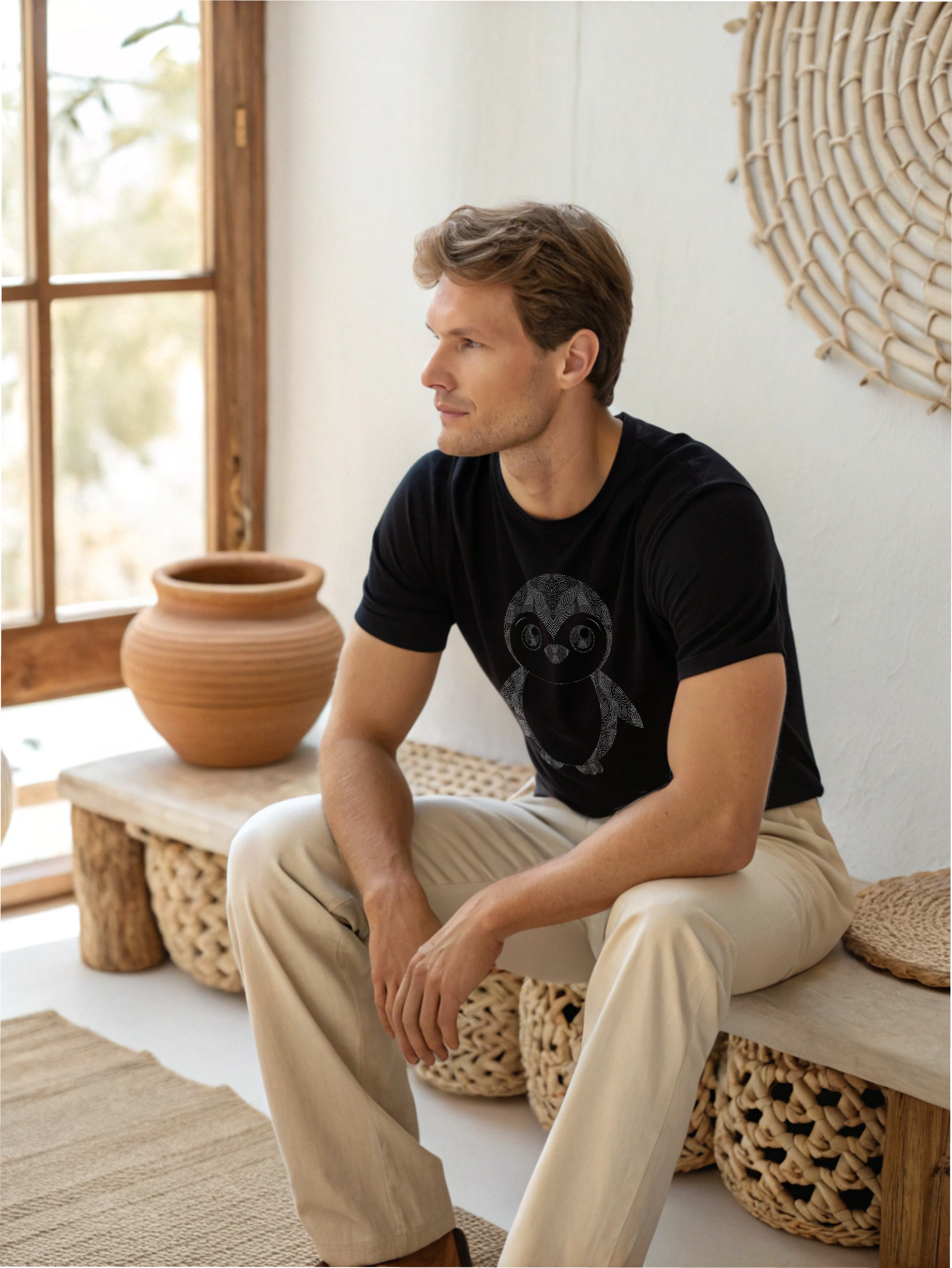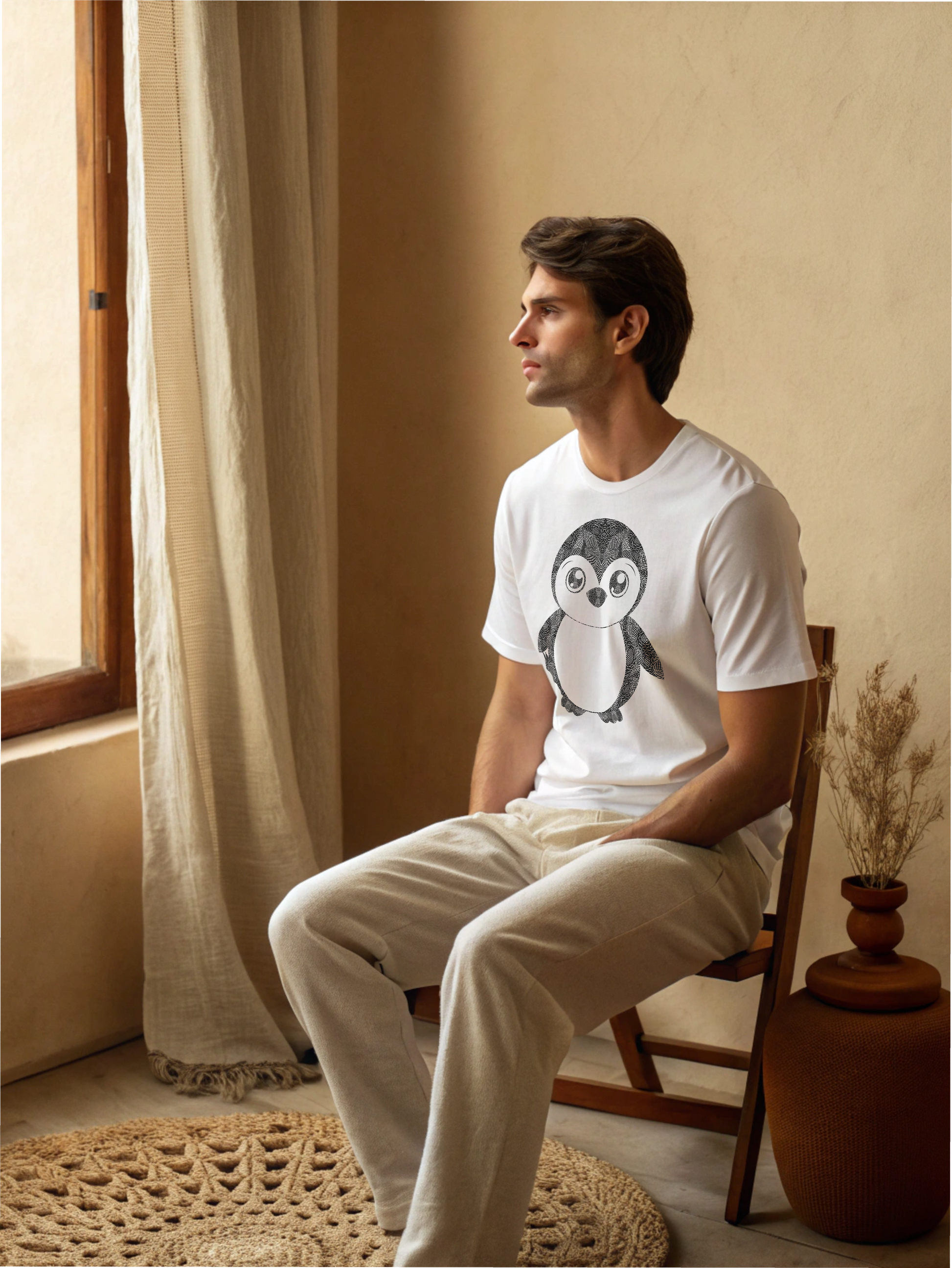 On a crisp white base, the penguin illustration feels like a quiet celebration of resilience. Its gaze is soft but knowing — for those who lead with quiet confidence and understand that warmth and strength can coexist. A refined essential with emotional depth.
