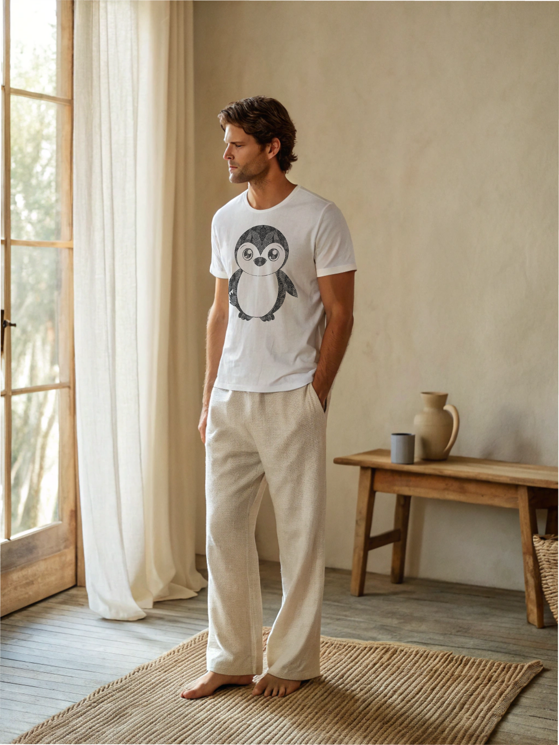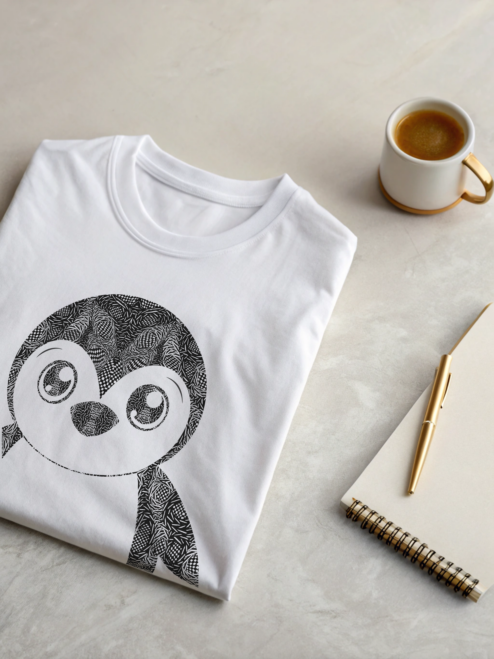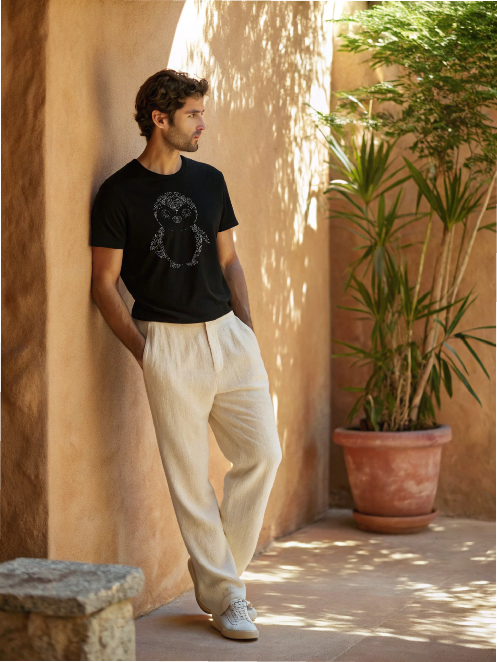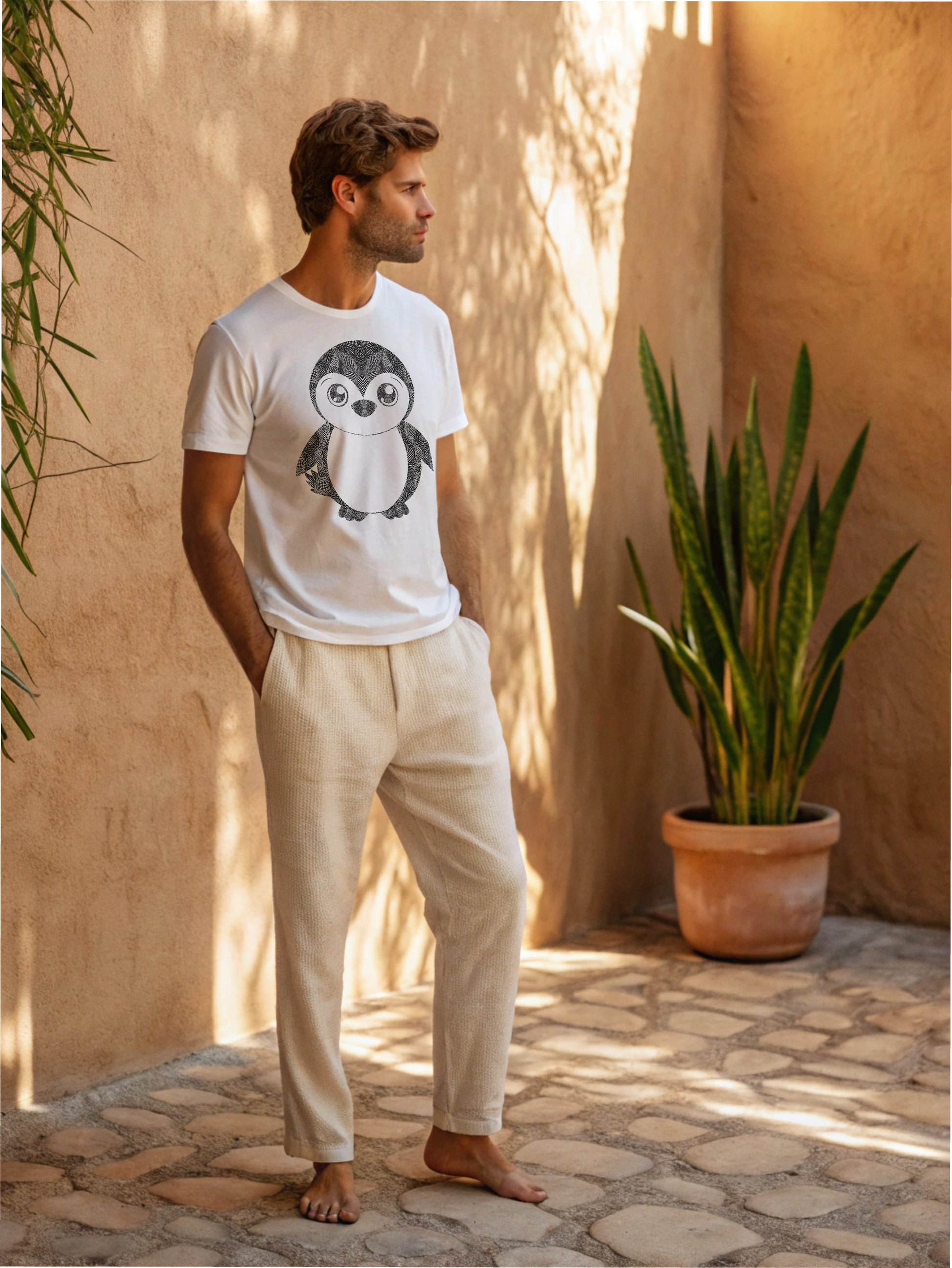 On a crisp white base, the penguin illustration feels like a quiet celebration of resilience. Its gaze is soft but knowing — for those who lead with quiet confidence and understand that warmth and strength can coexist. A refined essential with emotional depth.