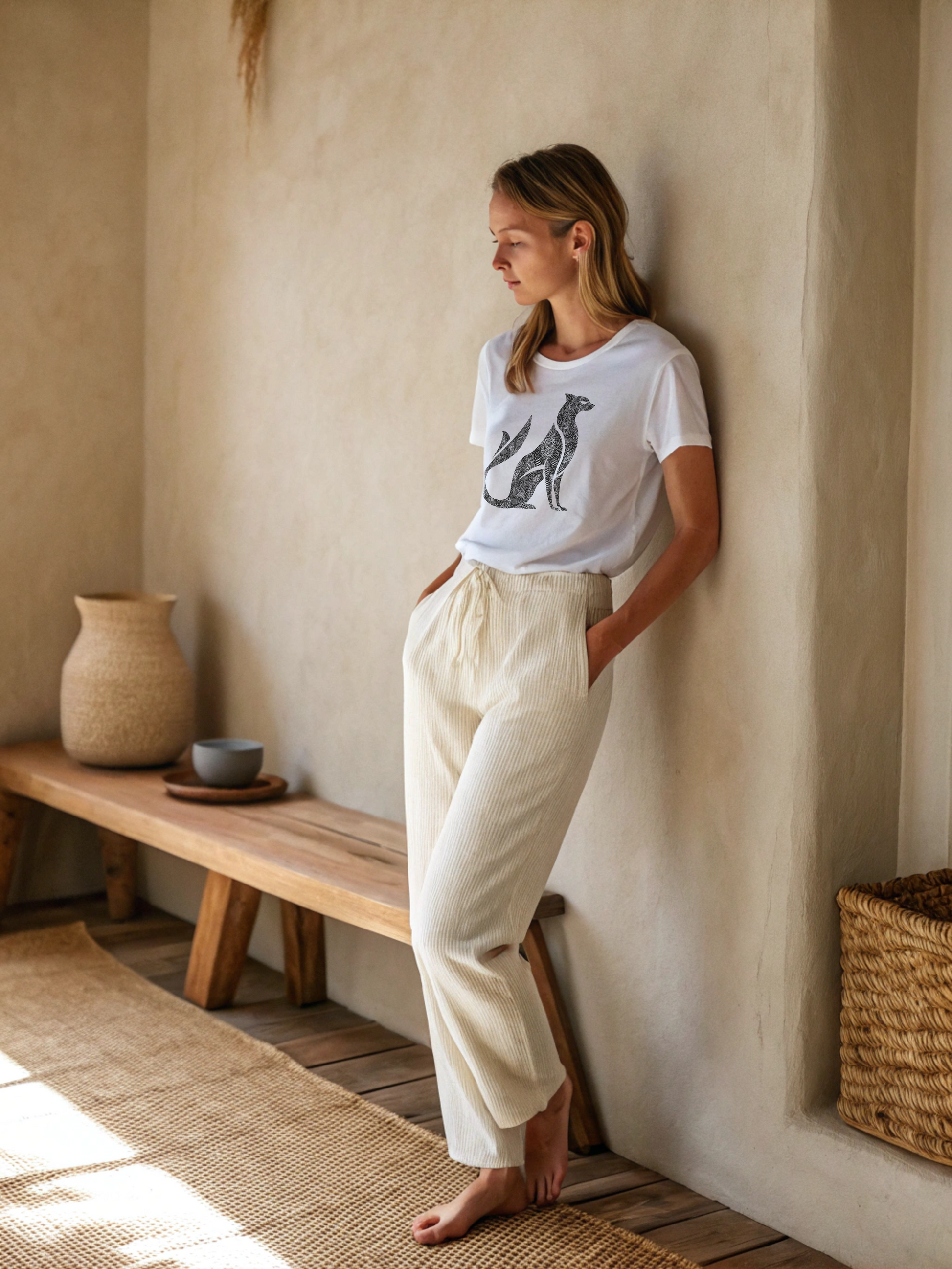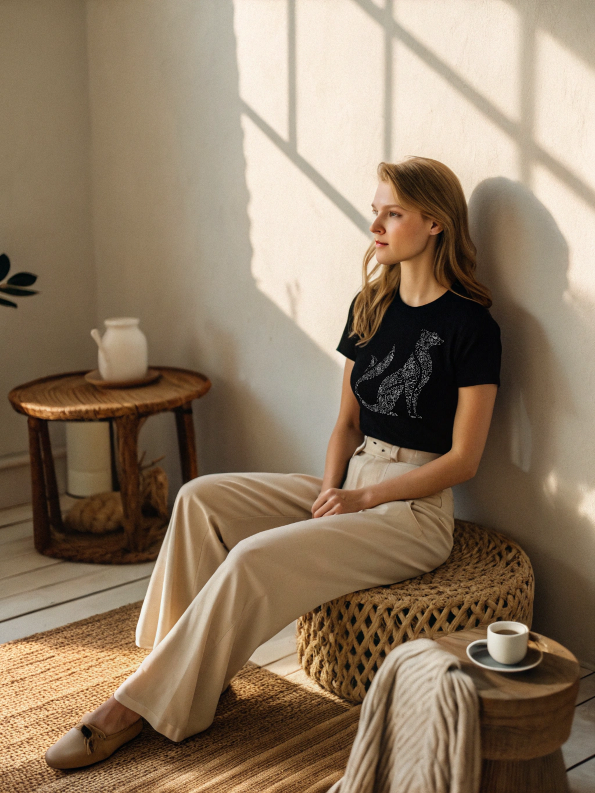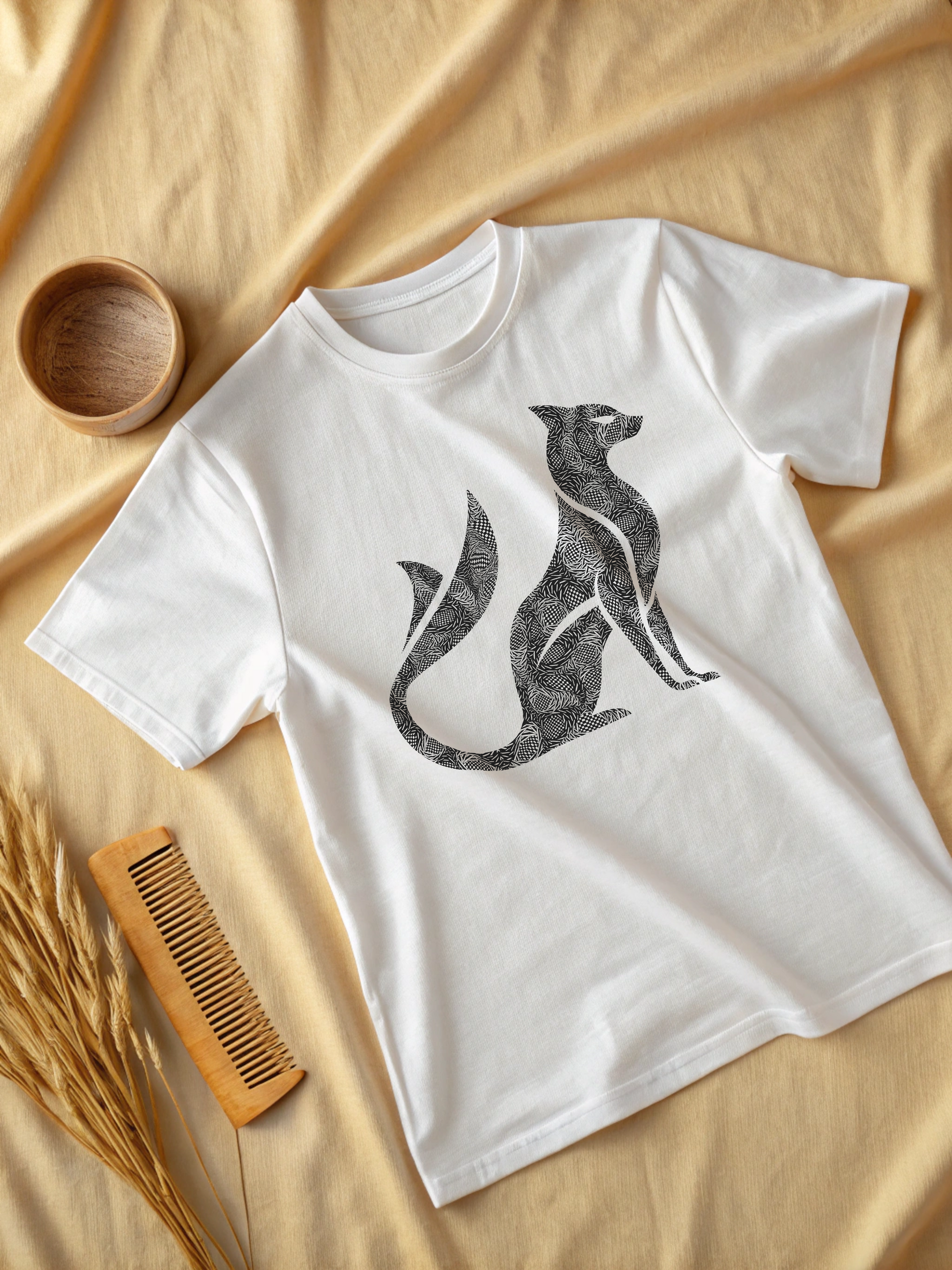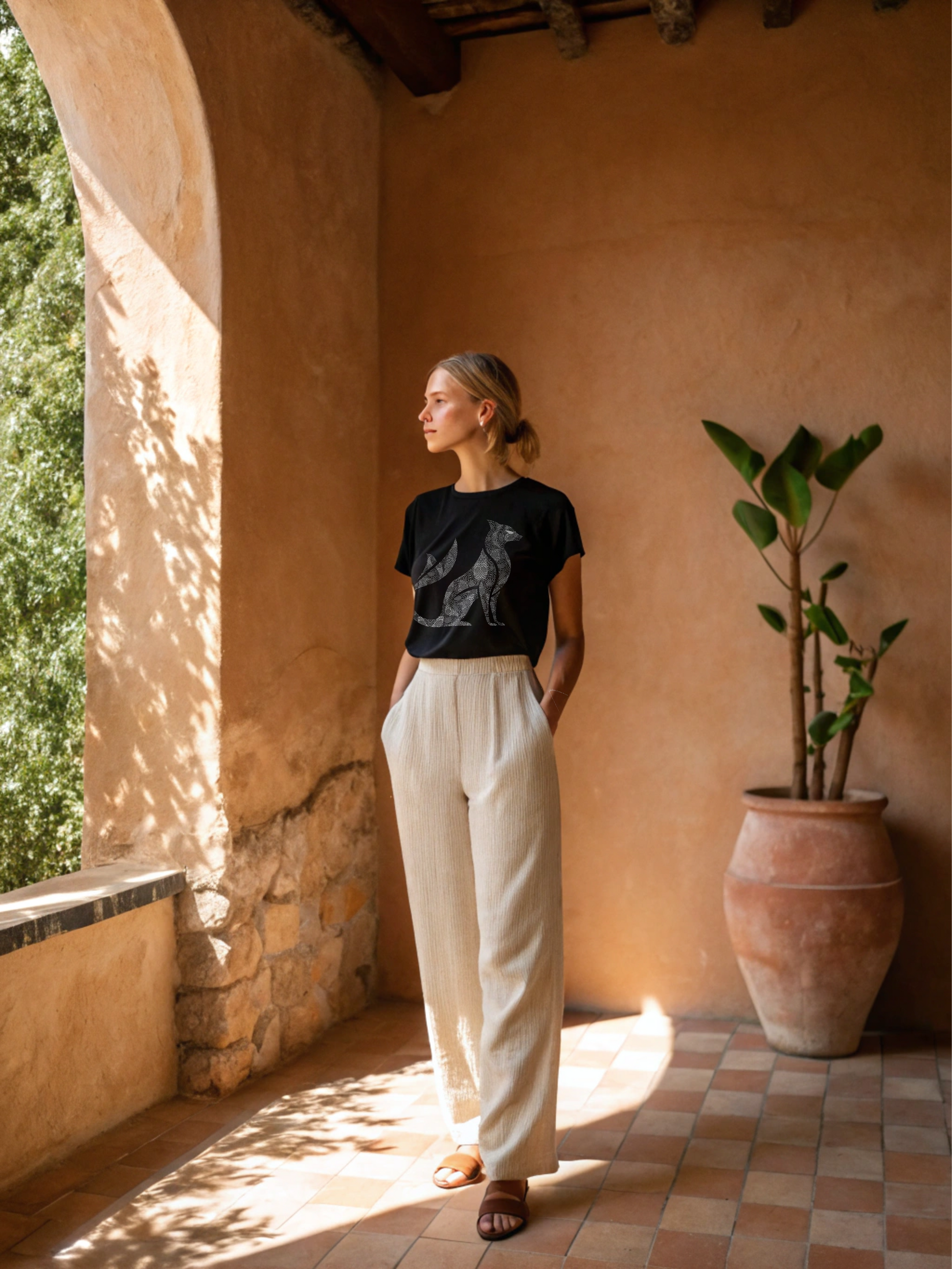 This white cotton t-shirt features a striking black line art cat, designed to balance simplicity with personality. Feminine without being fussy — easy to dress up or down. A staple for effortless, meaningful style.