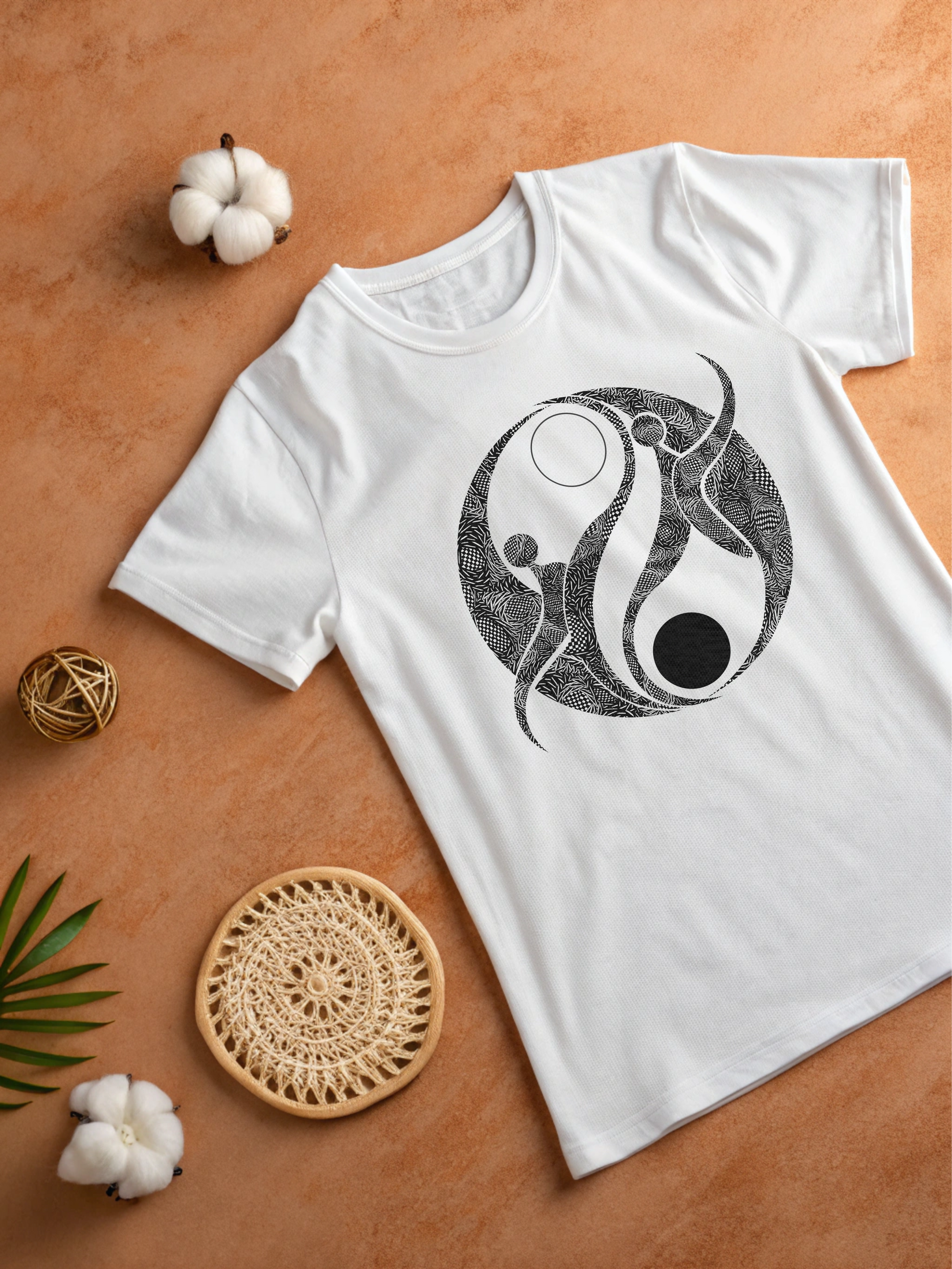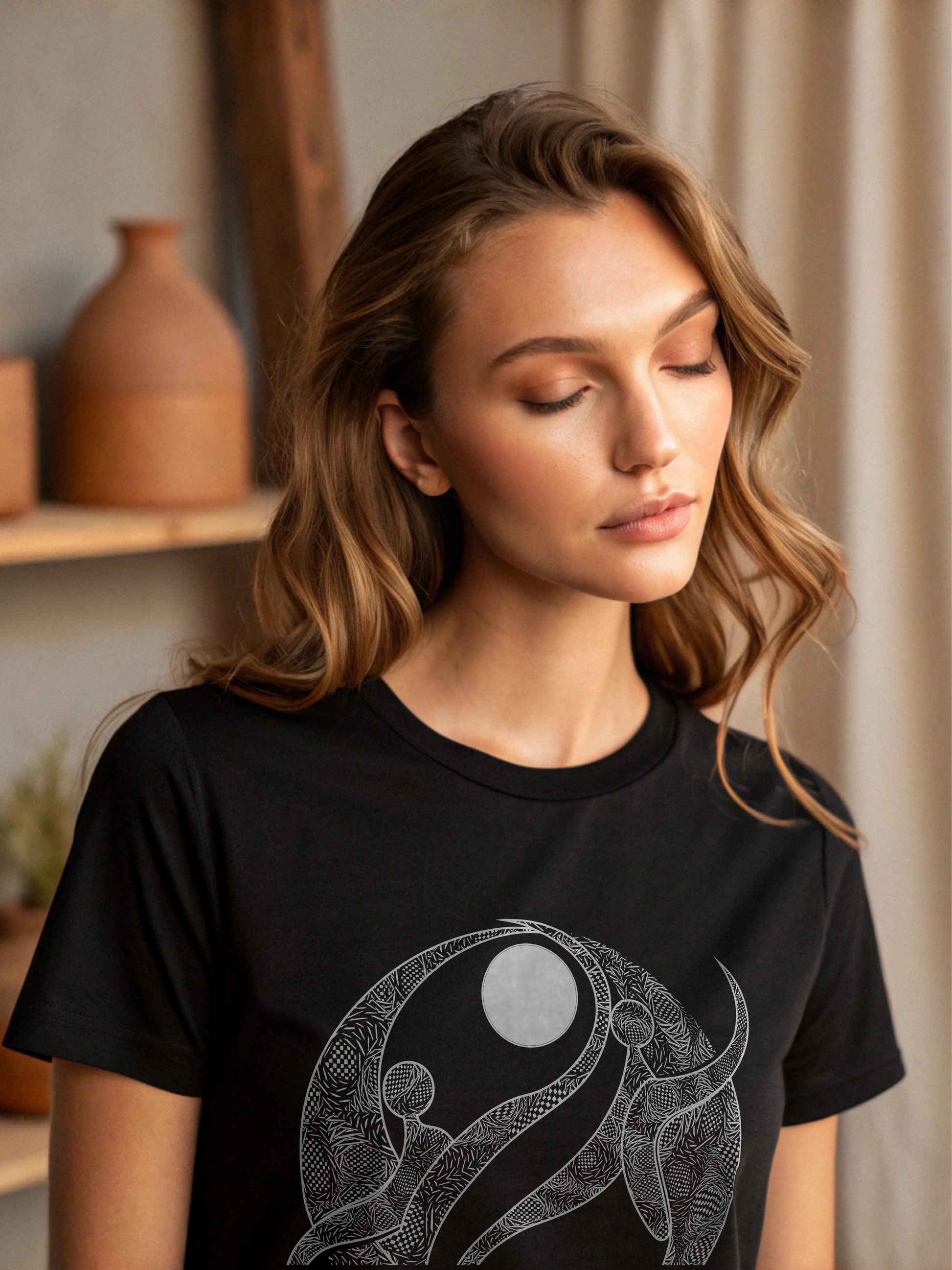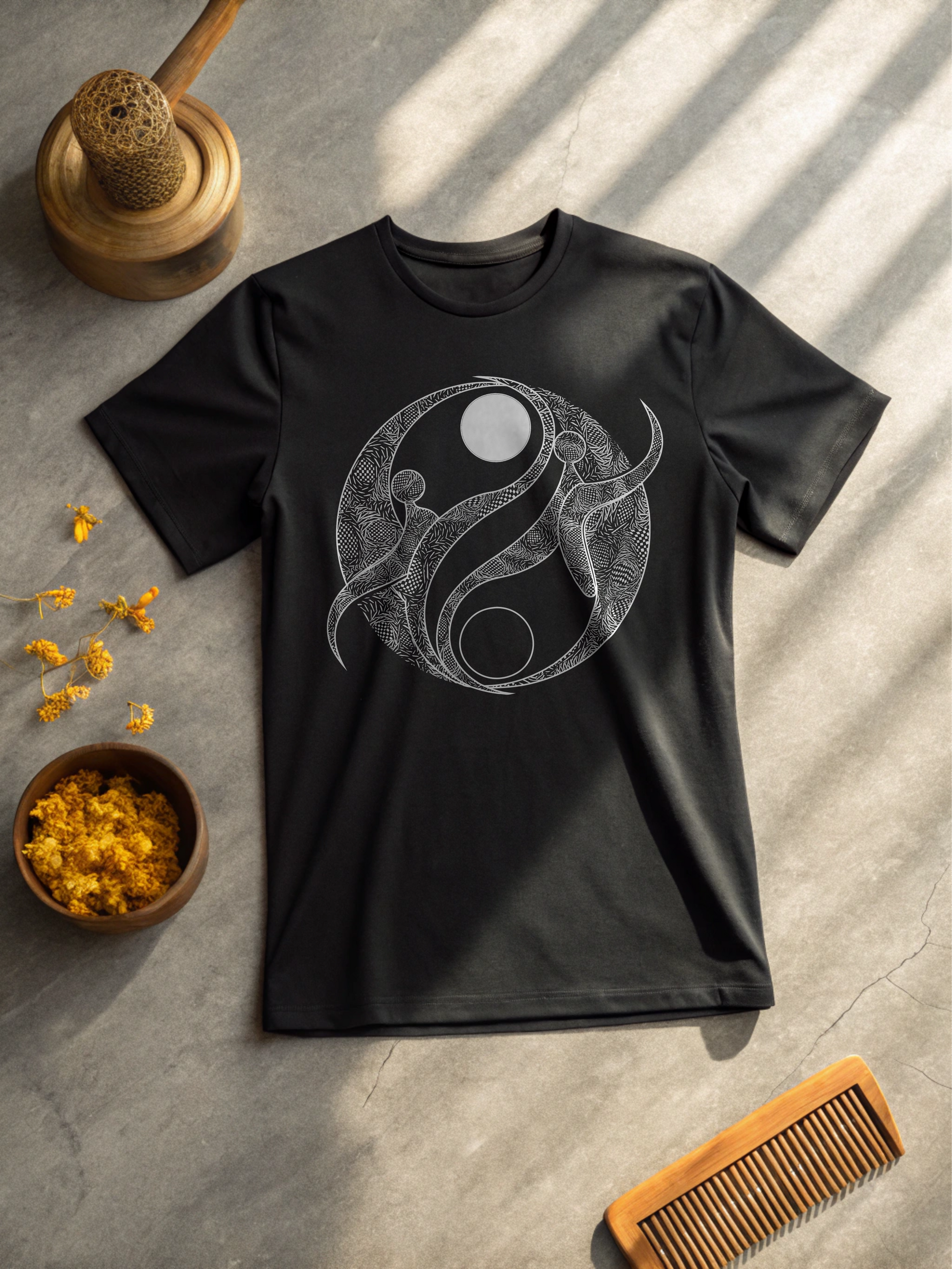 Set on white cotton, this design weaves a visual symphony of dancers, inked in delicate detail. A sun and moon keep watch as fluid forms meet structured linework — a perfect piece for women who lead with poise and presence.