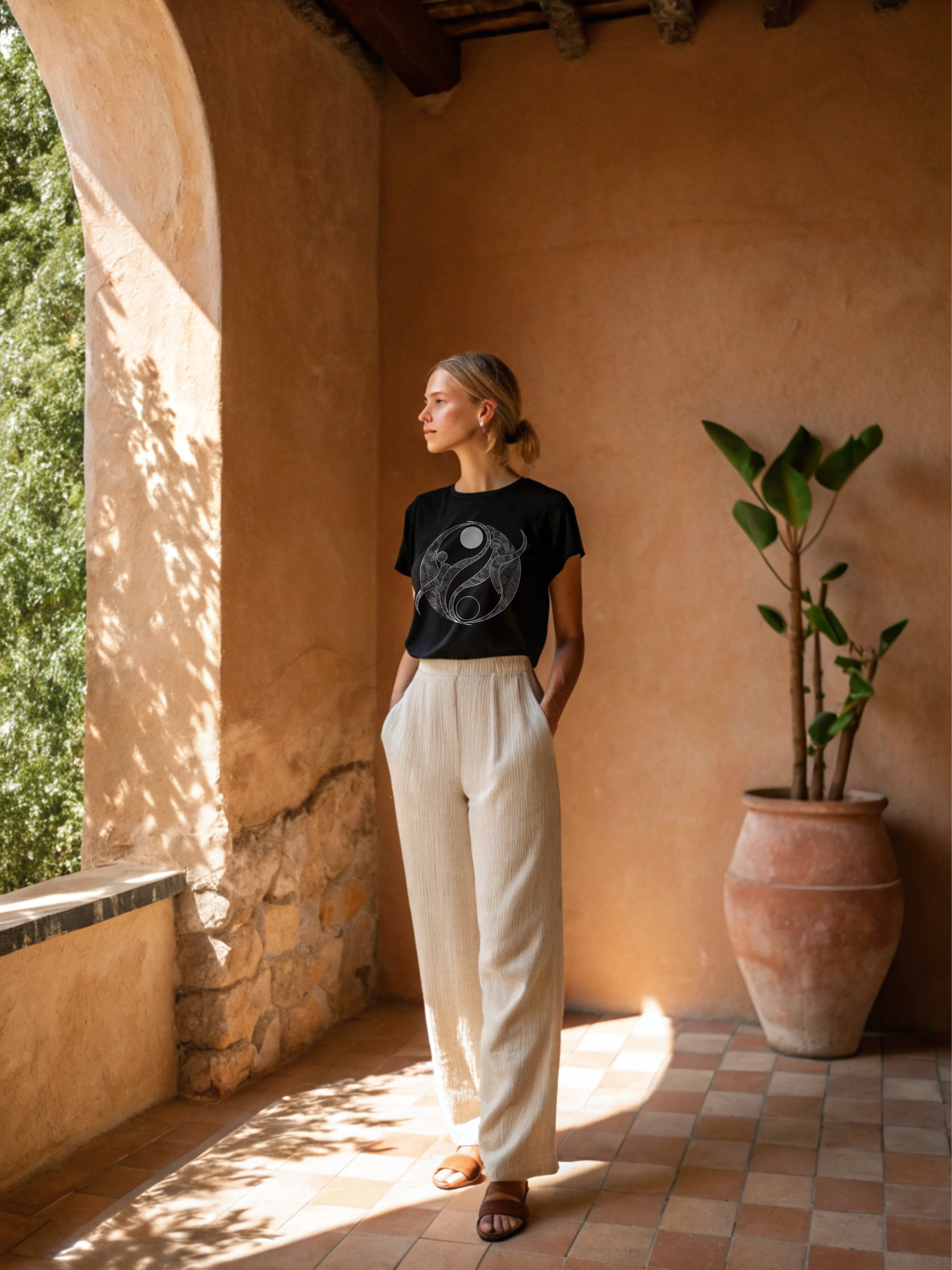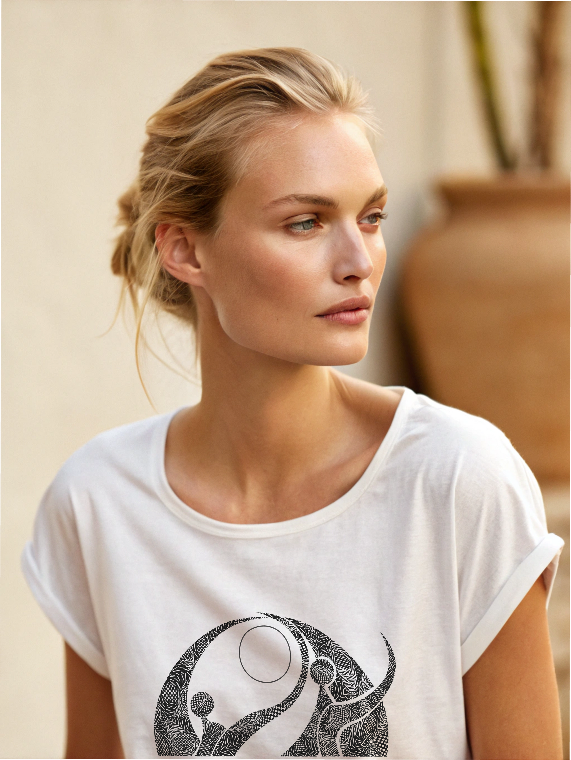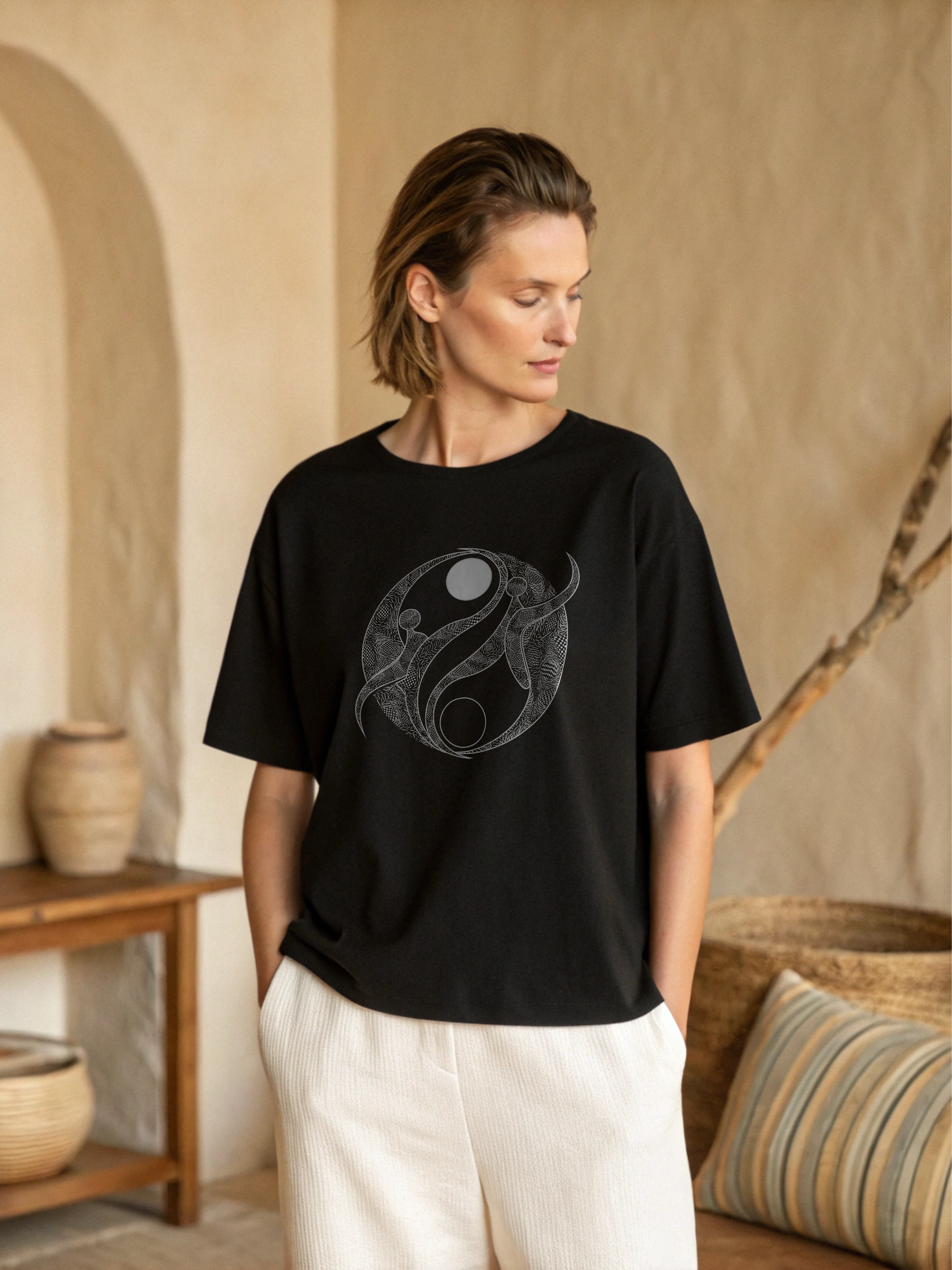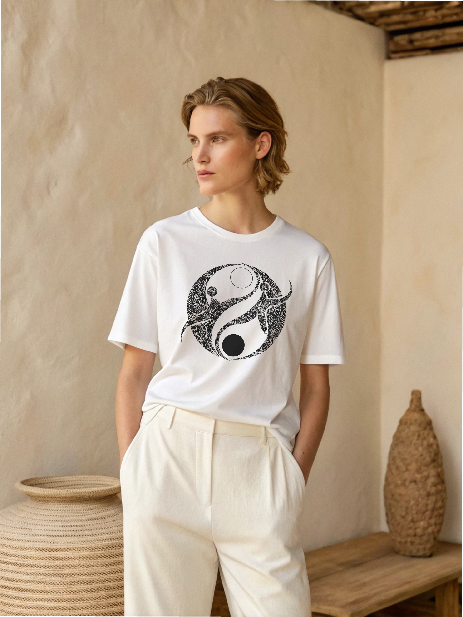 Set on white cotton, this design weaves a visual symphony of dancers, inked in delicate detail. A sun and moon keep watch as fluid forms meet structured linework — a perfect piece for women who lead with poise and presence.