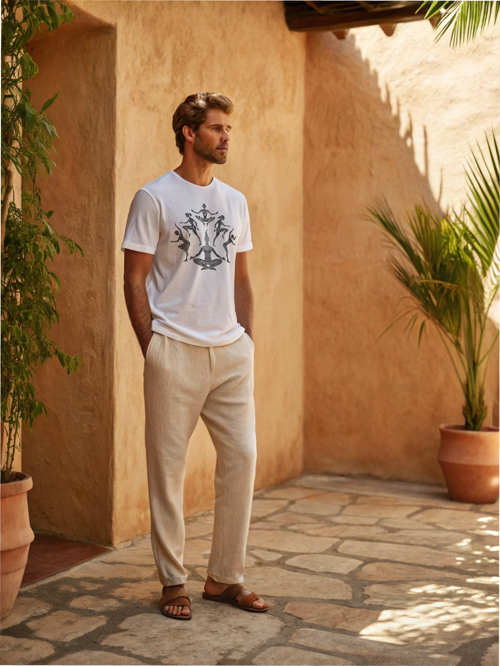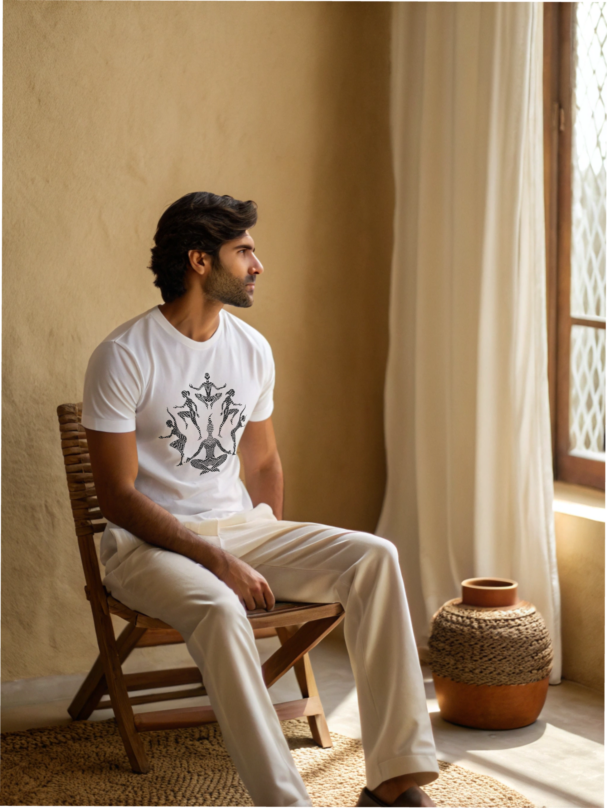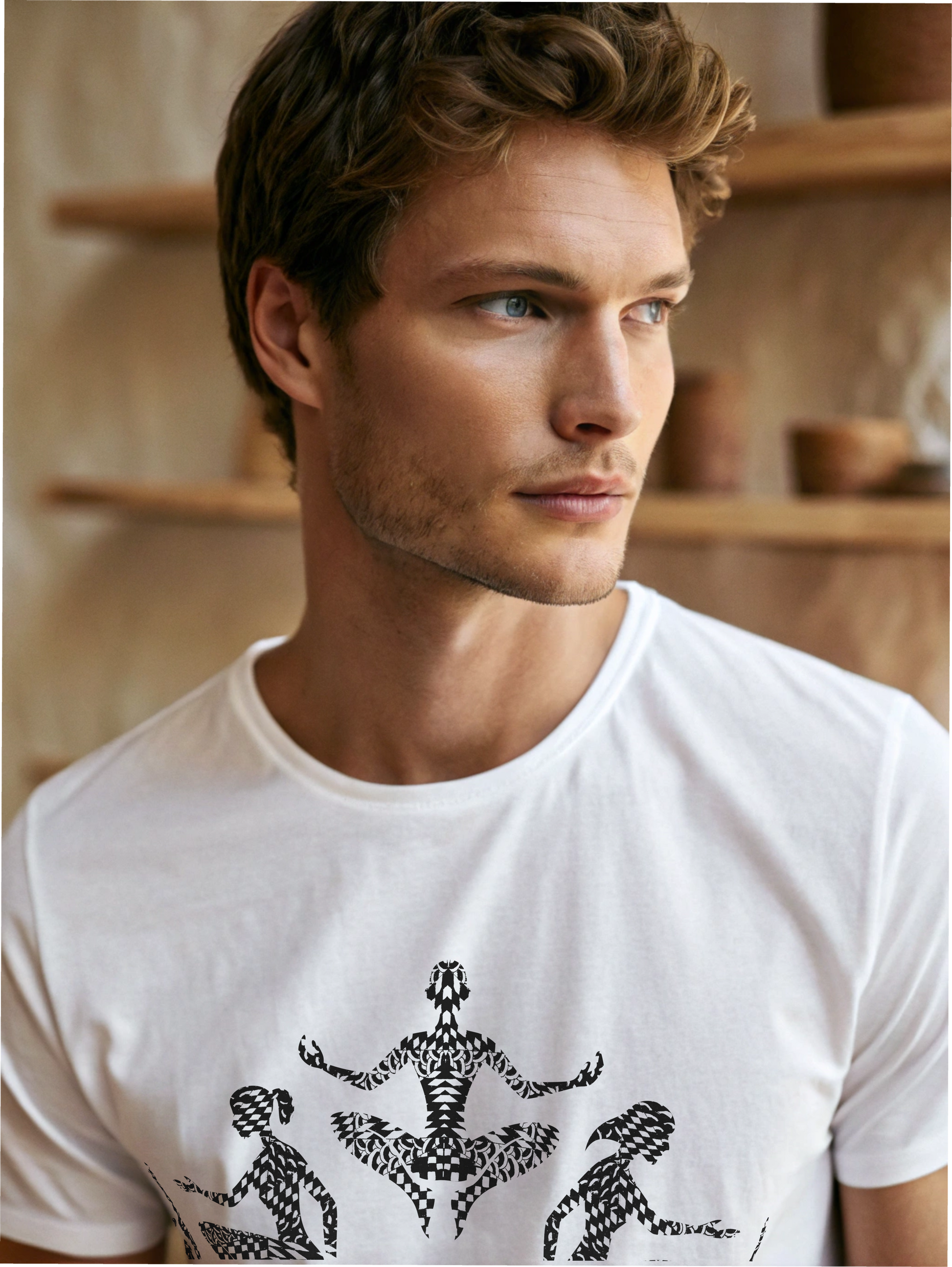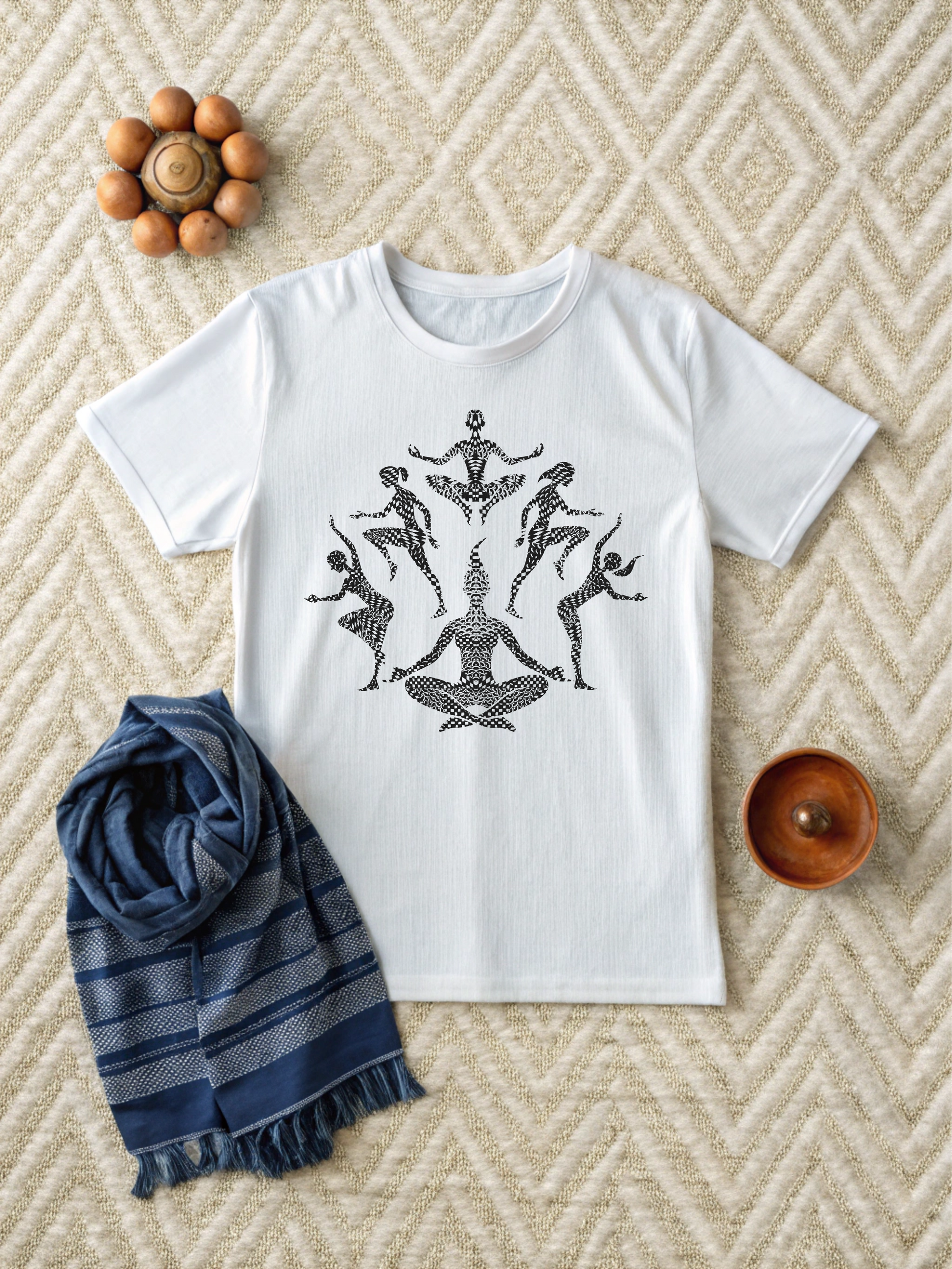 This crisp white tee features a hand-illustrated yoga pose — or sequence — rendered in mindful detail. Every line speaks of balance, breath, and quiet intention. For the man who values movement as meditation, and strength as something subtle.