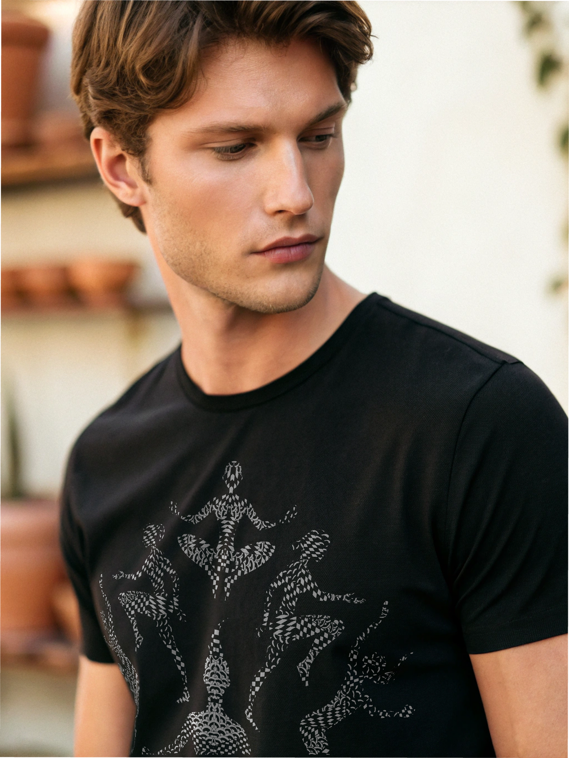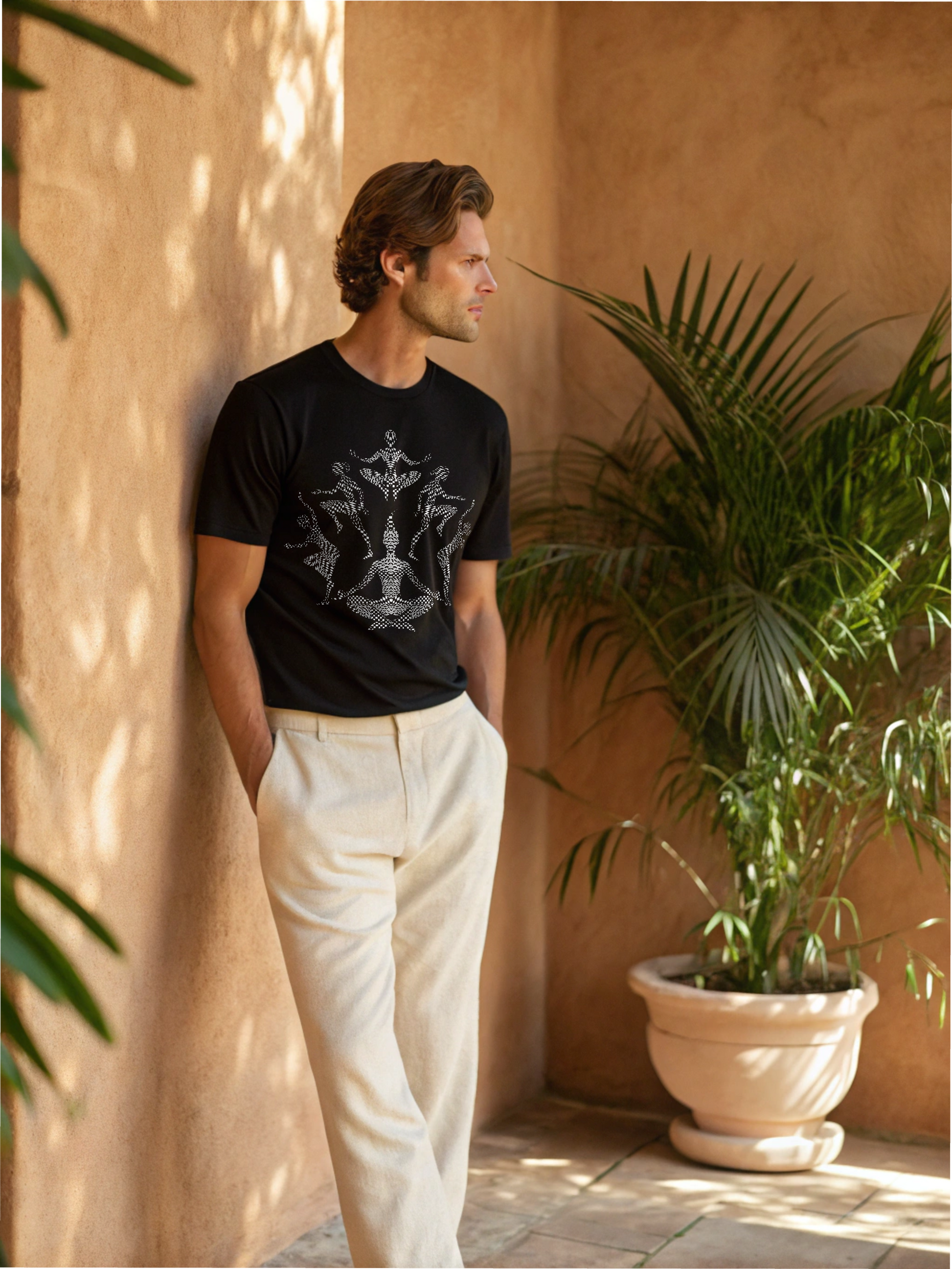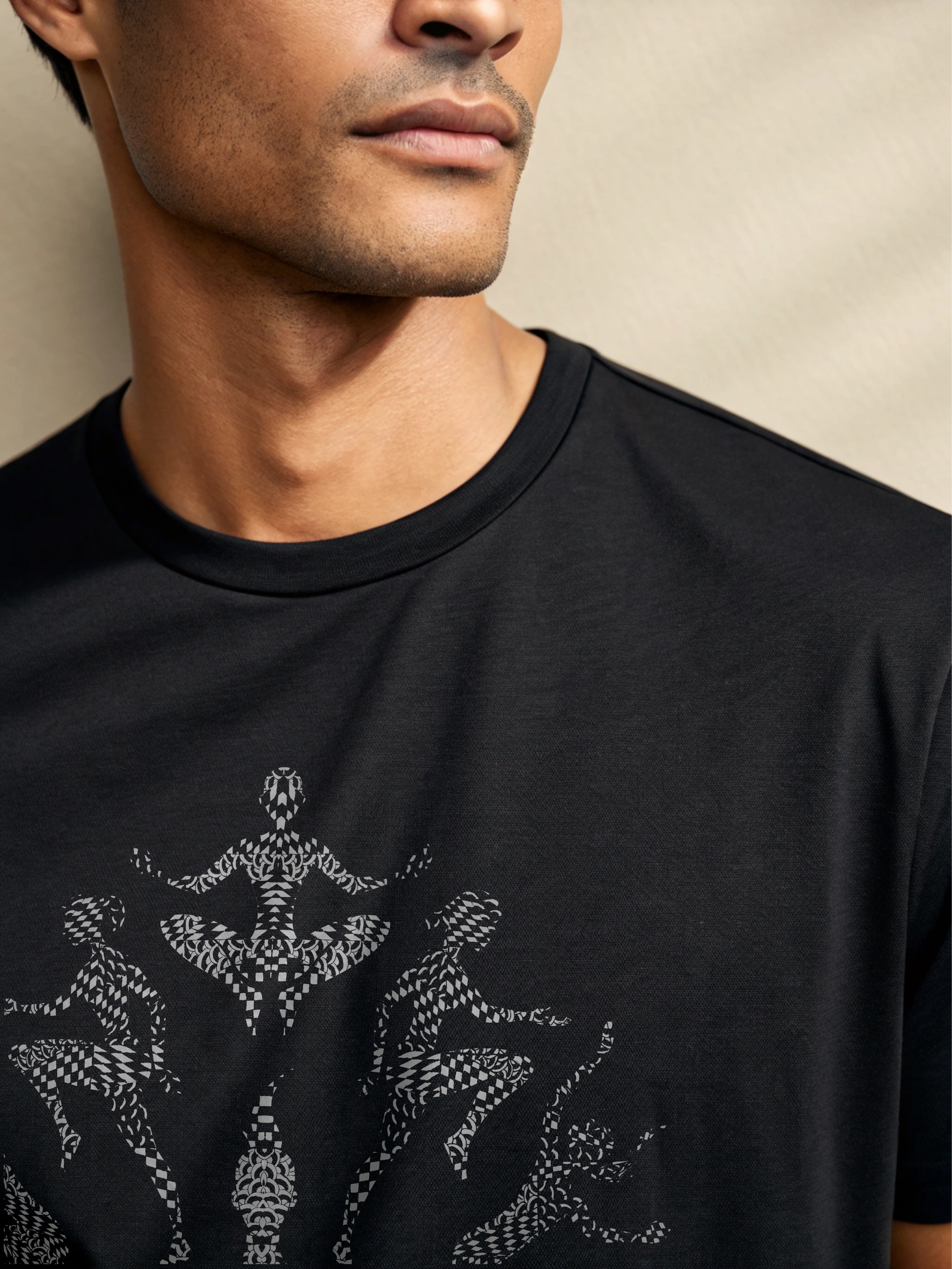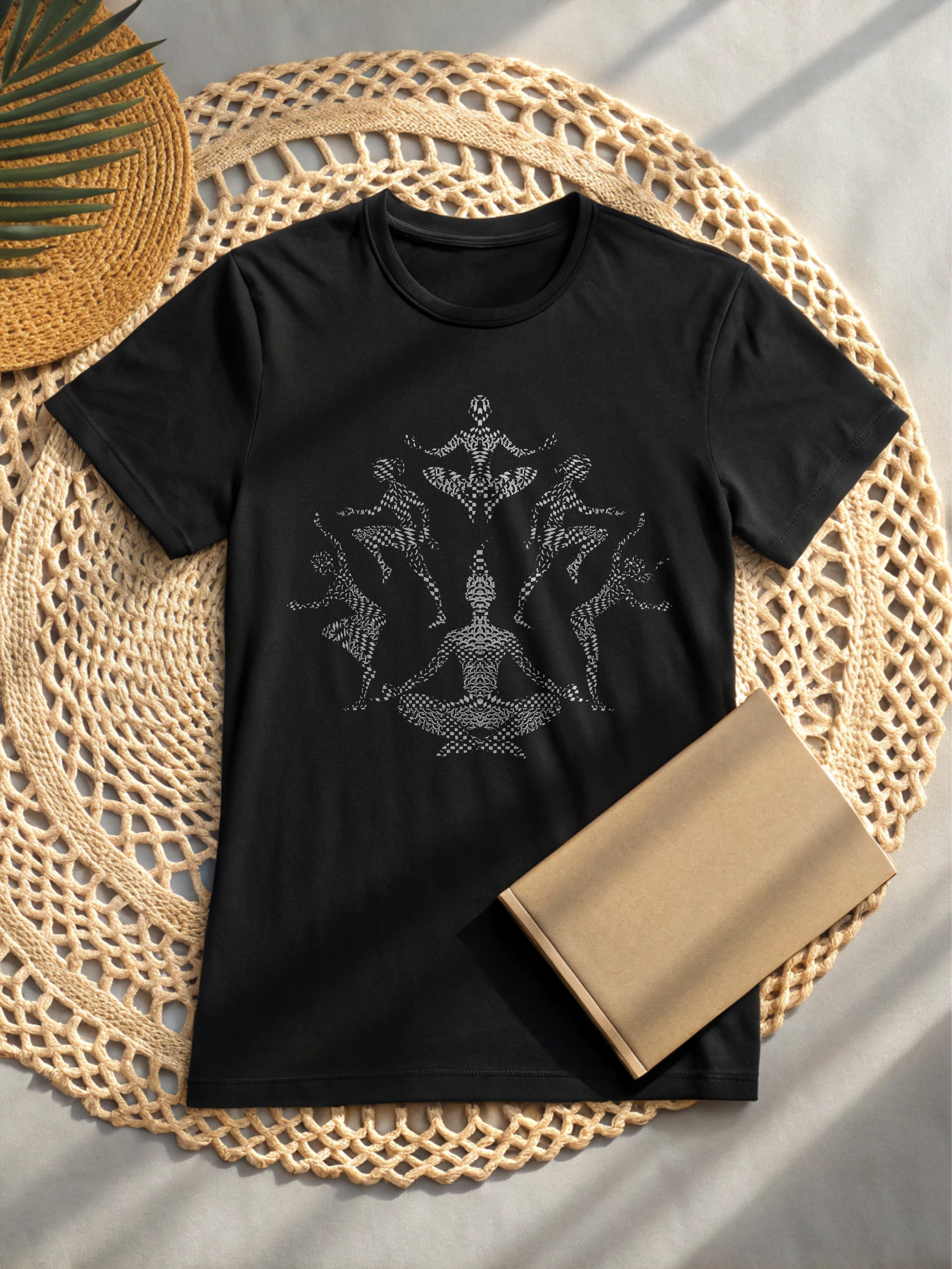 This crisp white tee features a hand-illustrated yoga pose — or sequence — rendered in mindful detail. Every line speaks of balance, breath, and quiet intention. For the man who values movement as meditation, and strength as something subtle.