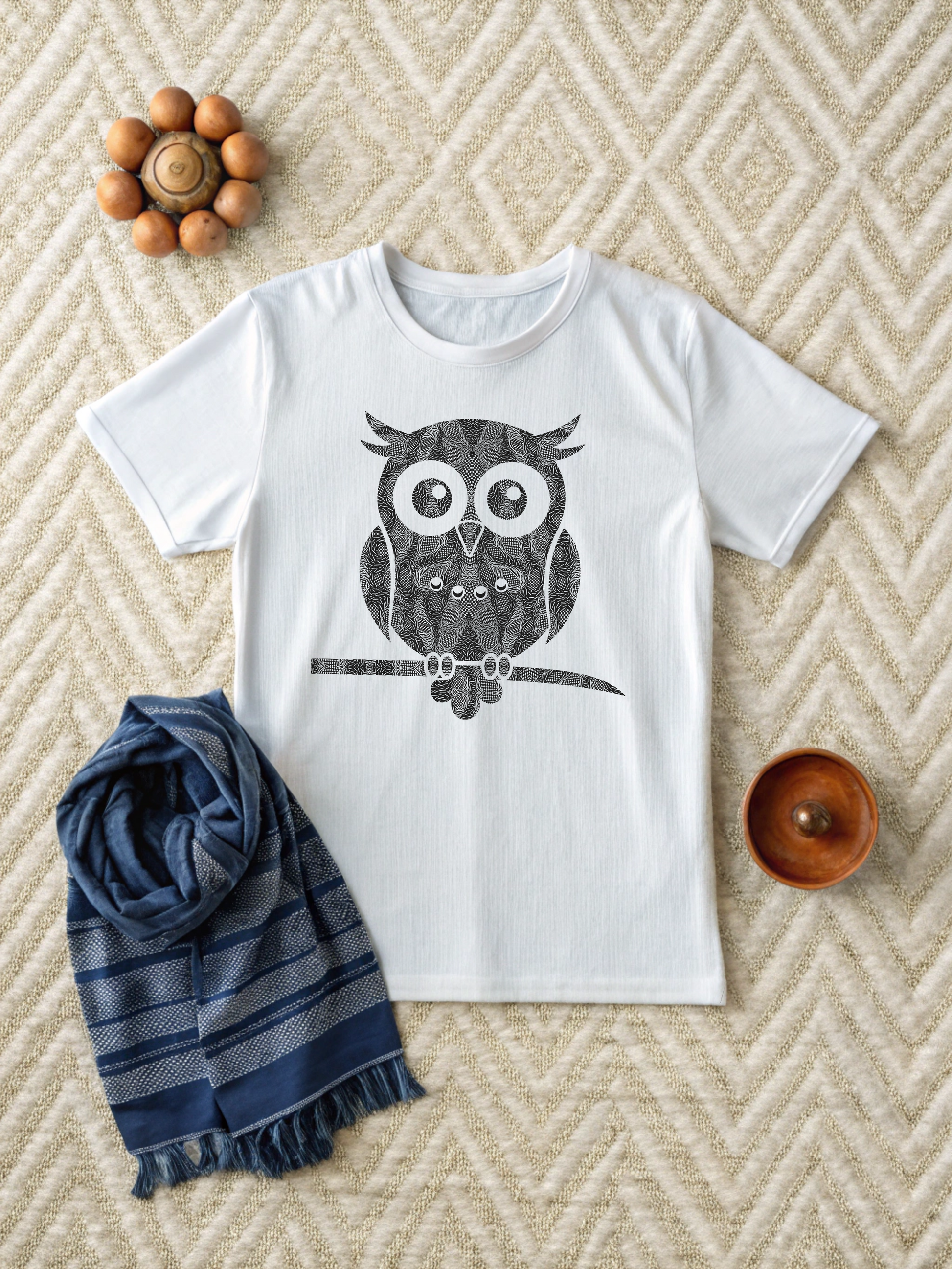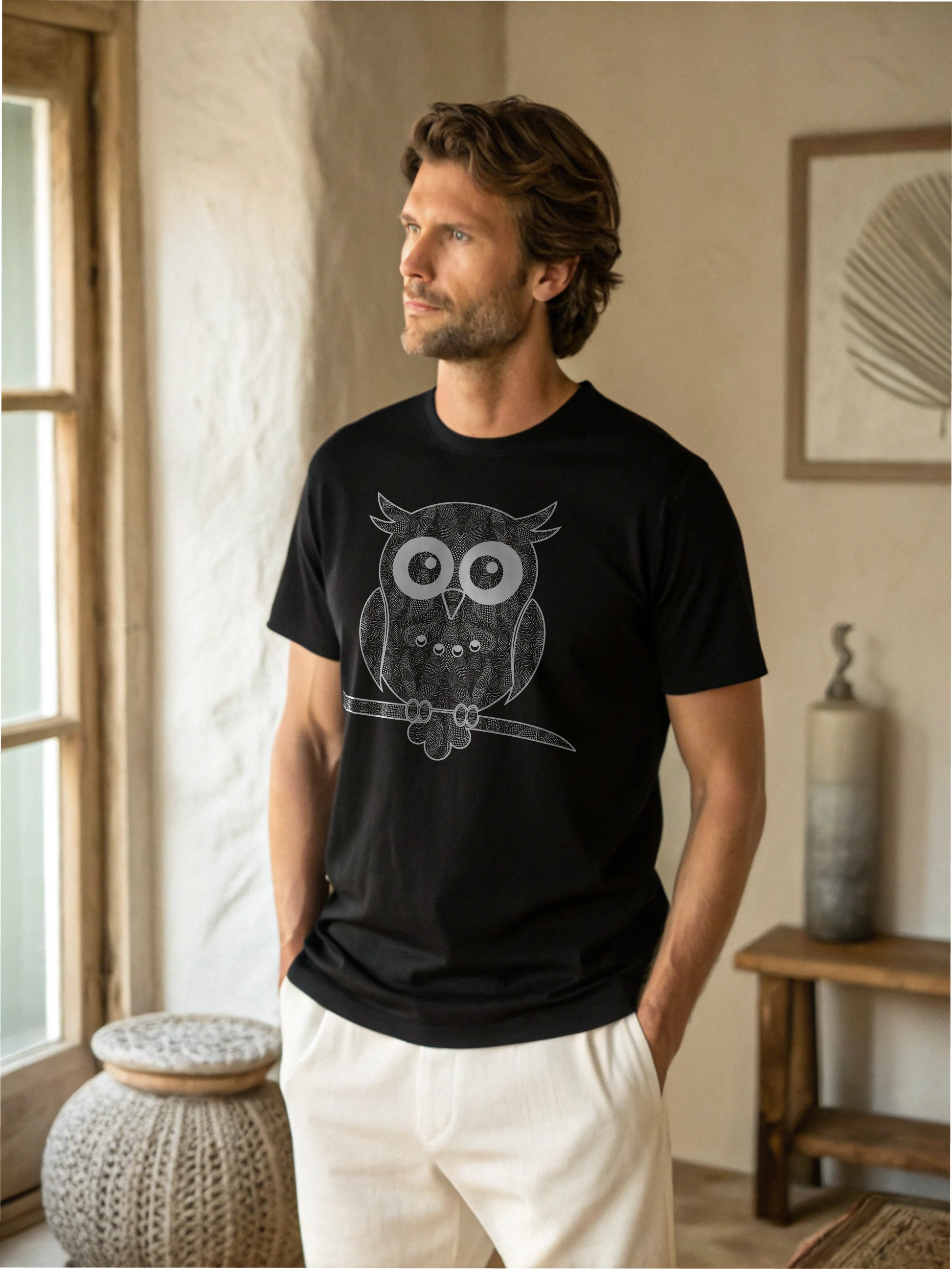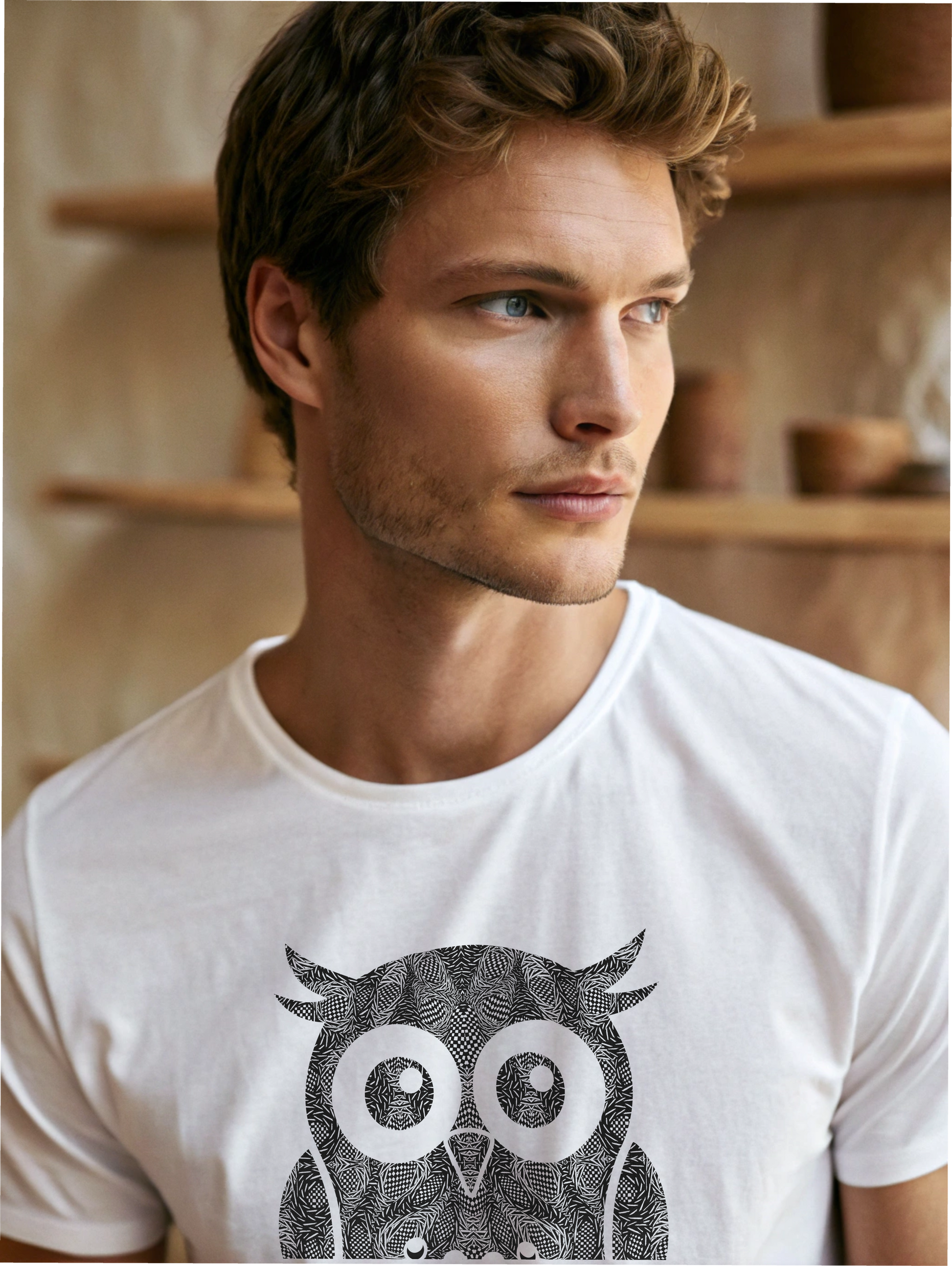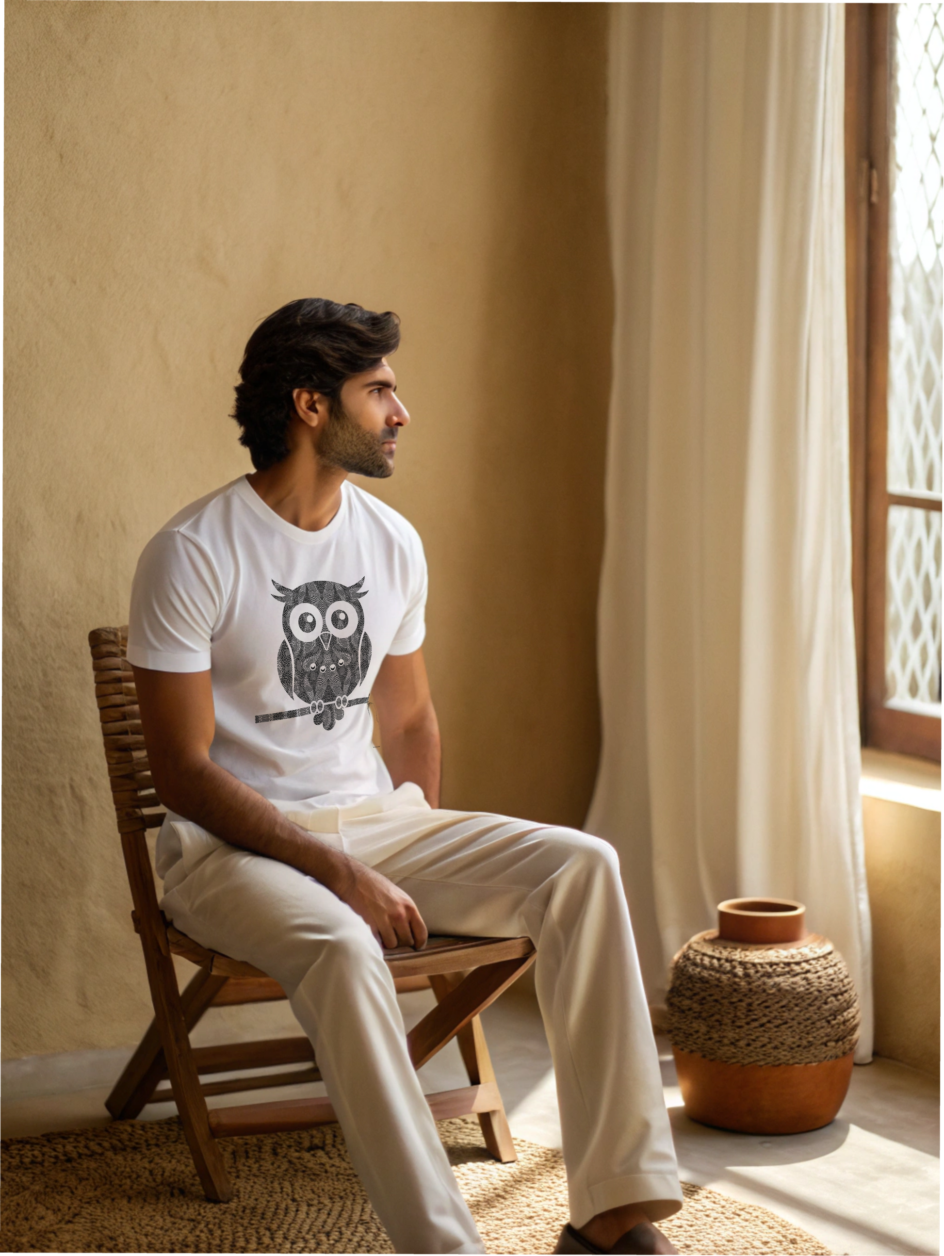 A wide-eyed owl, drawn in detailed tribal-inspired lines, perches with quiet wisdom on this soft white tee. It’s more than a motif — it’s a mindset. For those who know that being observant is its own kind of power.