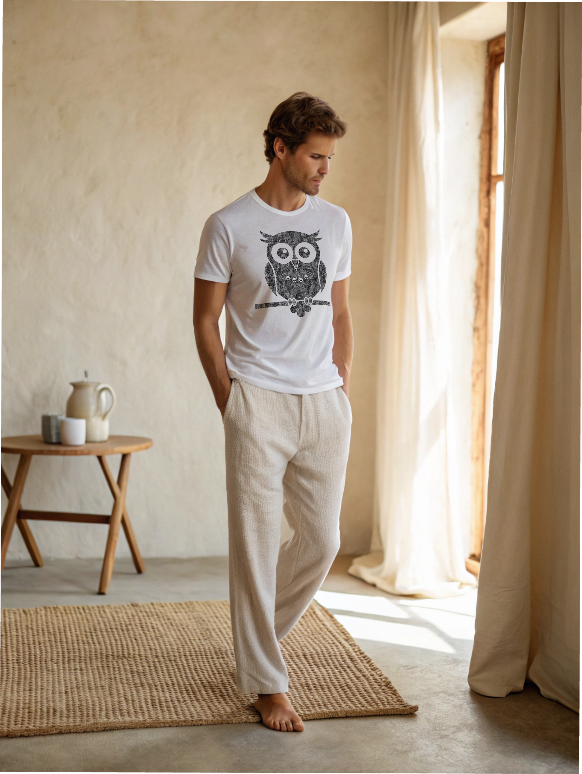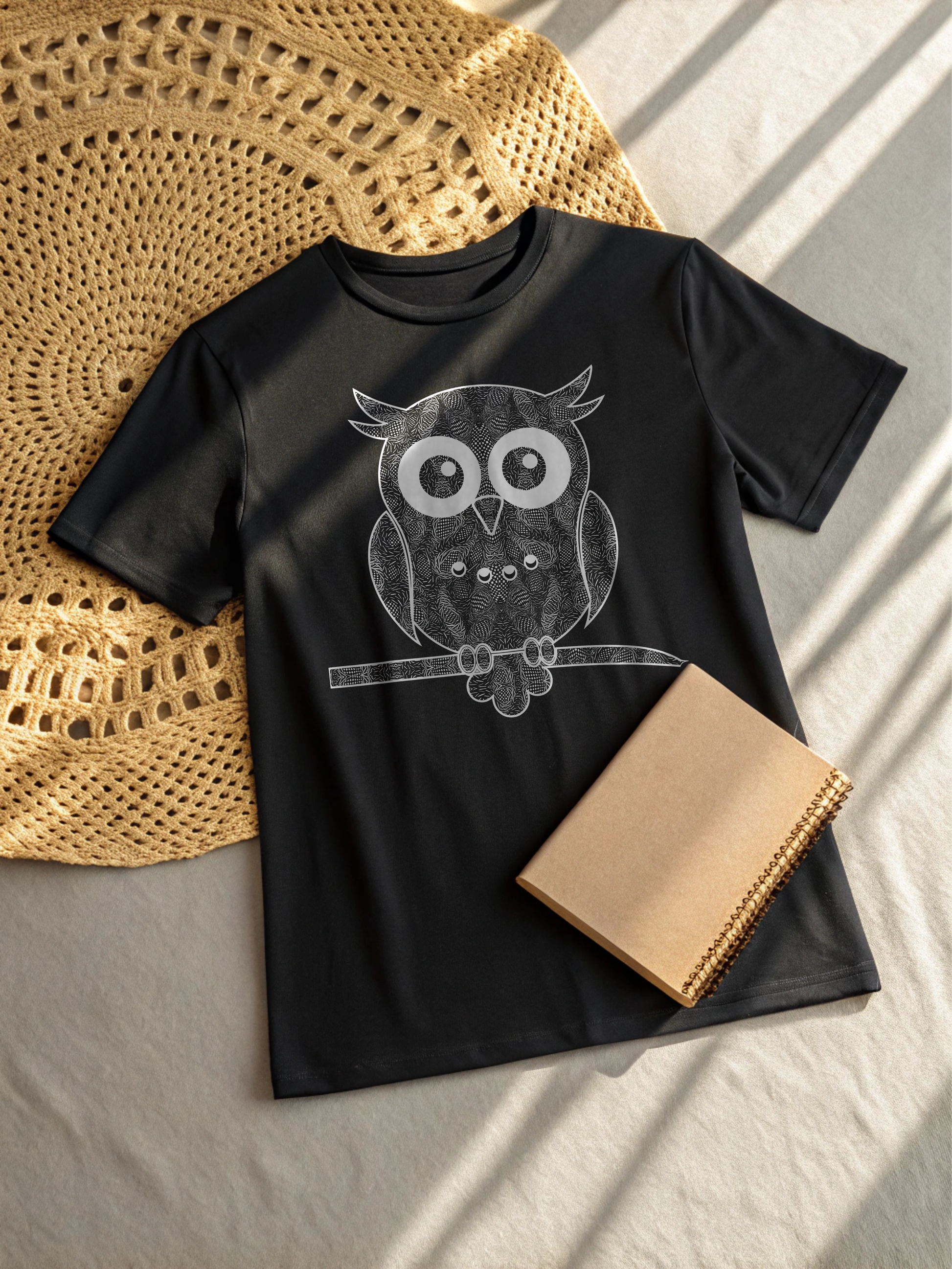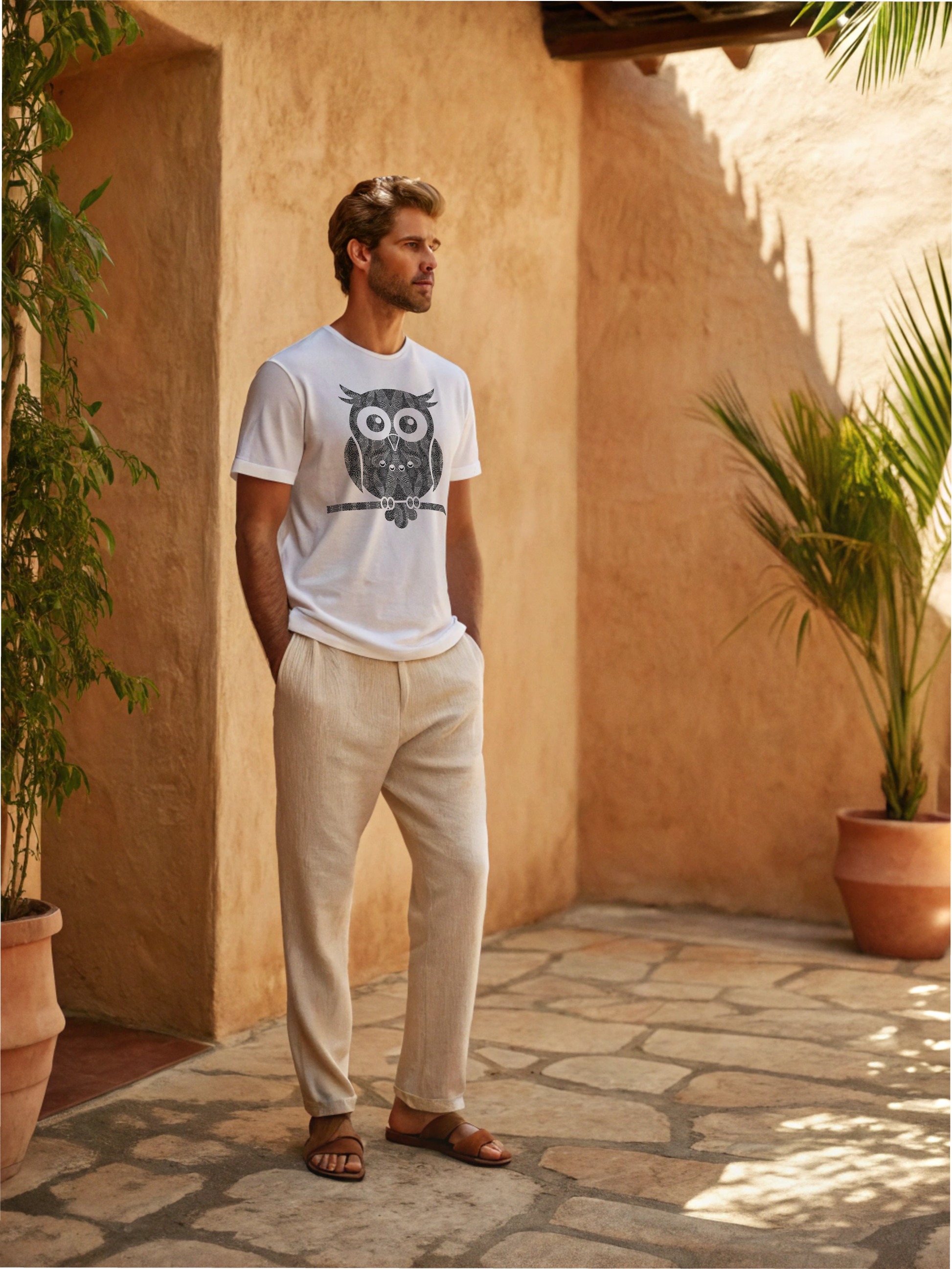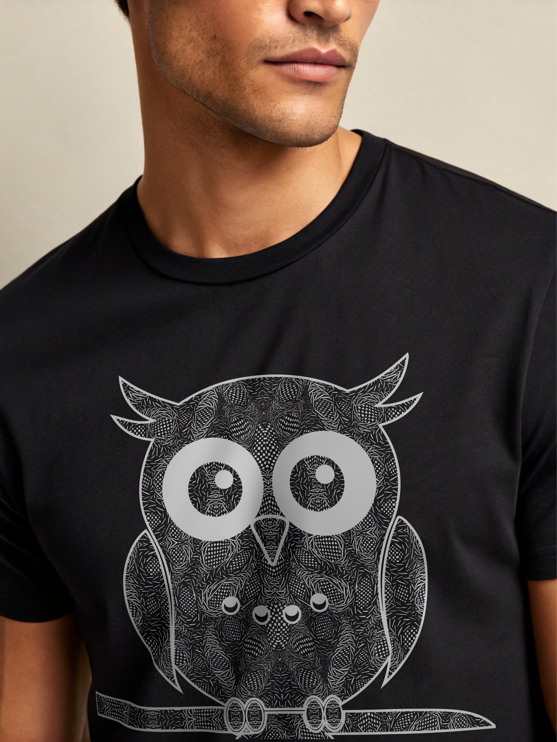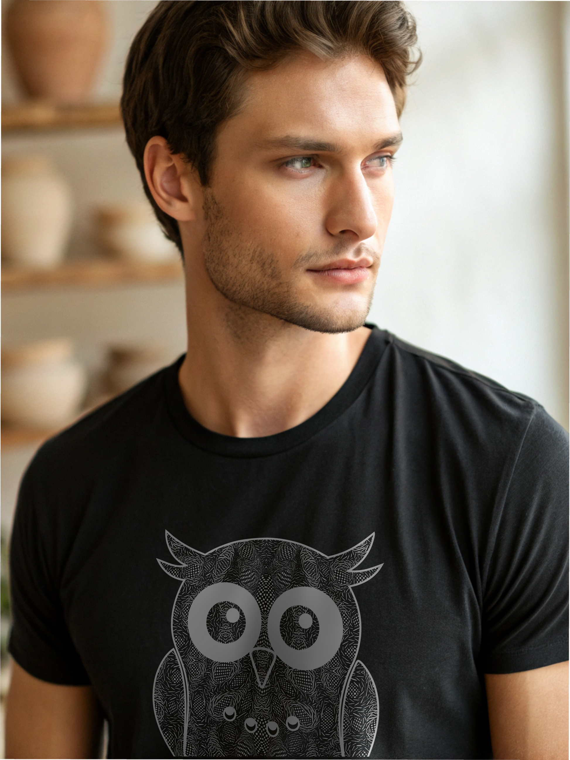A wide-eyed owl, drawn in detailed tribal-inspired lines, perches with quiet wisdom on this soft white tee. It’s more than a motif — it’s a mindset. For those who know that being observant is its own kind of power.