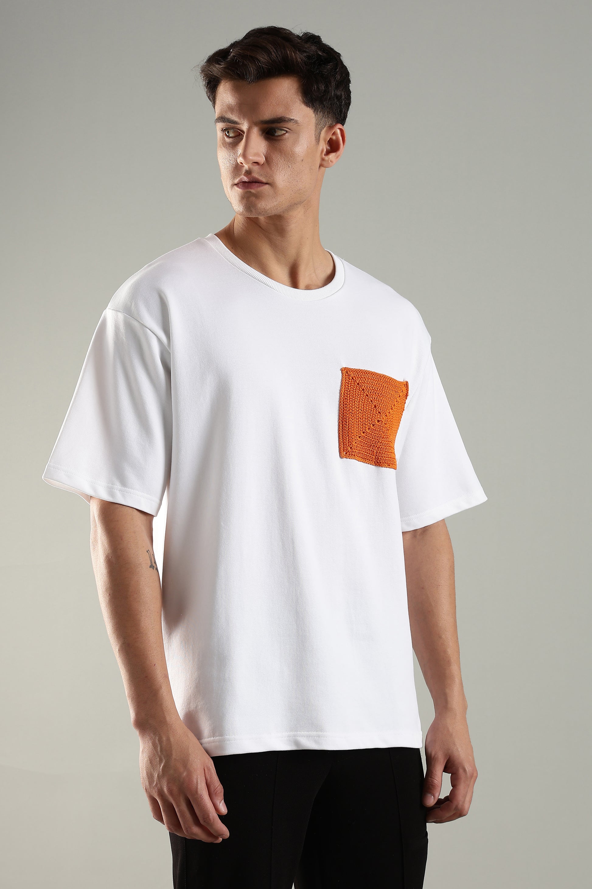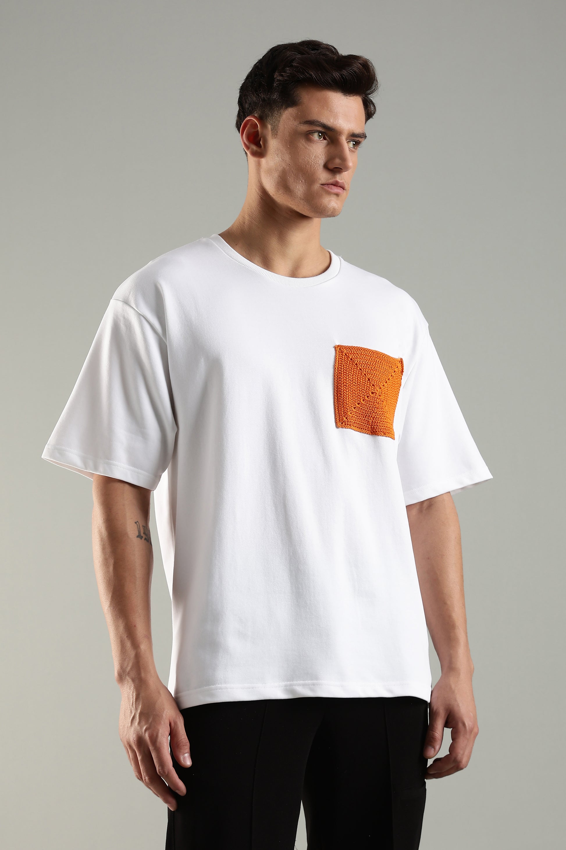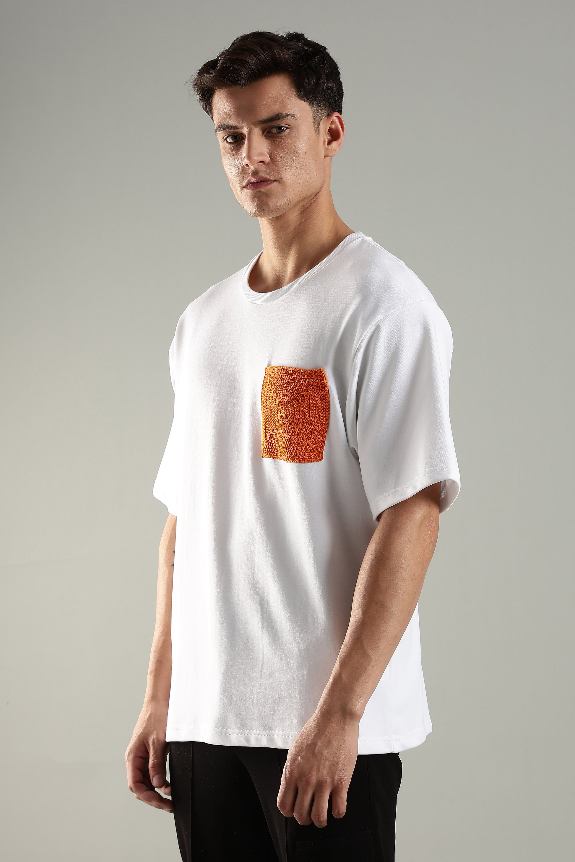 White Artisanal T-Shirt with Hand-Crocheted Rust Pocket – Where Modern Minimalism Meets Heritage Craft