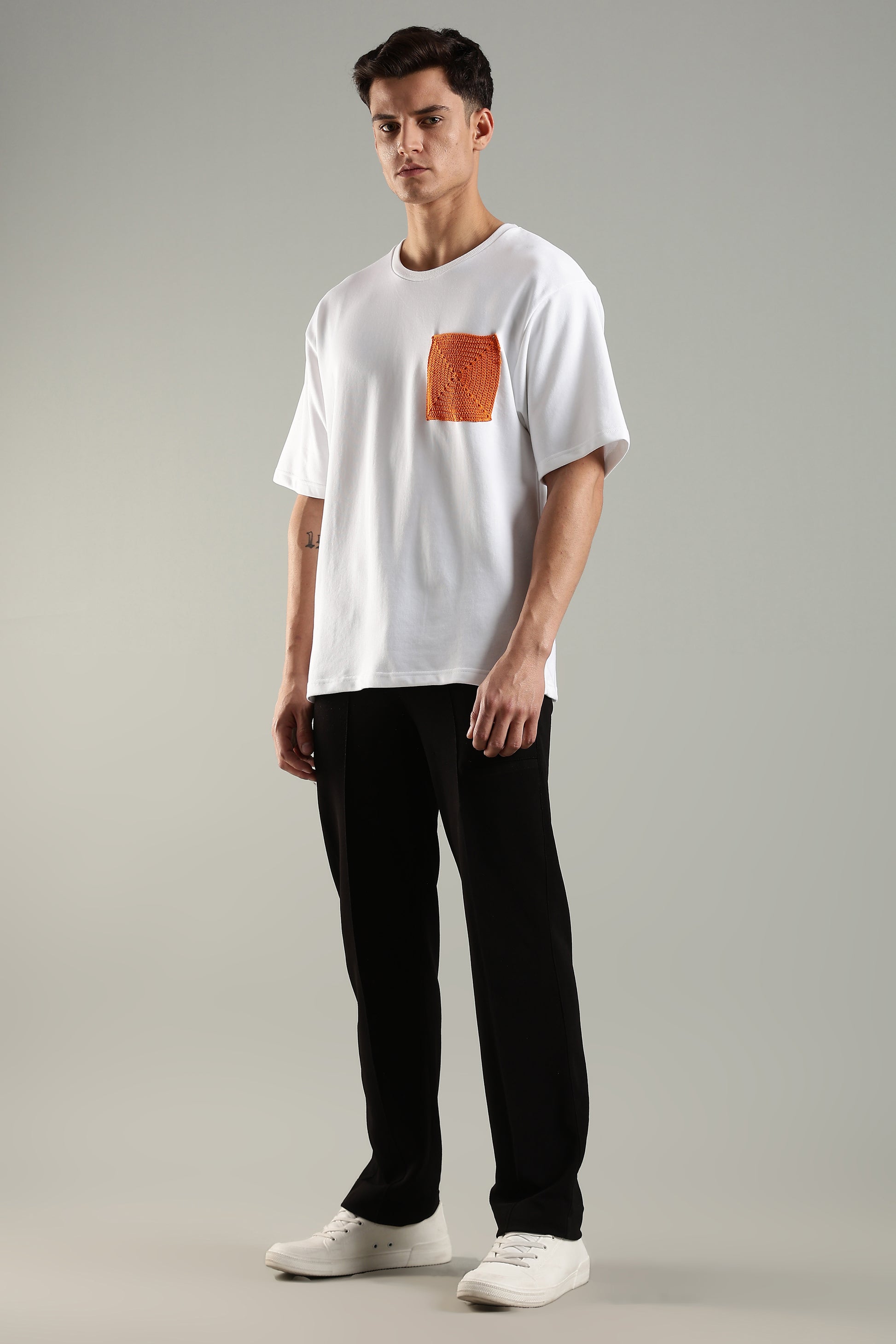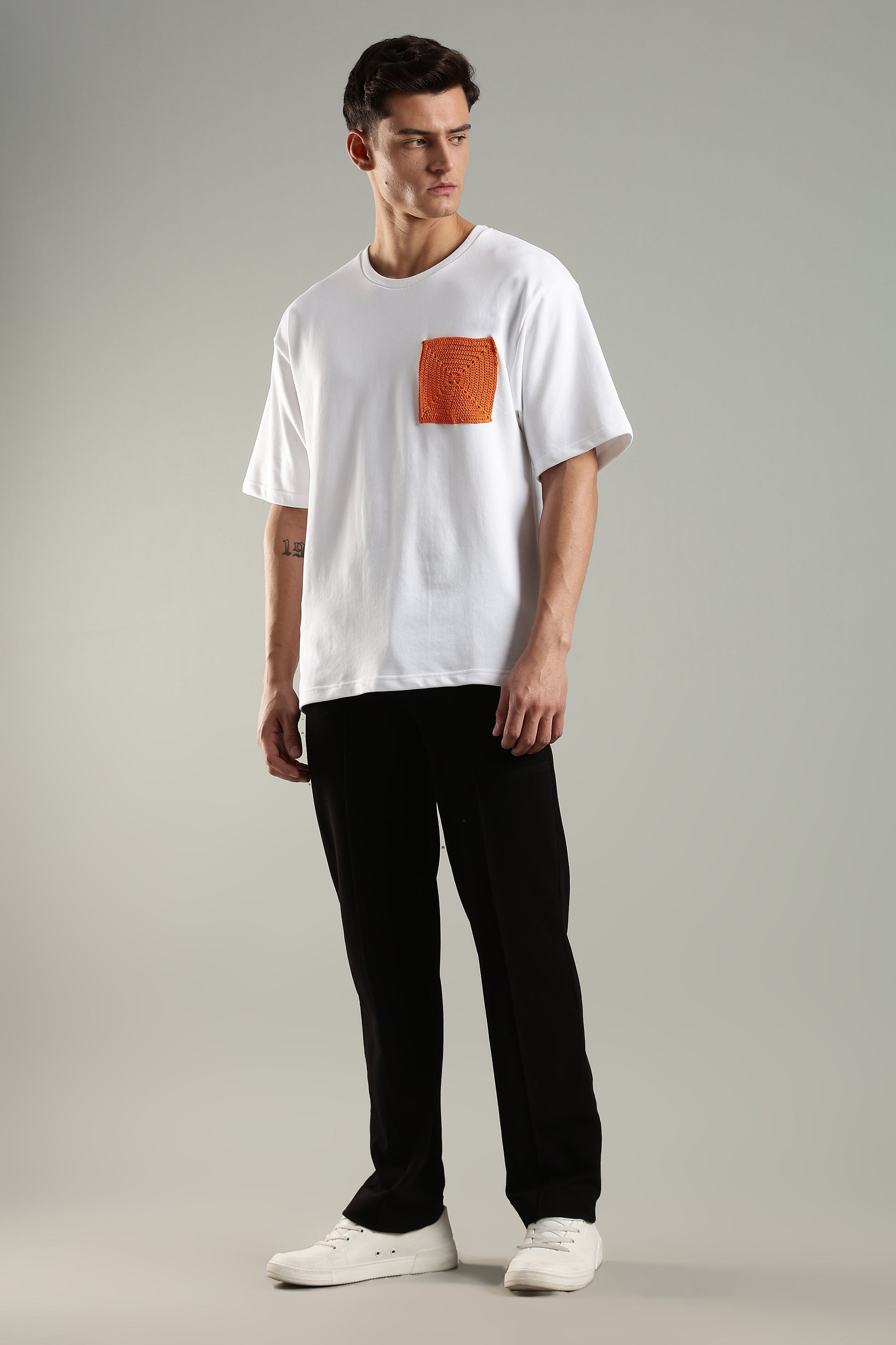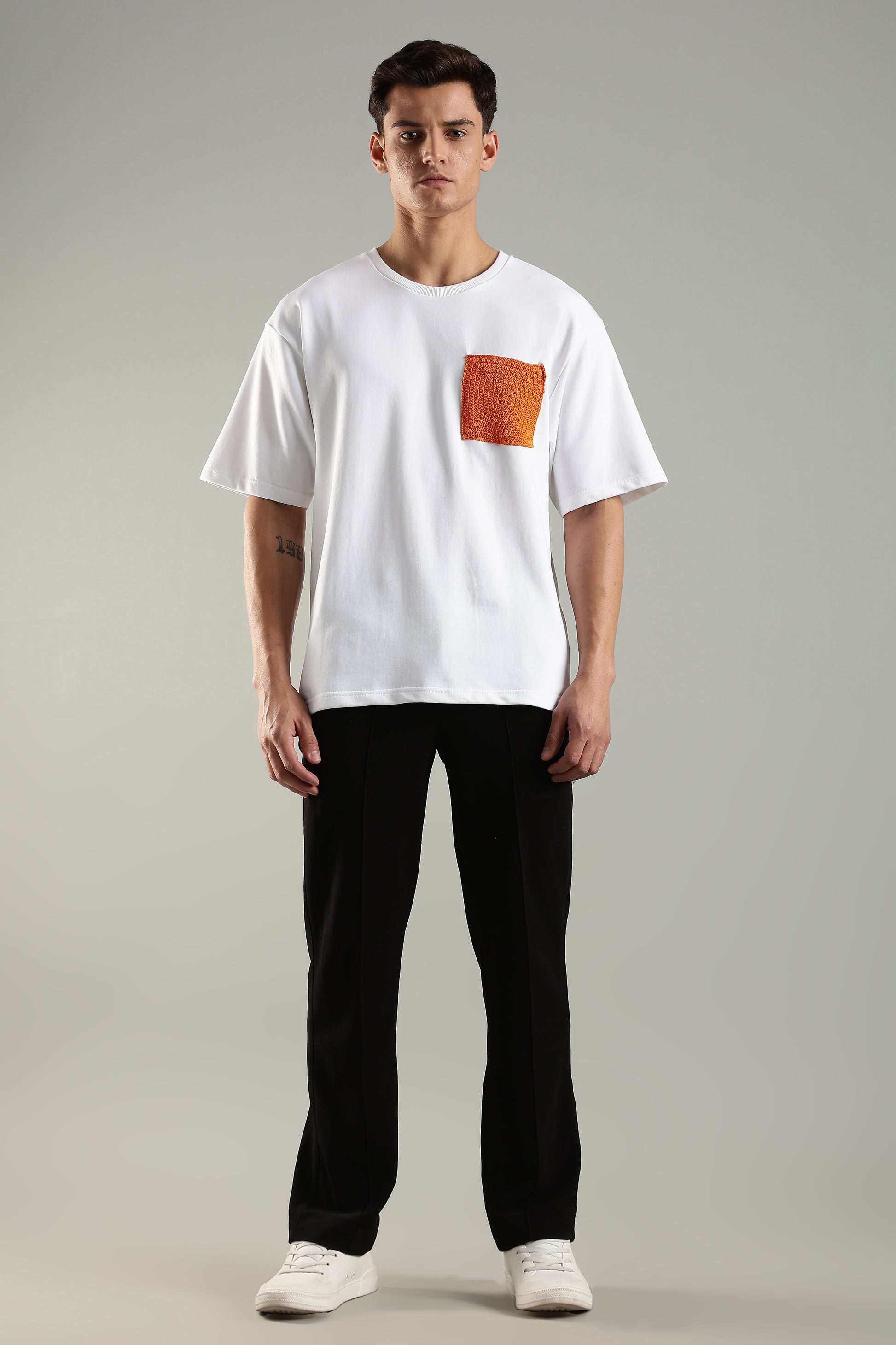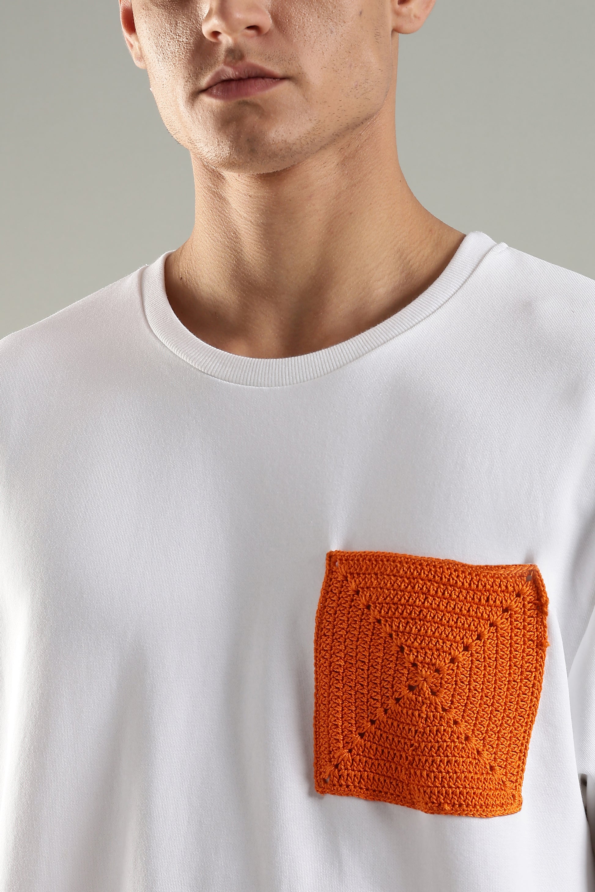 White Artisanal T-Shirt with Hand-Crocheted Rust Pocket – Where Modern Minimalism Meets Heritage Craft