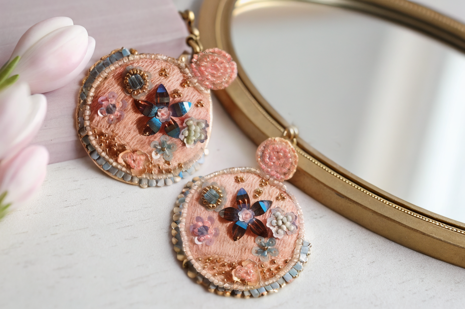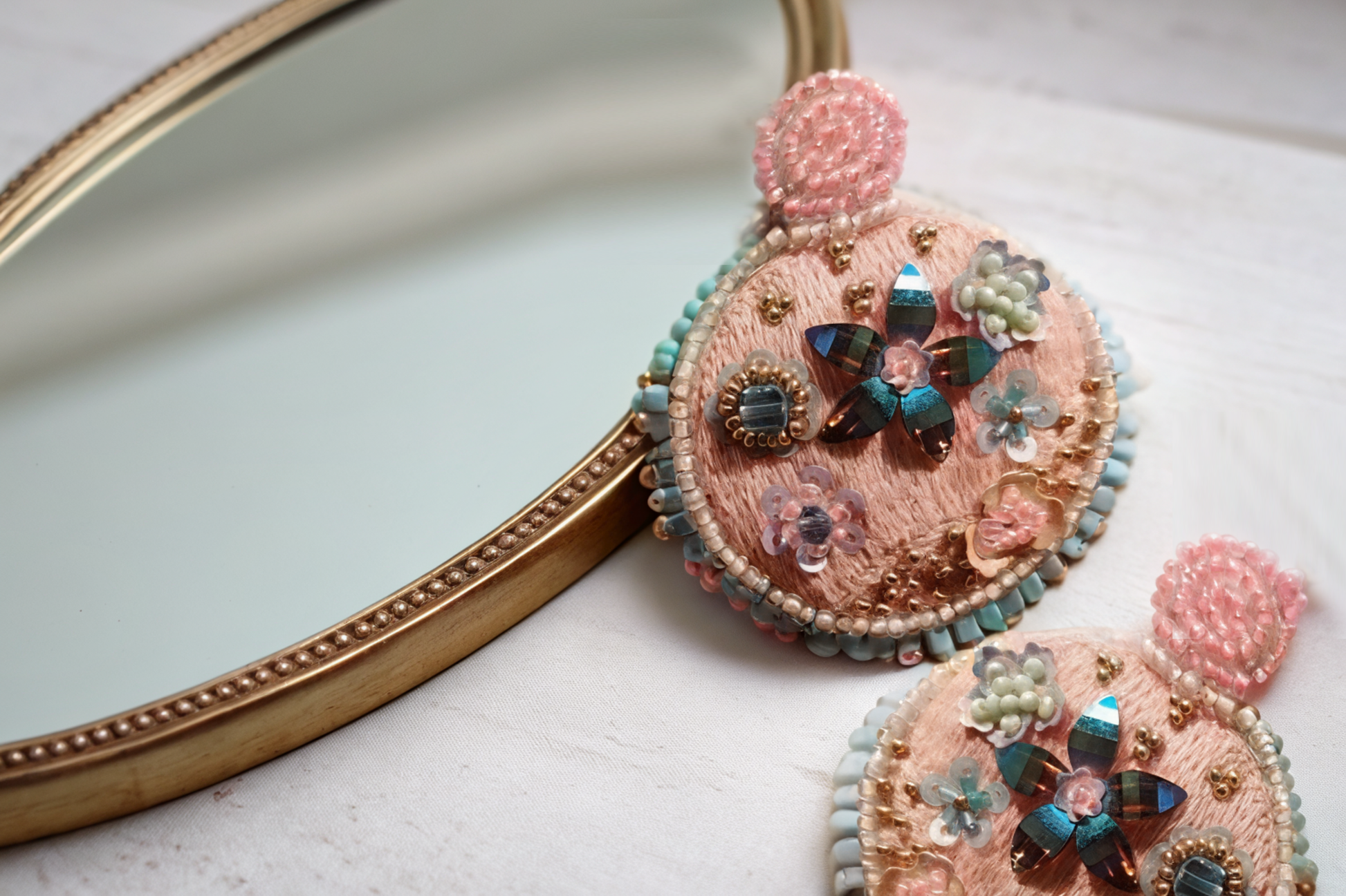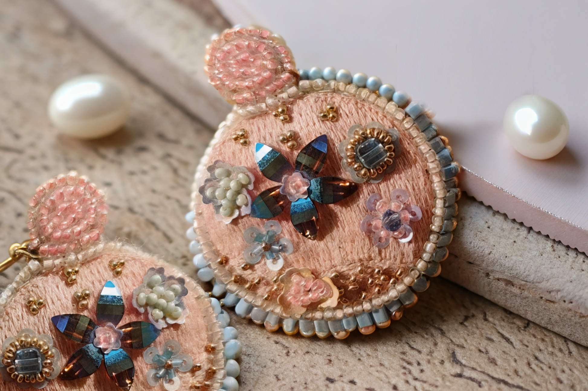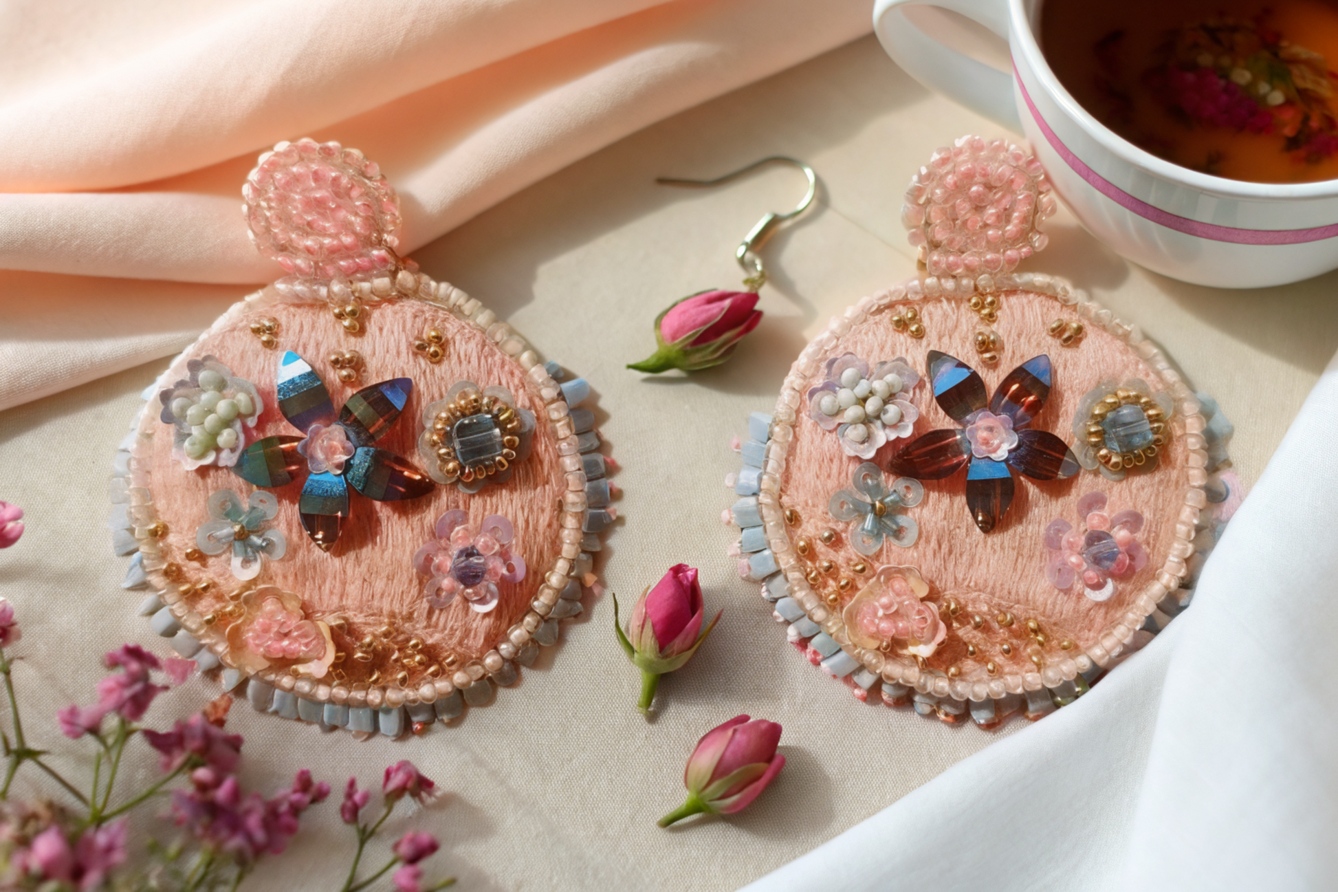 A soft bloom in every glance. These hand-embroidered earrings are like pressed flowers from a sunlit journal — playful, delicate, and brimming with story. Set on a blush pink thread base, each piece is adorned with tiny sequins, glass beads, and glistening petals that shimmer like morning dew.