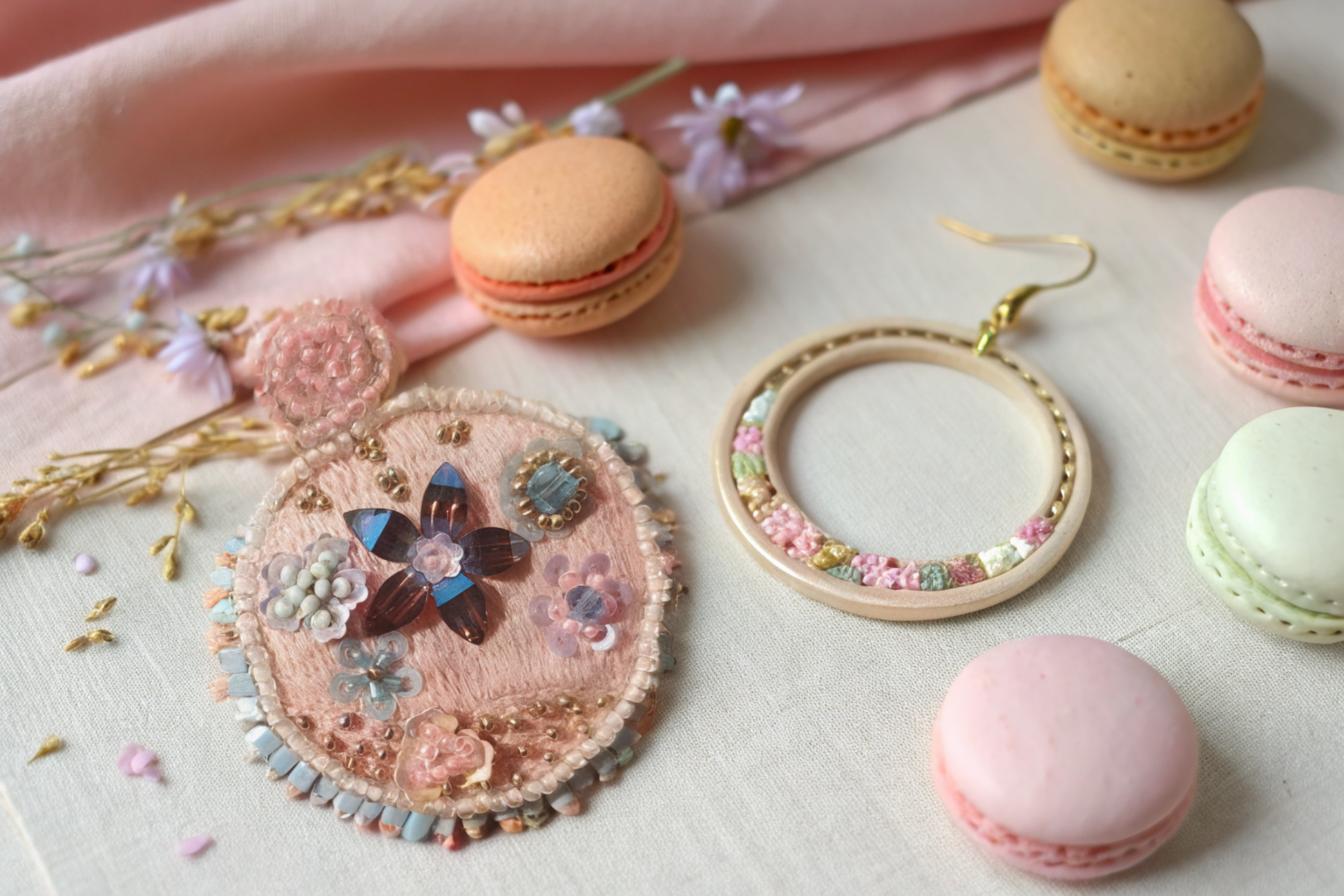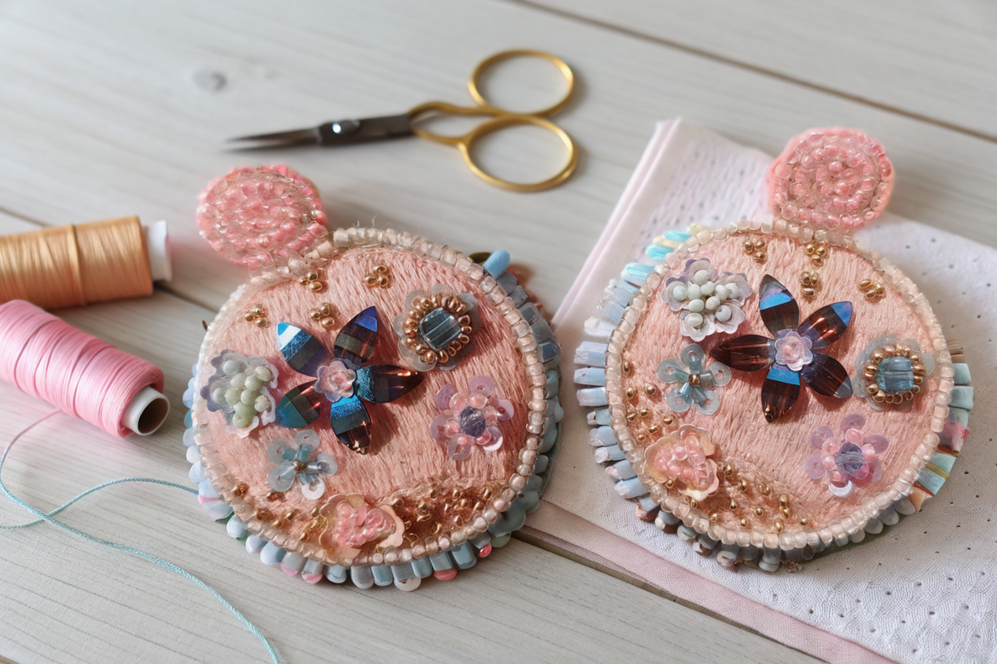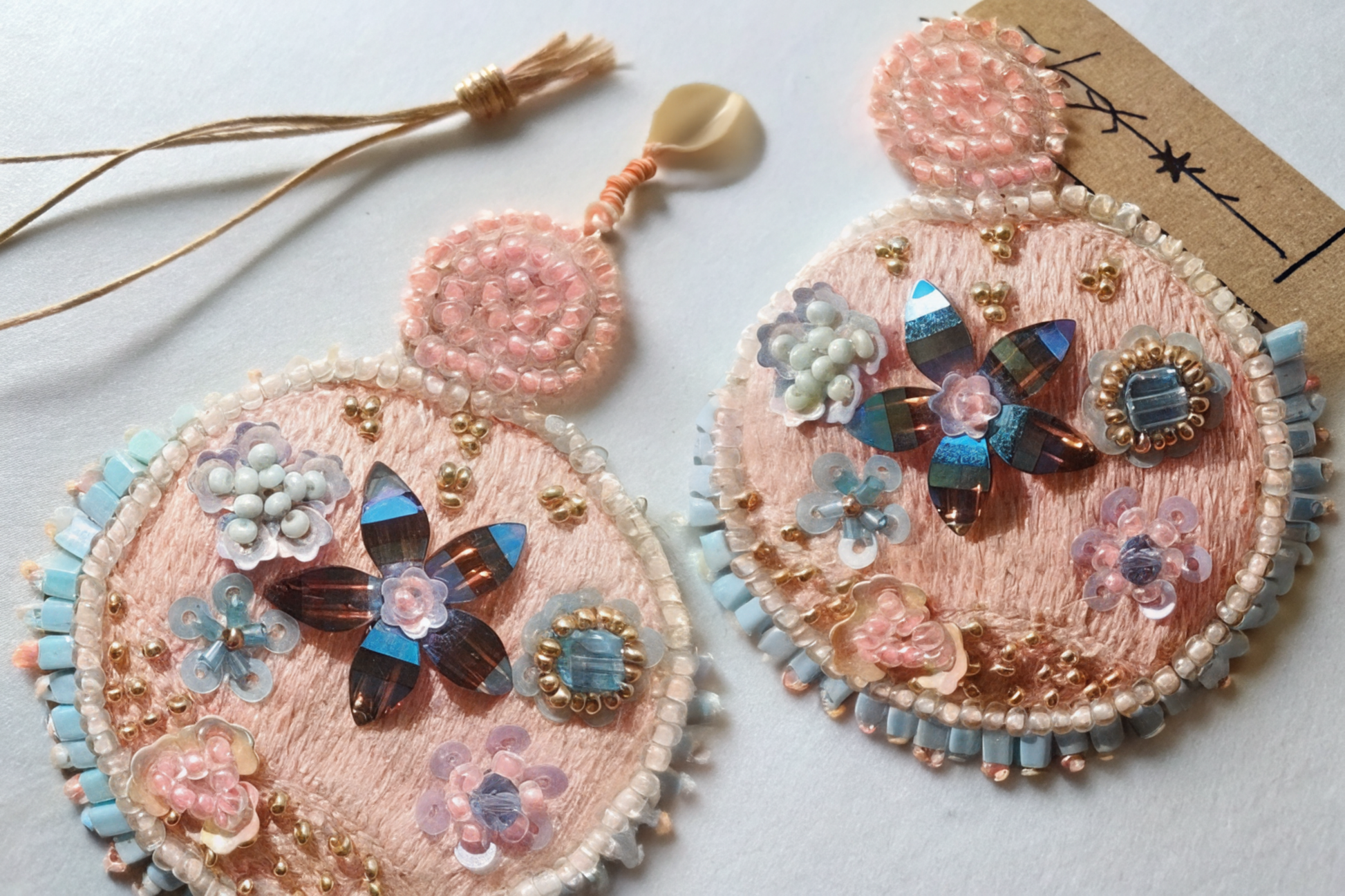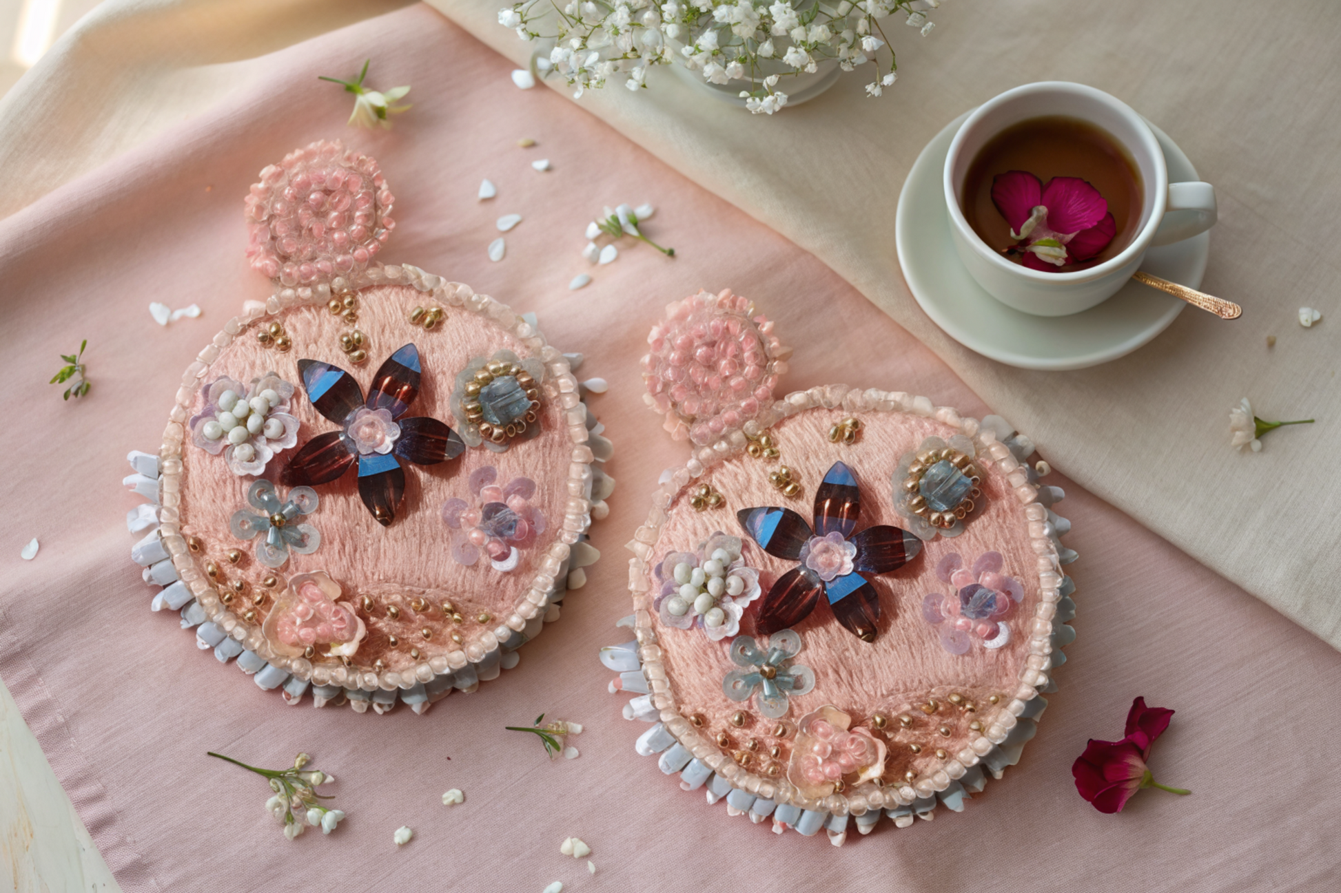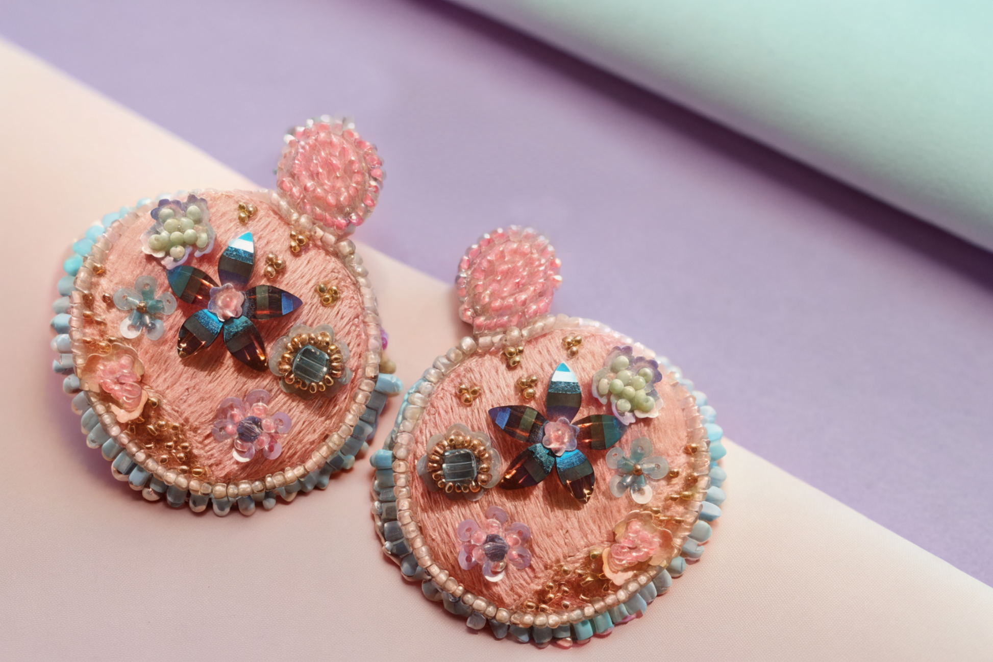 A soft bloom in every glance. These hand-embroidered earrings are like pressed flowers from a sunlit journal — playful, delicate, and brimming with story. Set on a blush pink thread base, each piece is adorned with tiny sequins, glass beads, and glistening petals that shimmer like morning dew.