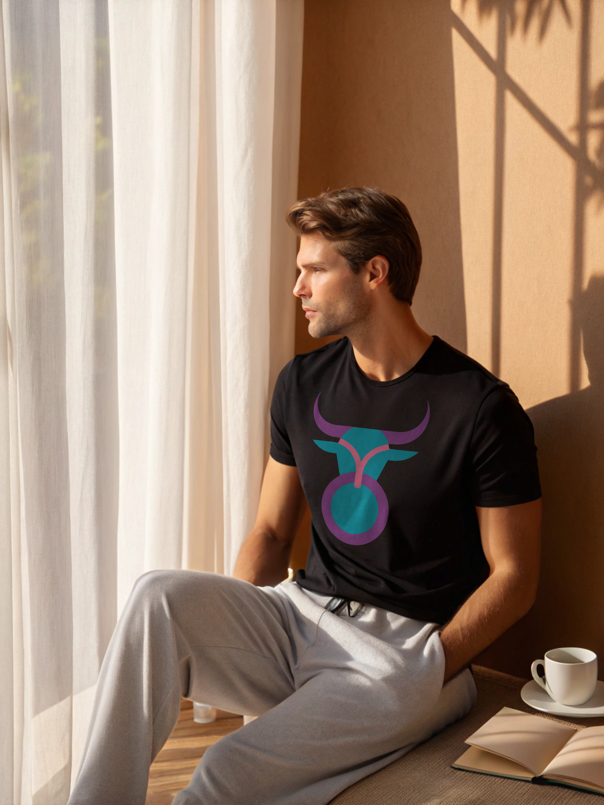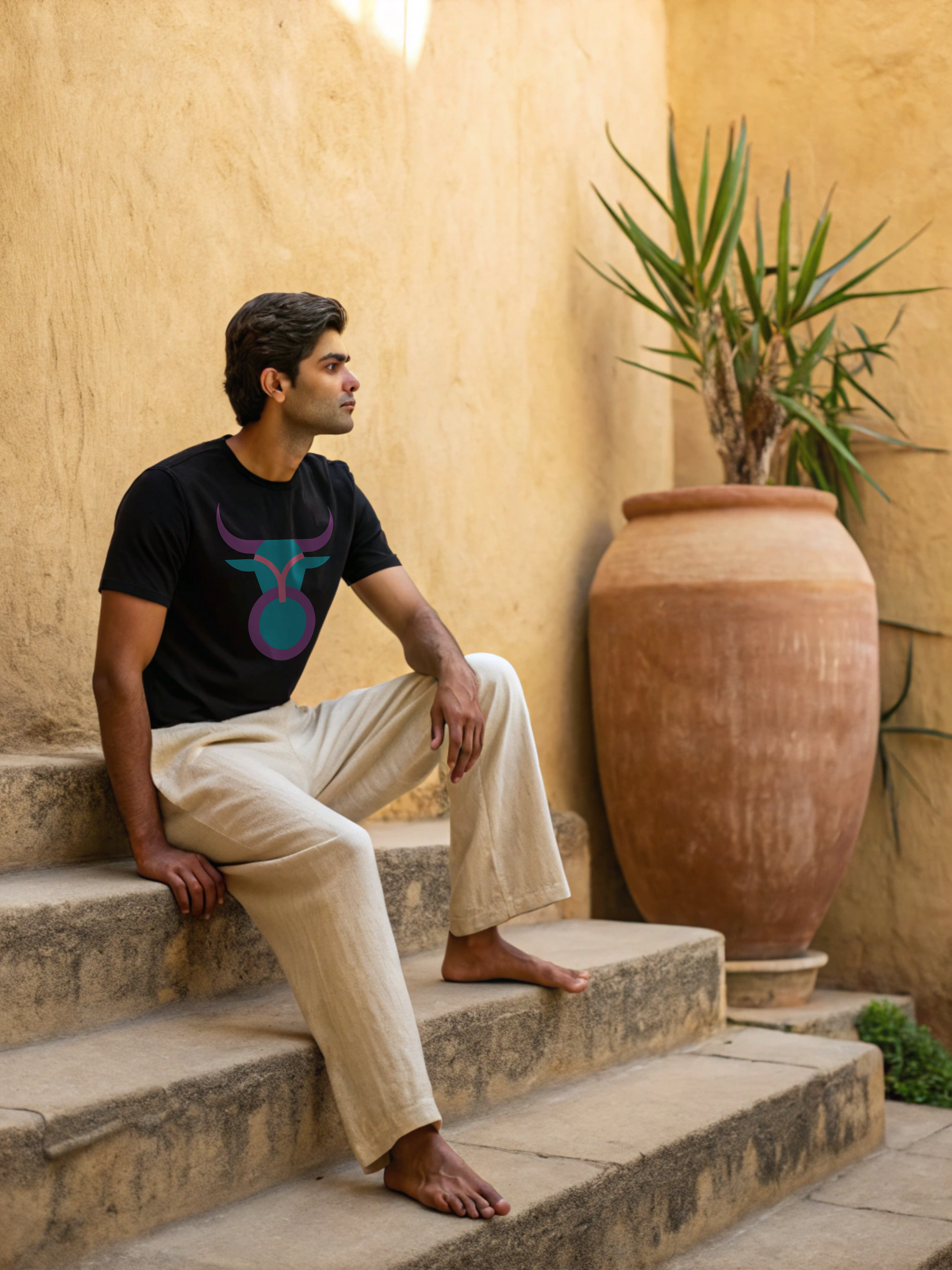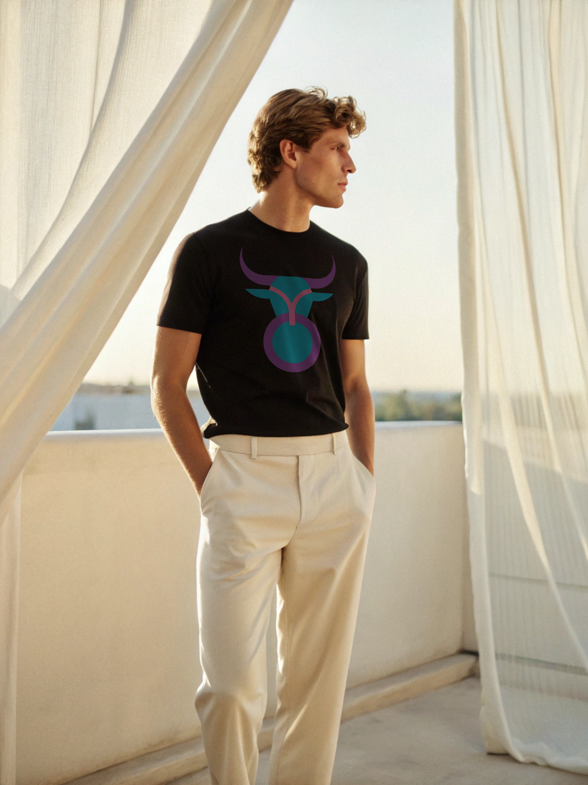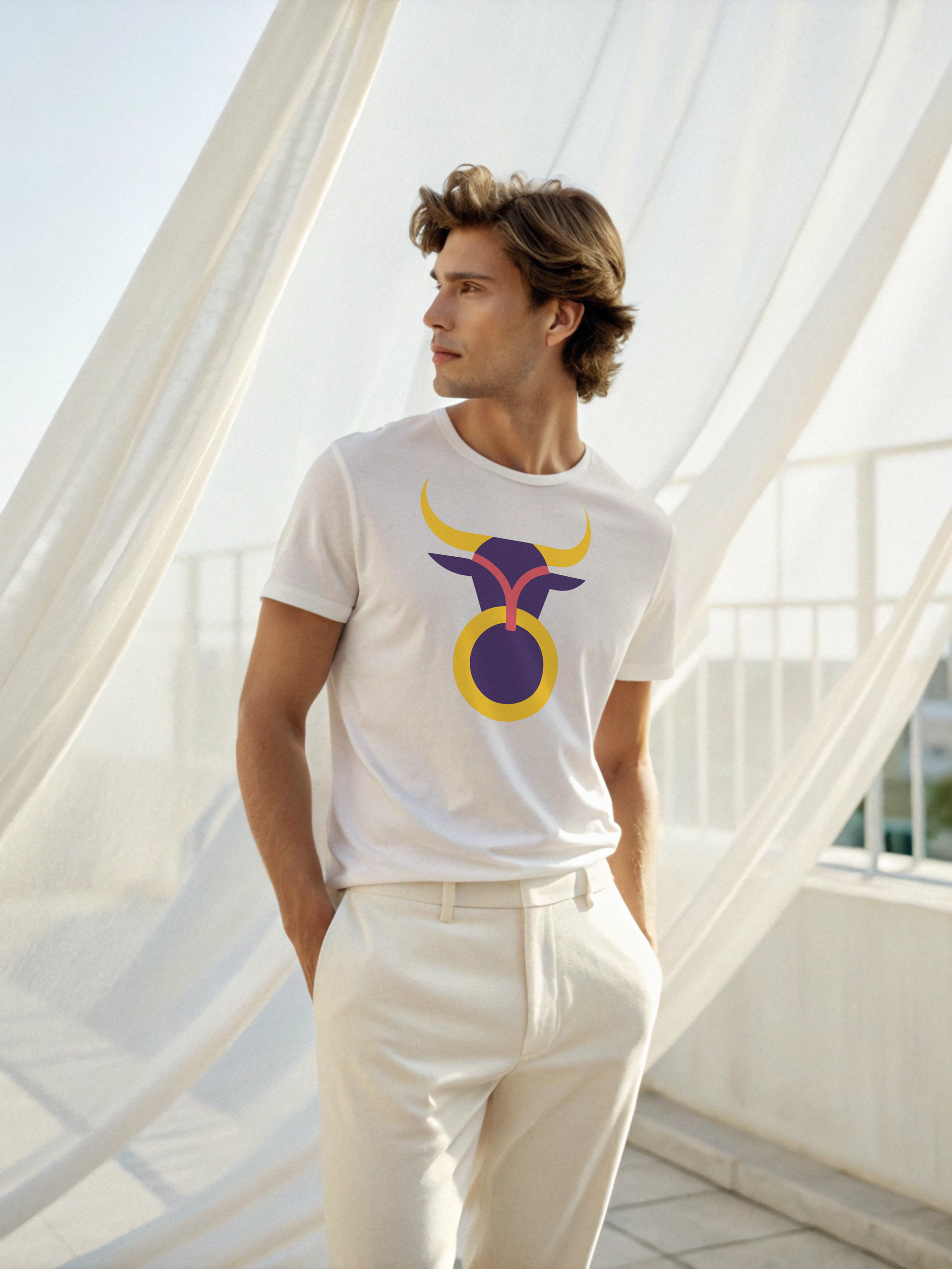 Strength without noise. The Celestial Ground Tee in white reflects the Taurus man’s calm endurance and unwavering spirit. With its bold yet balanced symbol in violet and gold, it embodies quiet resilience — the kind that doesn’t demand attention but commands respect.