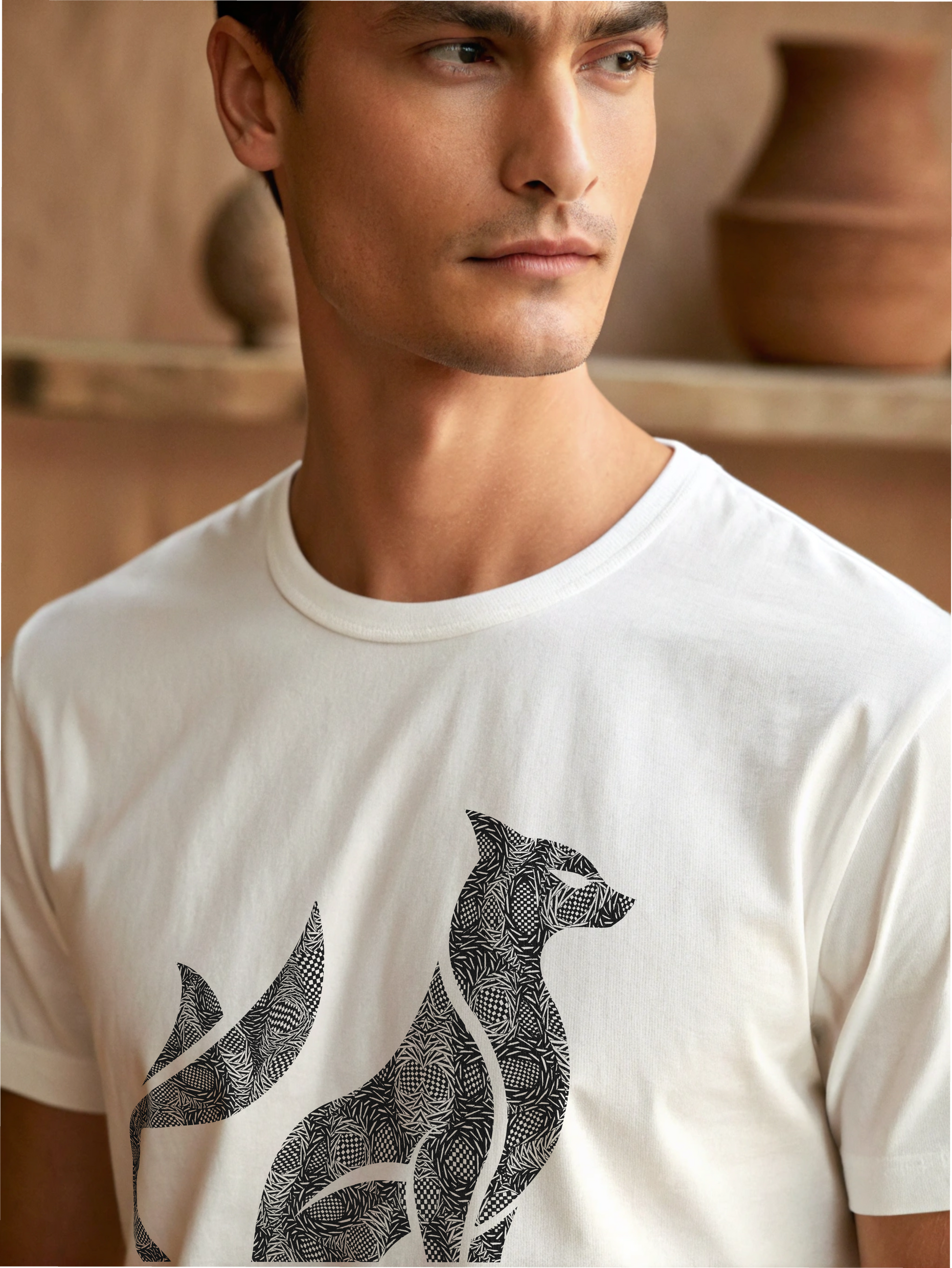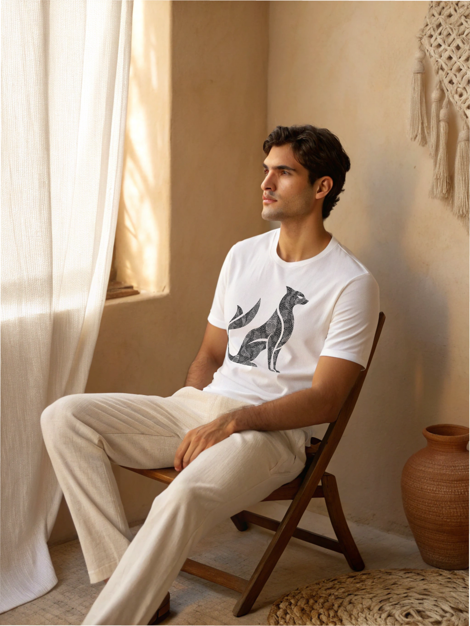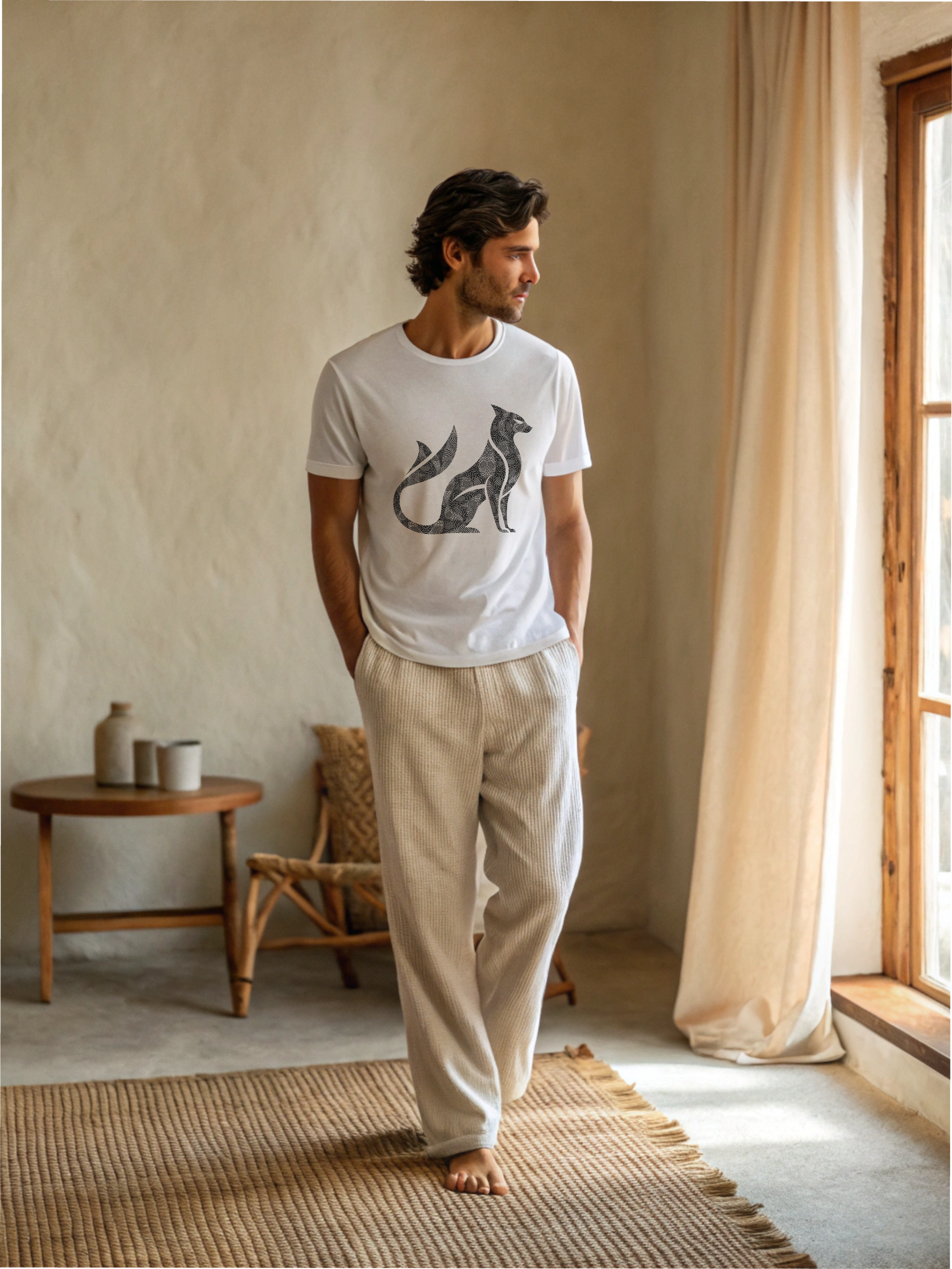 This white men’s tee features a striking black ink cat motif — detailed, meditative, and bold in contrast. Tailored for effortless comfort and timeless layering, it’s perfect for everything from urban outings to creative downtime.