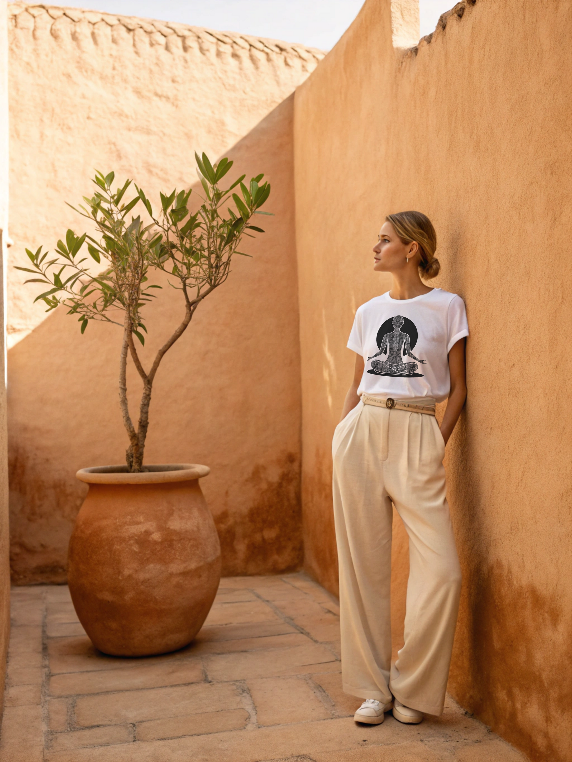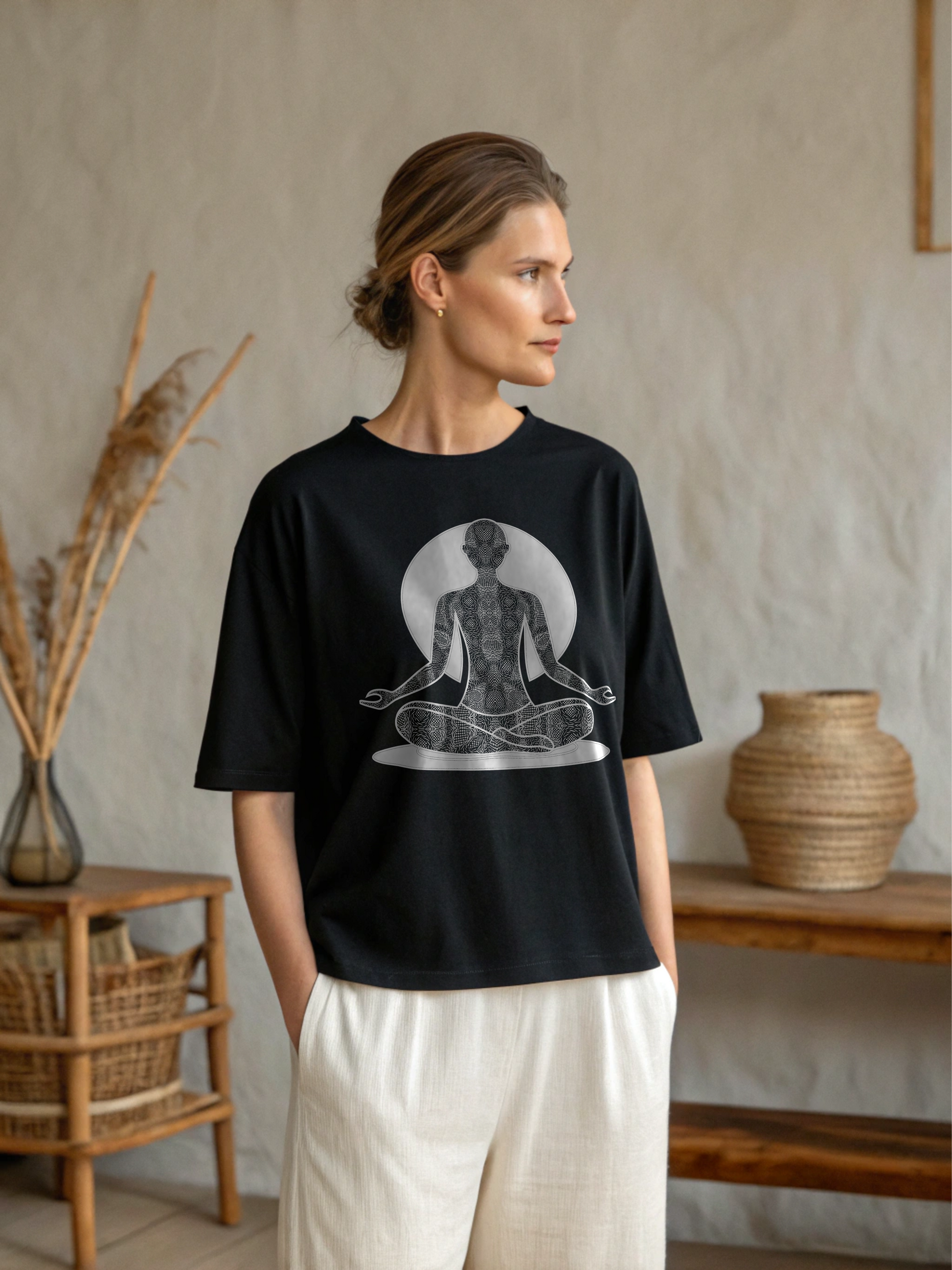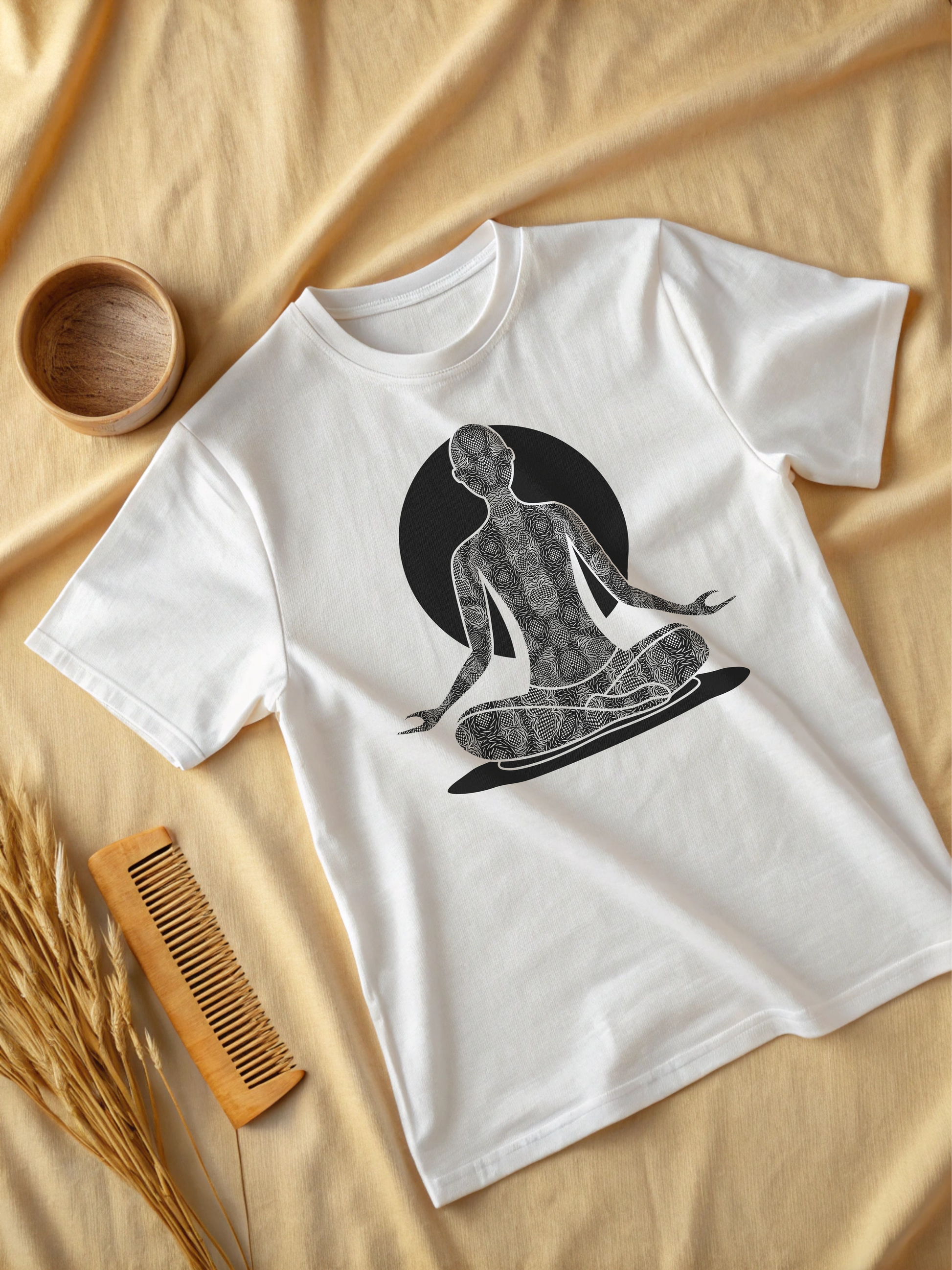 This airy white tee is anchored by a serene figure in meditation — etched with traditional detailing that speaks of balance, clarity, and soul. For women who choose silence as strength and introspection as guidance.