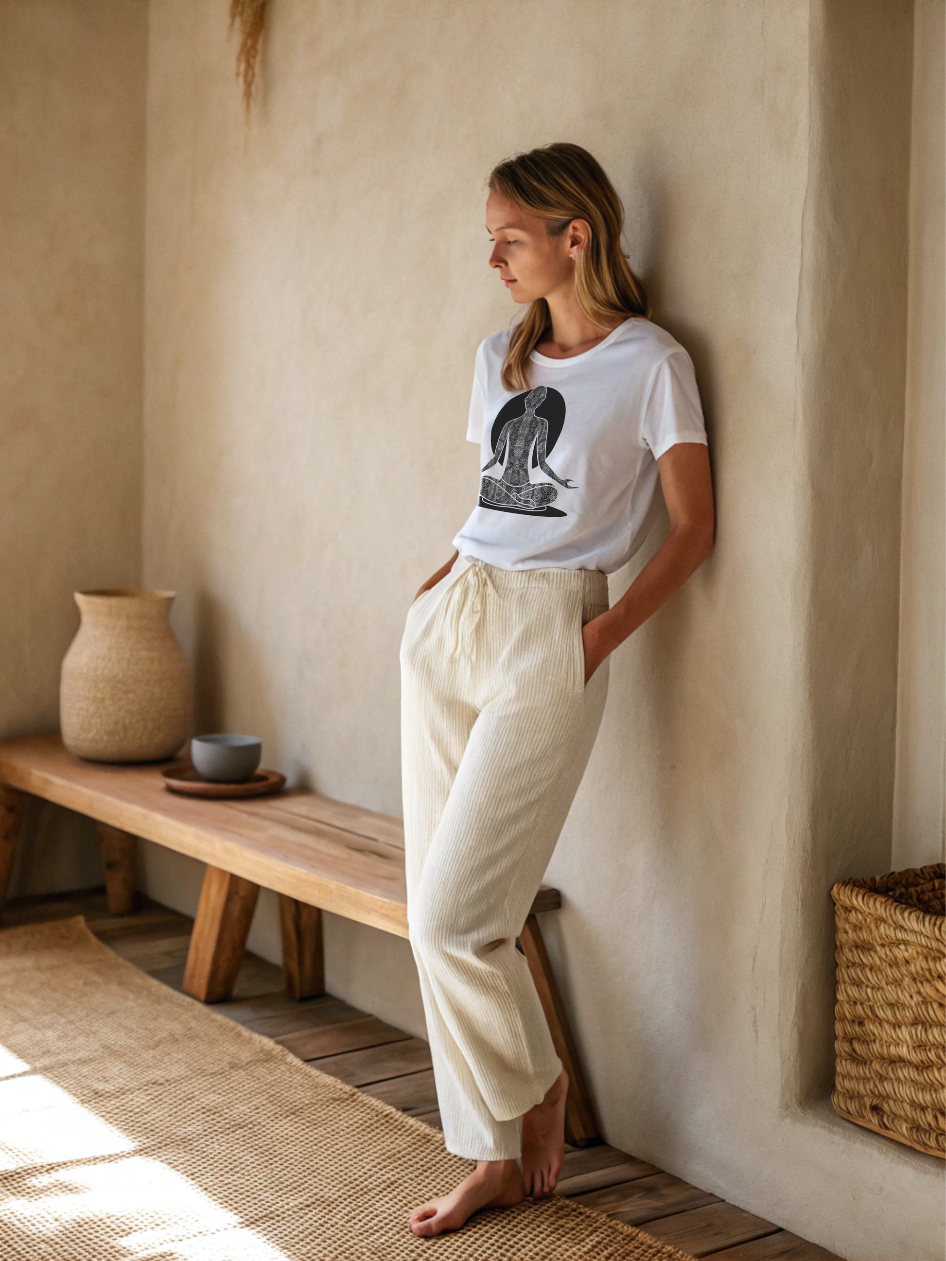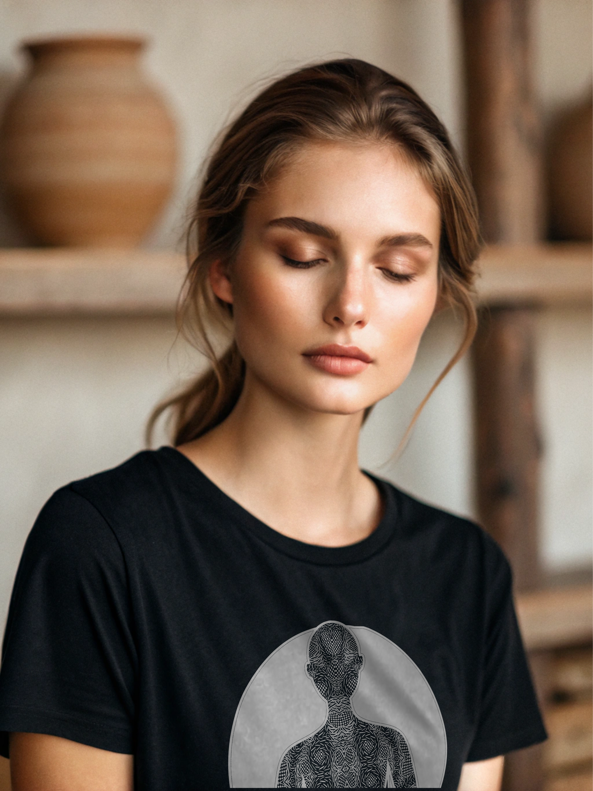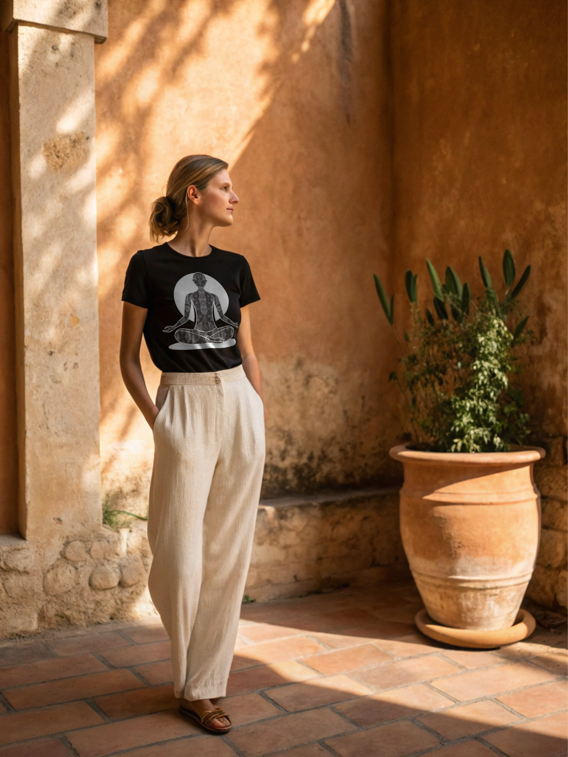 This airy white tee is anchored by a serene figure in meditation — etched with traditional detailing that speaks of balance, clarity, and soul. For women who choose silence as strength and introspection as guidance.