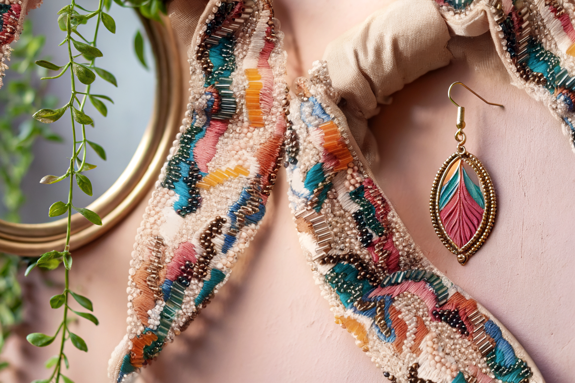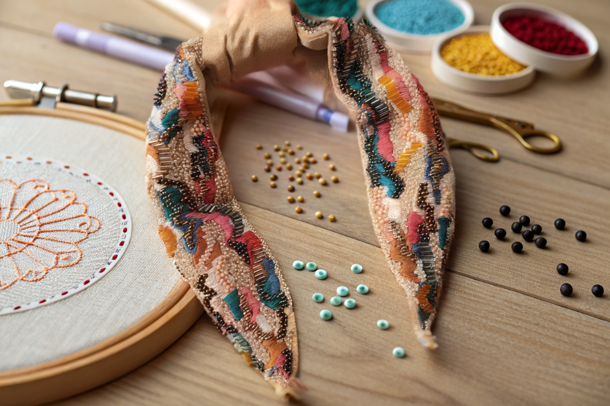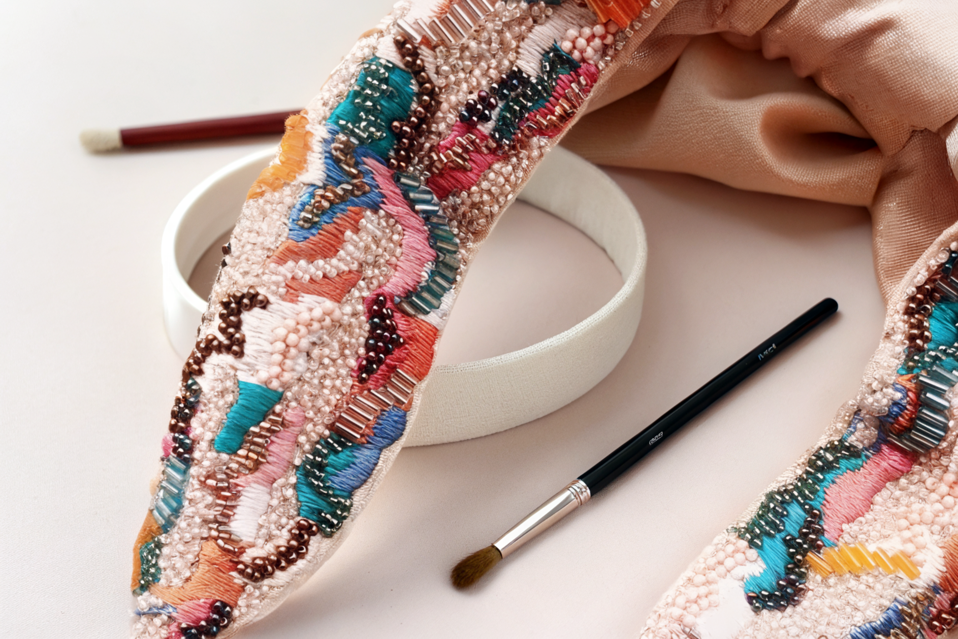 A riot of color, crafted with soul. This hand-embroidered headband is an ode to joy — where every bead, thread, and stitch tells a story. Designed to add a playful pop to quiet outfits, it’s equal parts art piece and everyday companion.