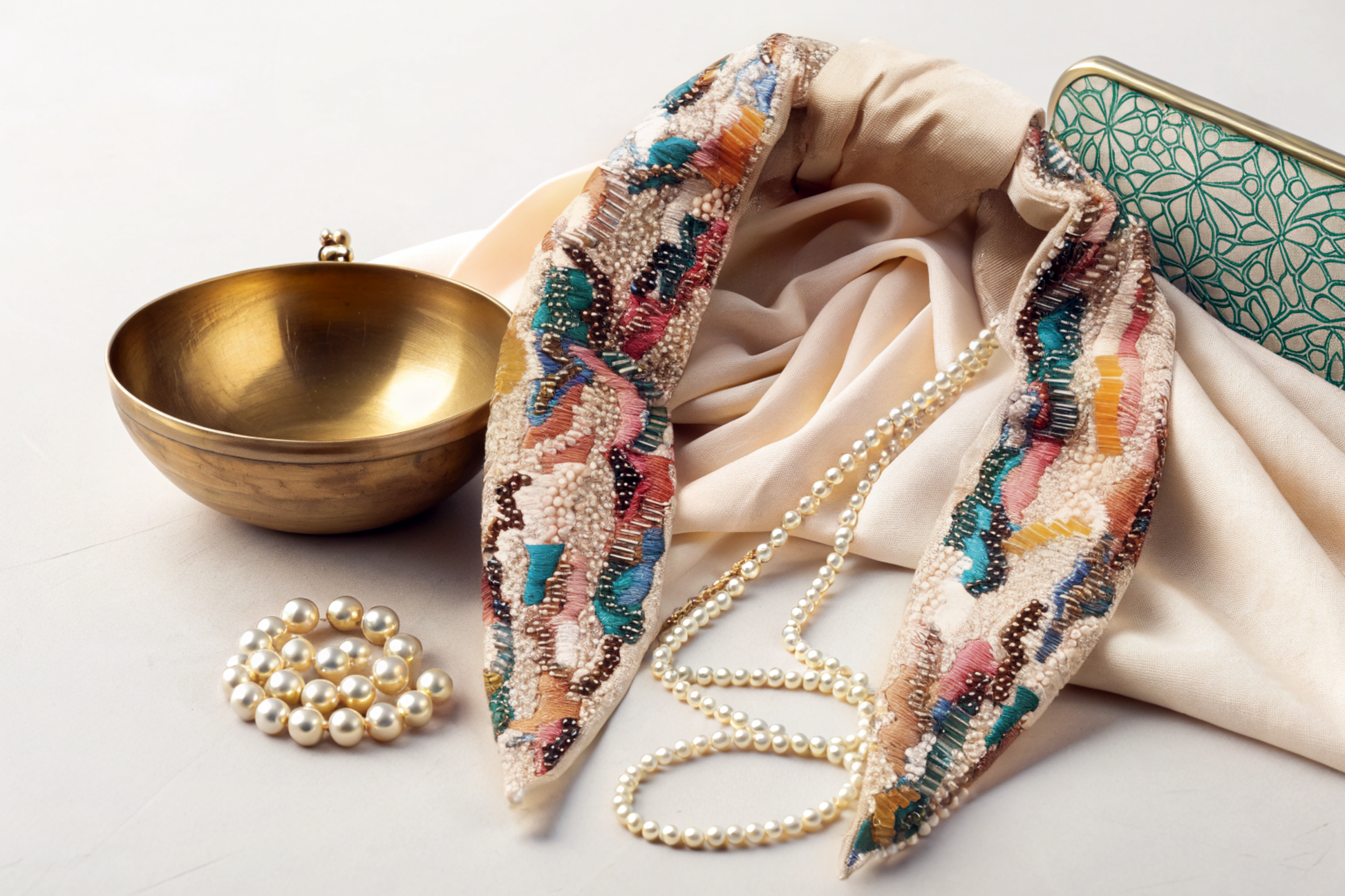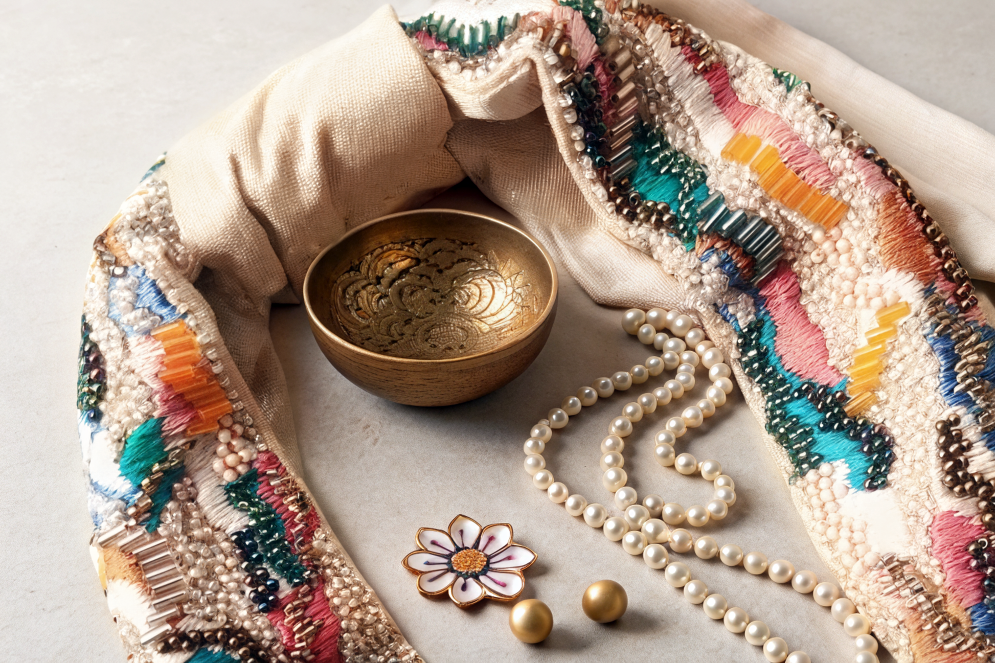 Hand-embroidered with multicolored threads, beads & glass tubes