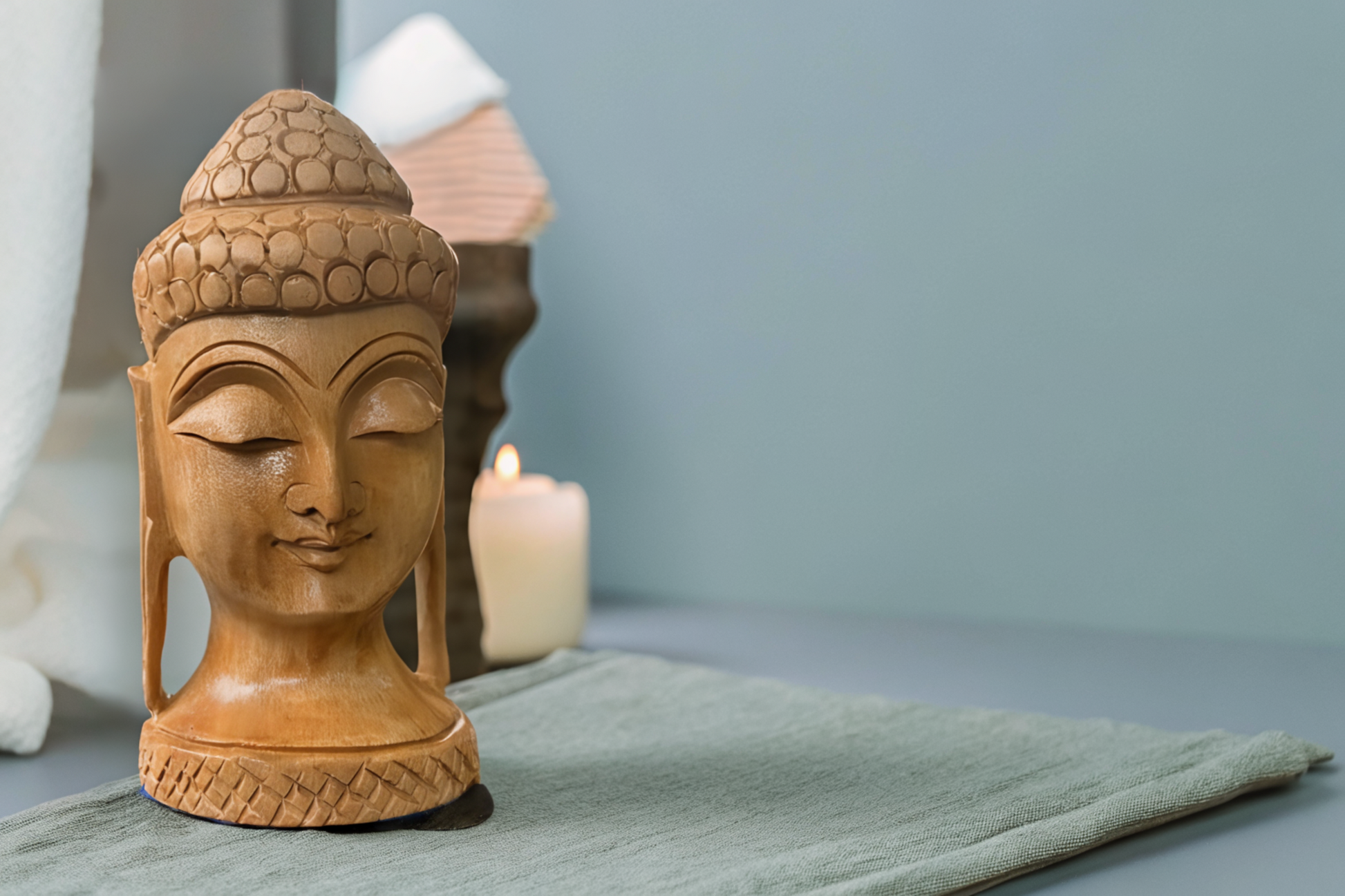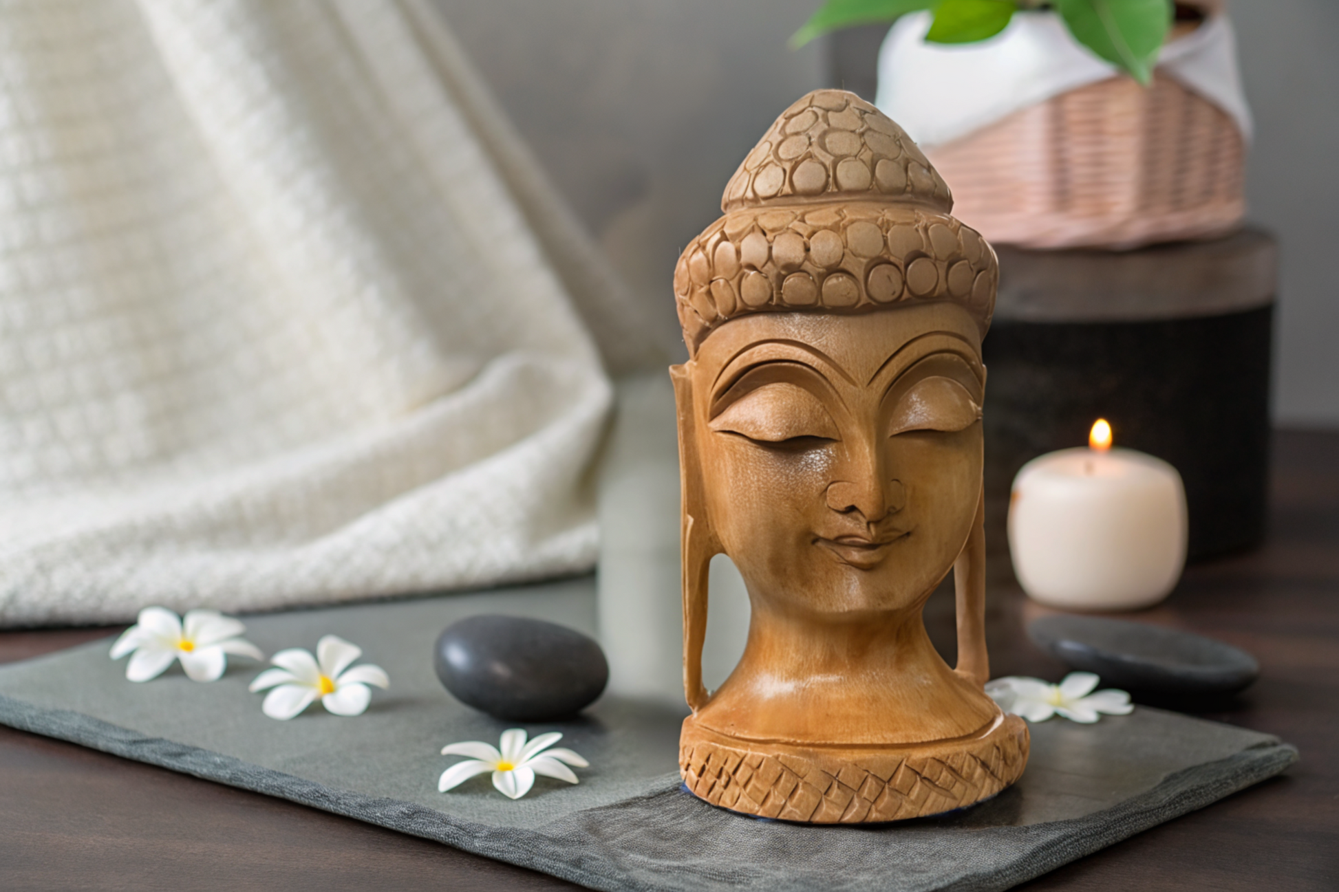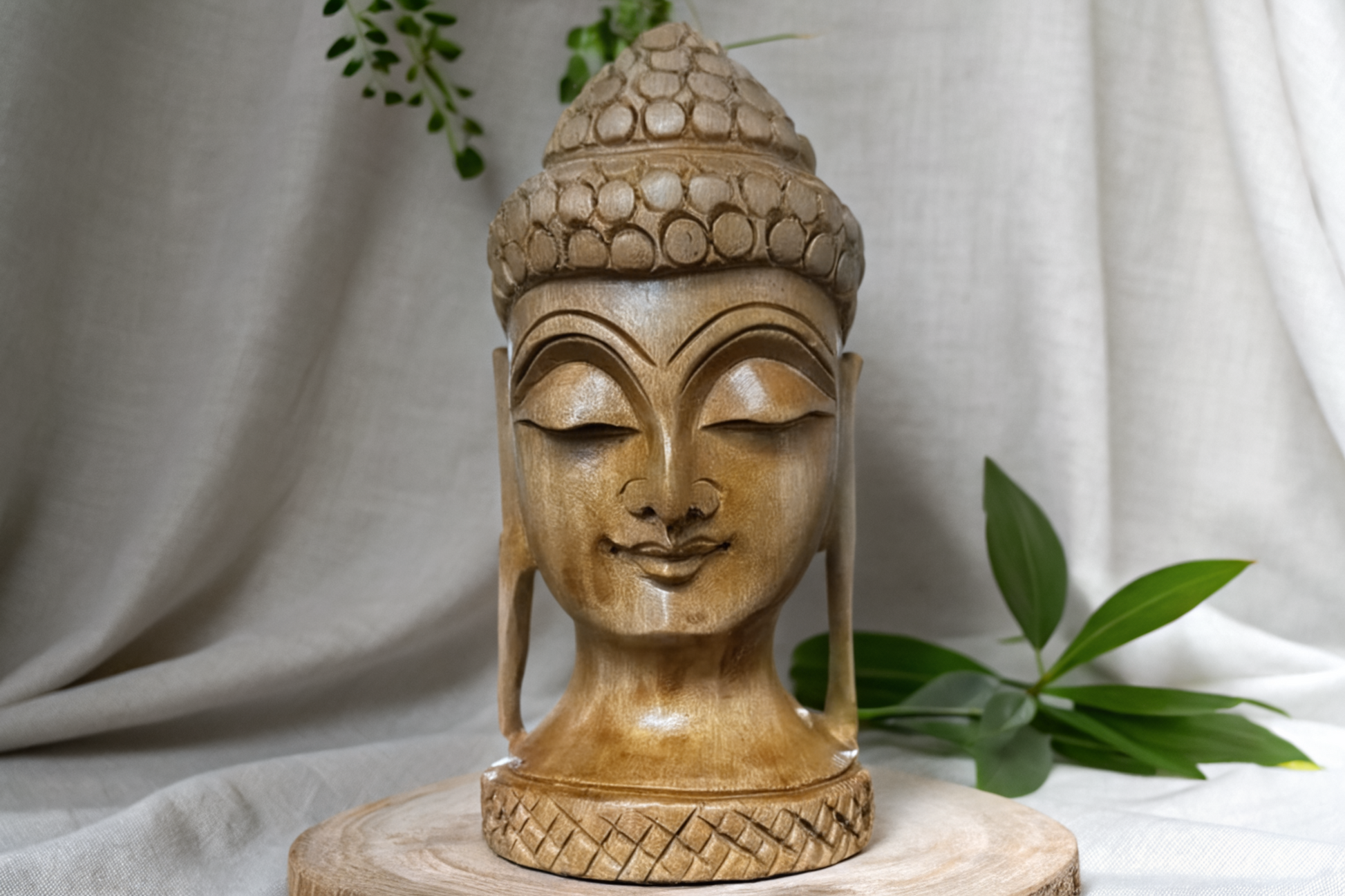 This hand-carved wooden Buddha bust exudes peace with every contour. With eyes gently closed and a soft, knowing smile, this sculpture is a reminder to look inward — to slow down, reflect, and rest in presence.