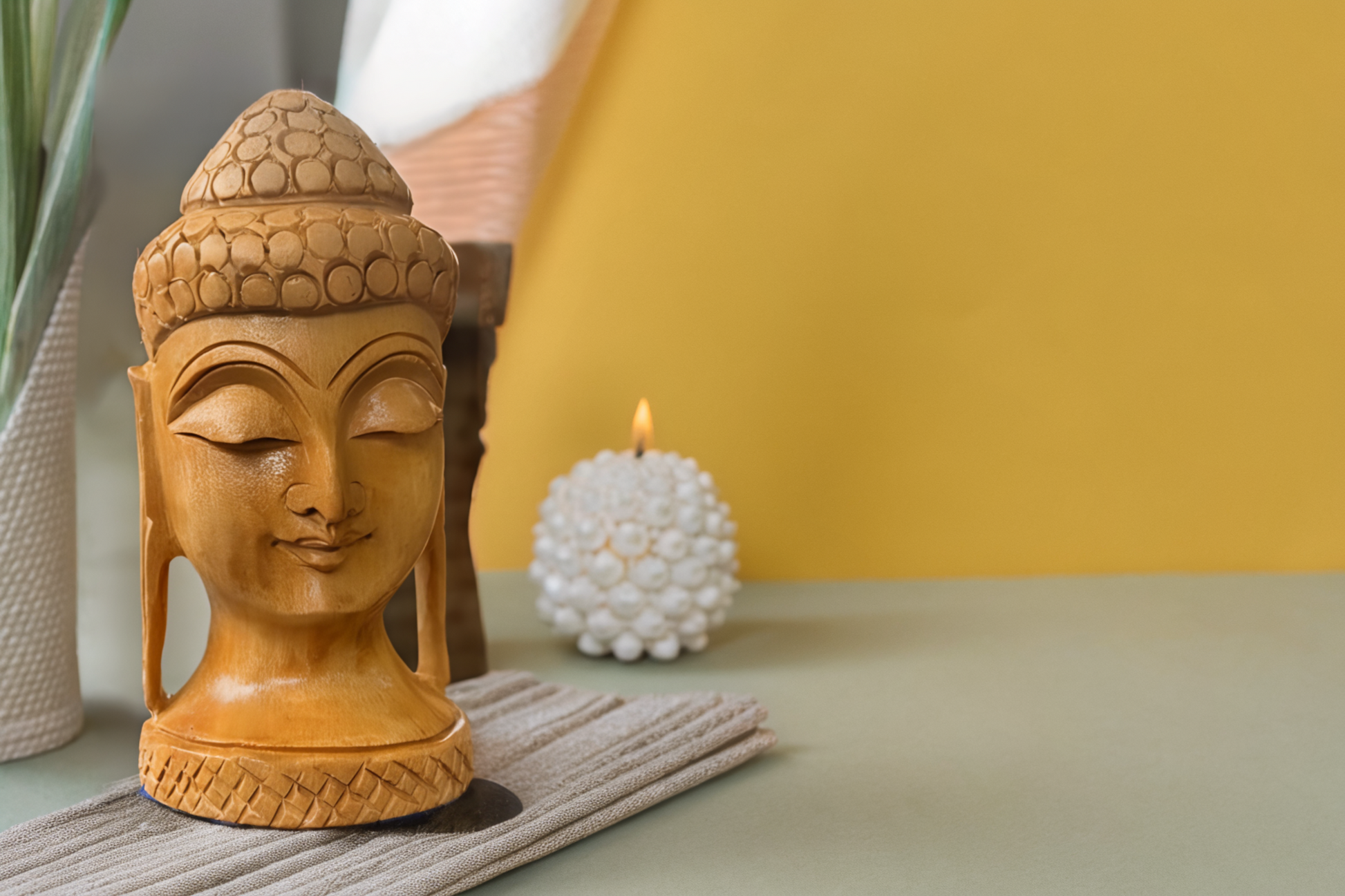 Crafted from warm natural wood, the grain glows under soft light, and the textured hair curls and elongated earlobes reflect timeless symbolism. Whether it's placed on a shelf, altar, or side table, it invites quietude into every corner it touches.